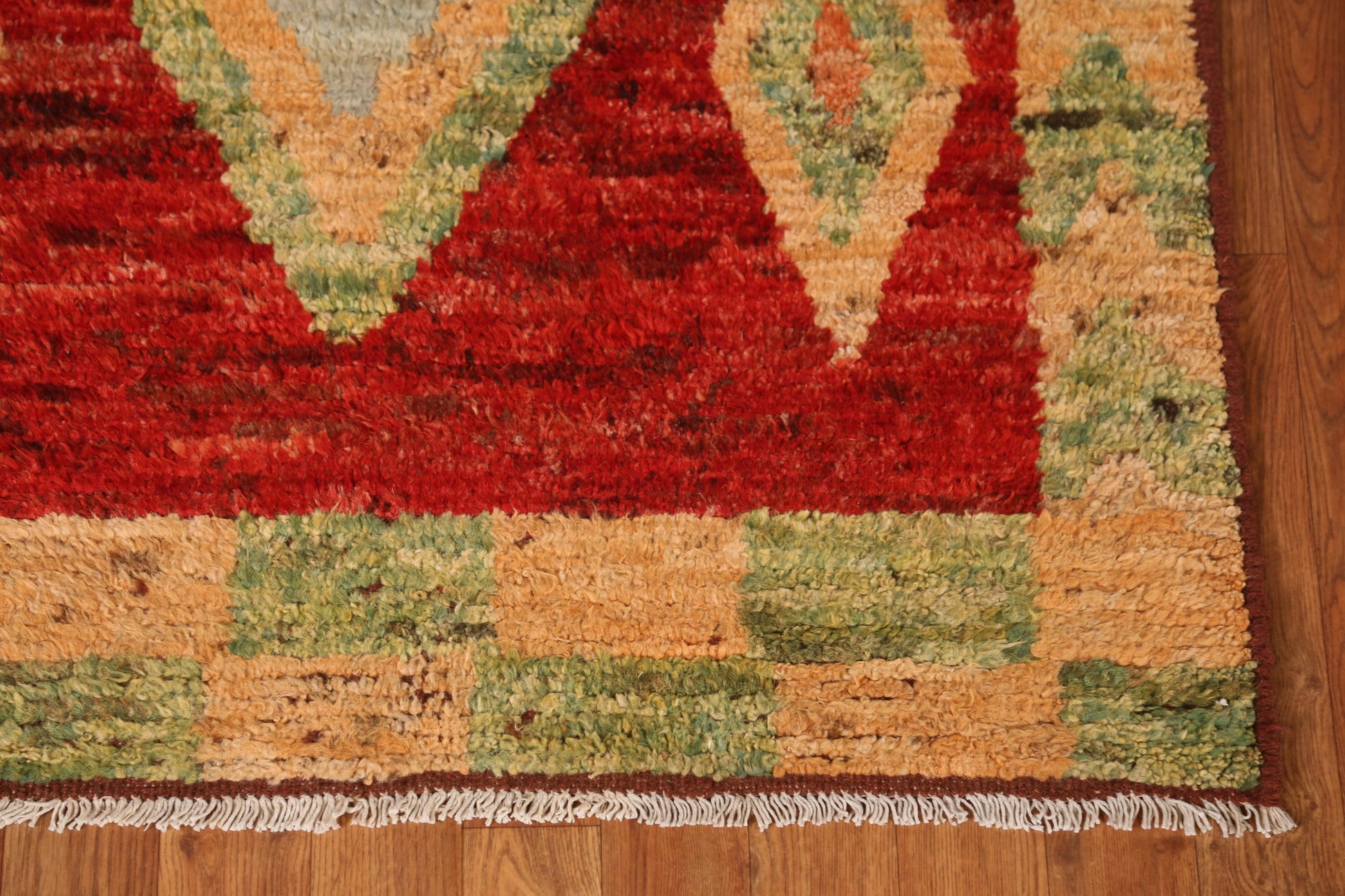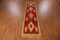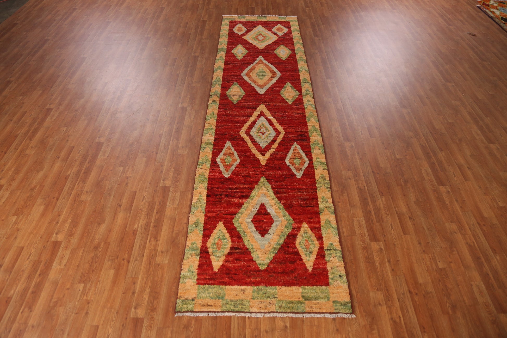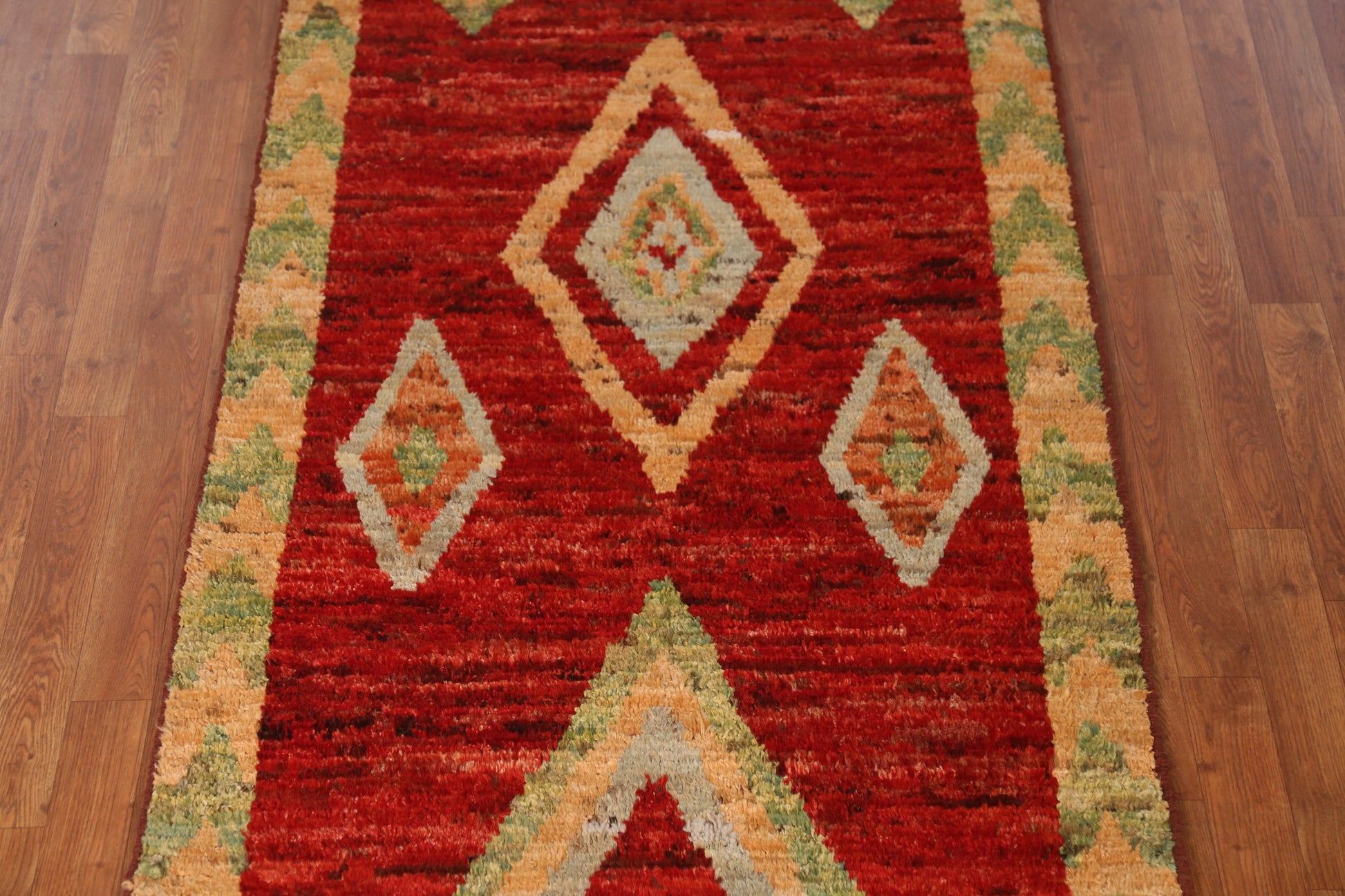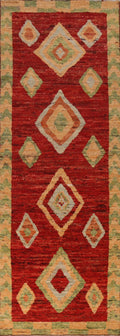 A Beautiful Genuine Pakistan Moroccan rug is Hand Knotted by skillful weavers in Pakistan with 100% Wool Material. This rug is in New, First Quality condition. dimensions are 13' 5'' X 3' 6'' in foot and 409 X 107 in centimeter. the primary color is Red.