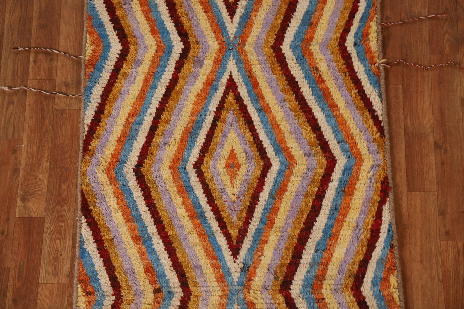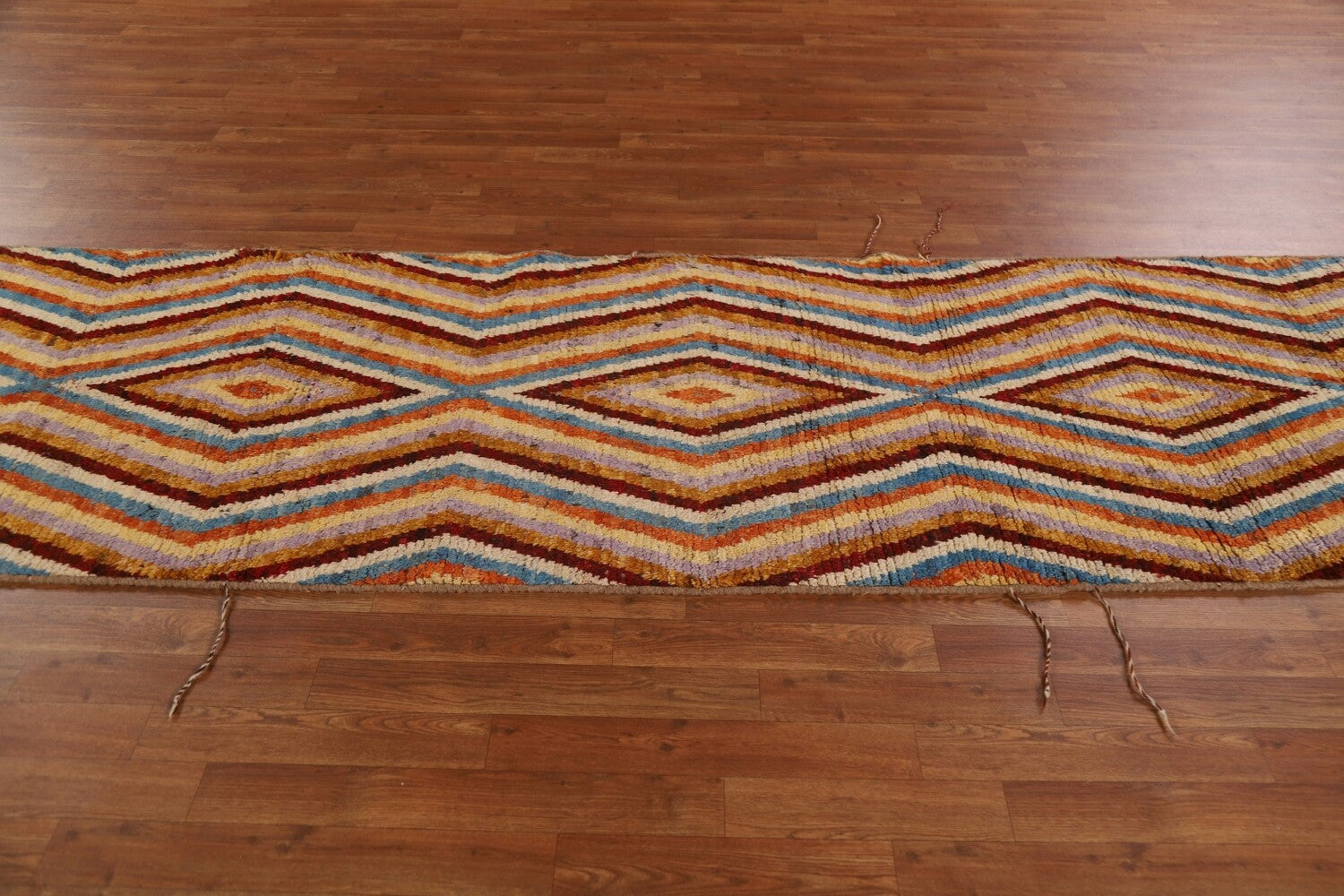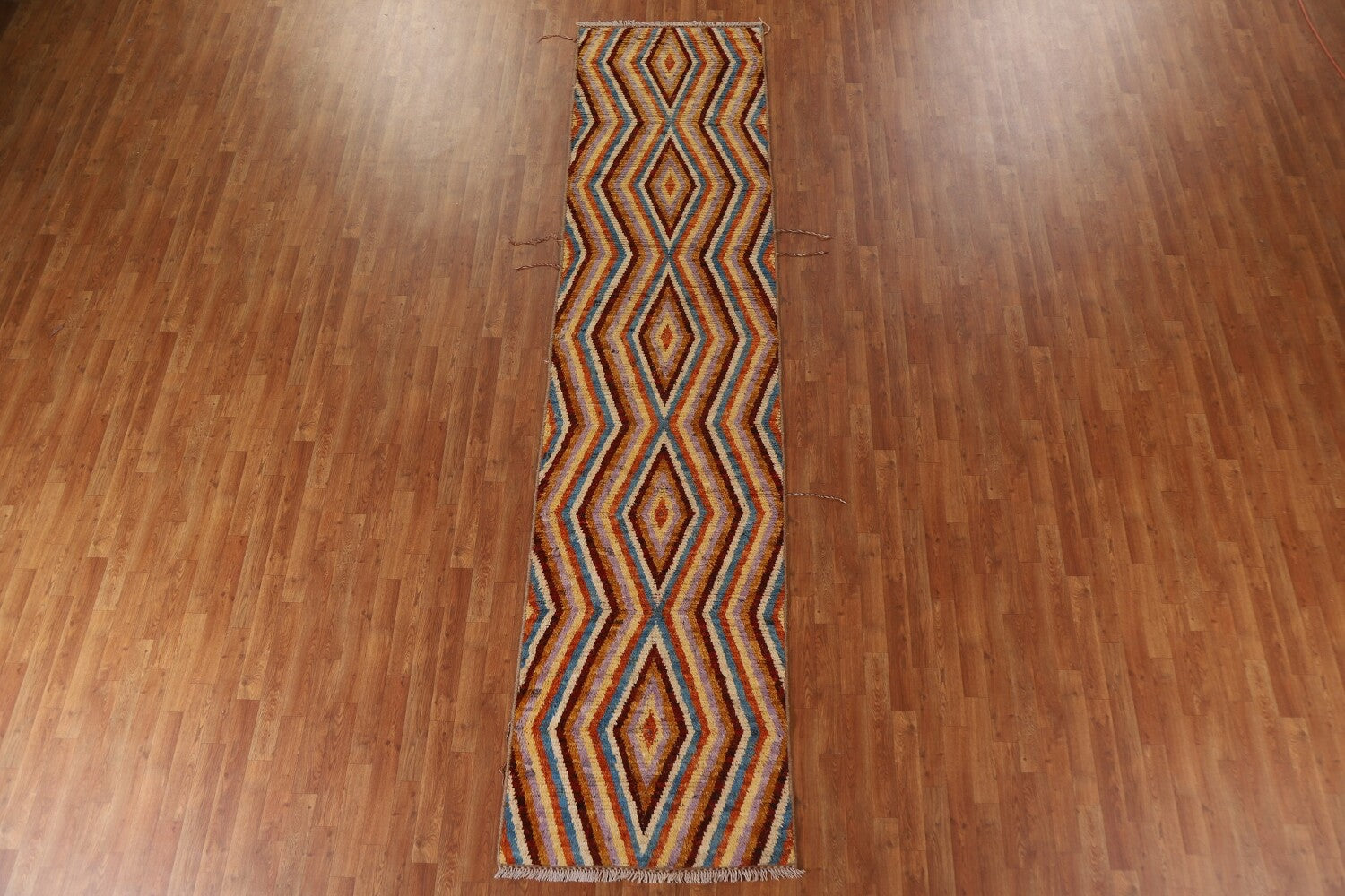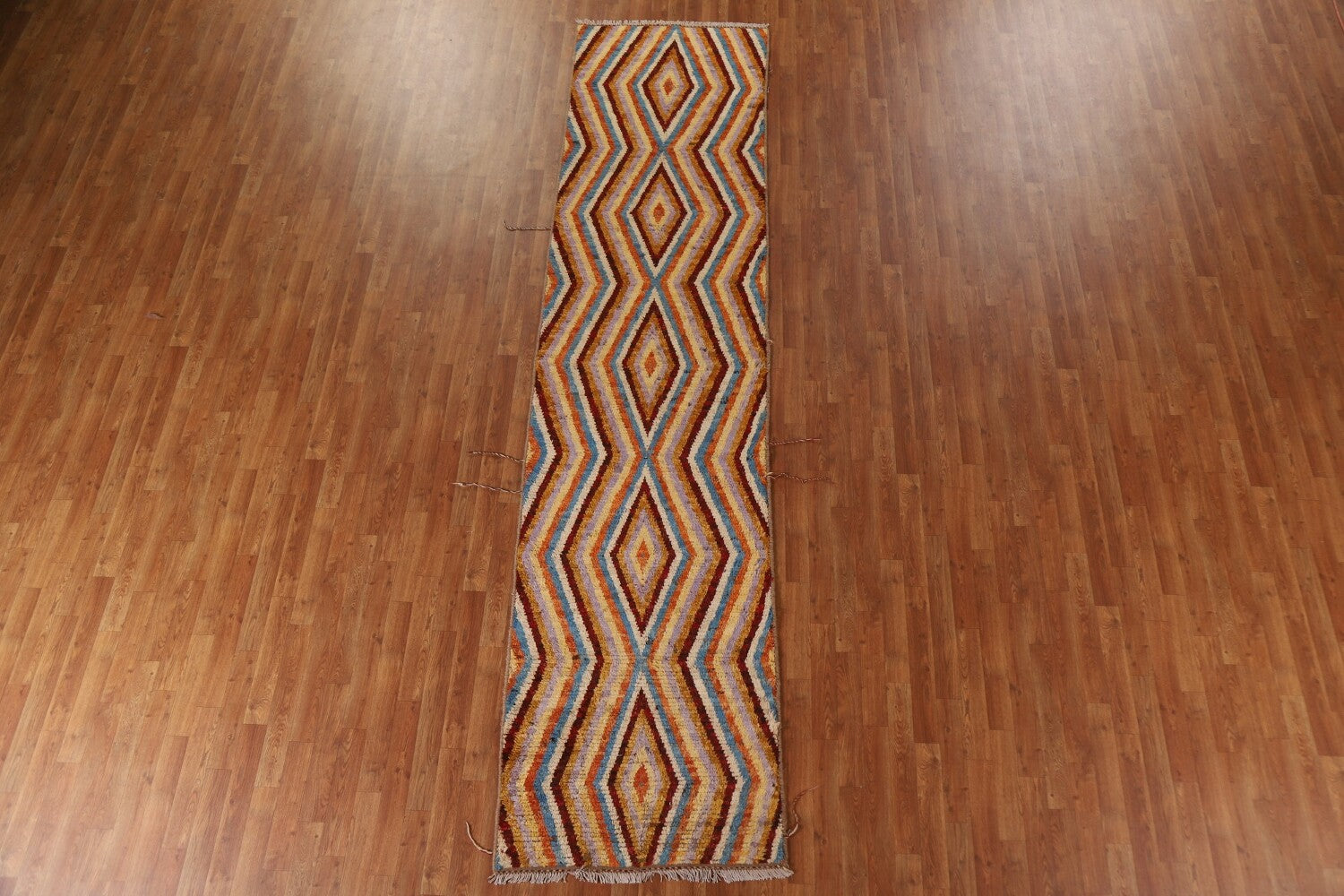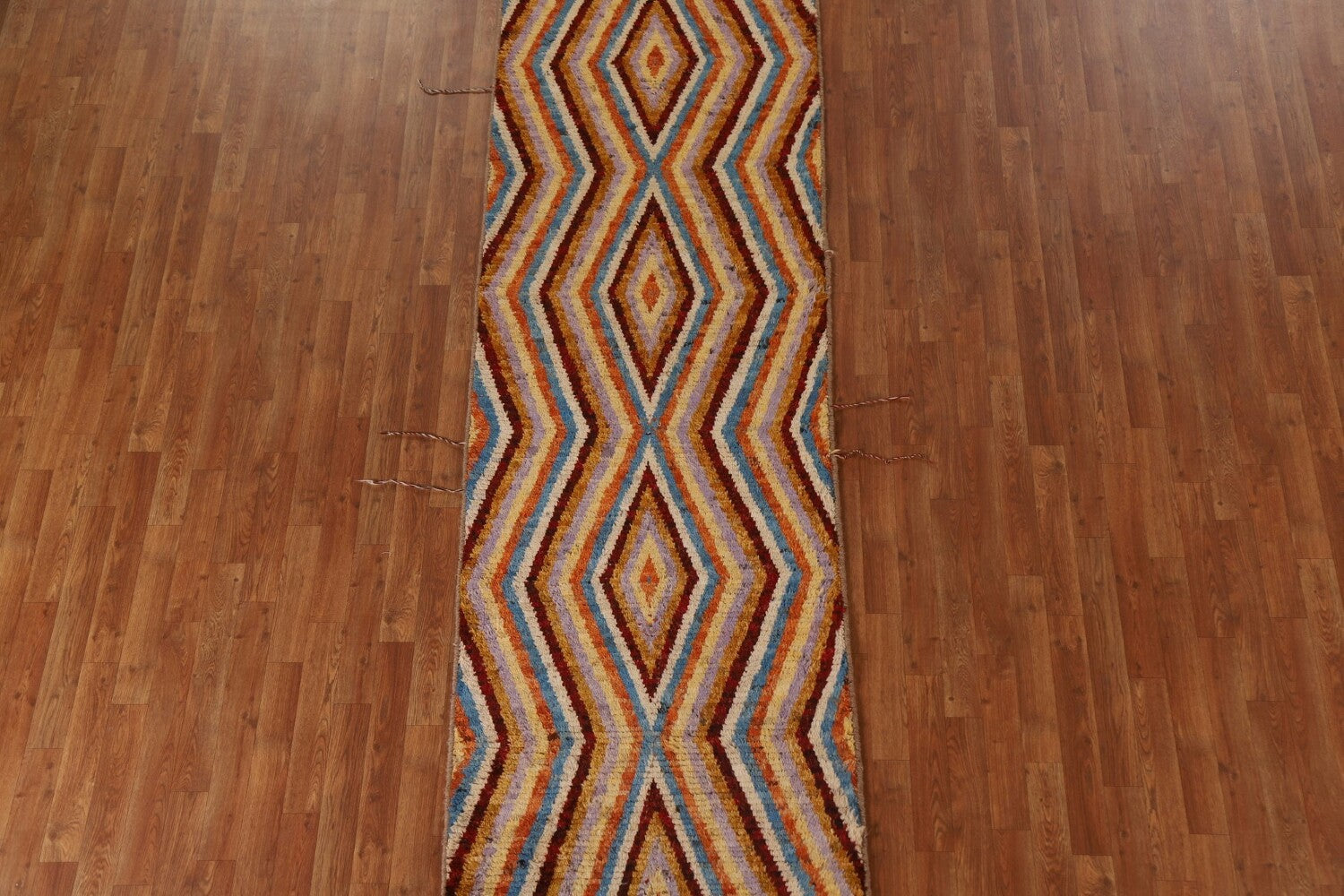 A Beautiful Genuine Pakistan Moroccan rug is Hand Knotted by skillful weavers in Pakistan with 100% Wool Material. This rug is in condition. dimensions are 12' 9'' X 3' 0'' in foot and 389 X 91 in centimeter. the primary color is Multi-Colored.