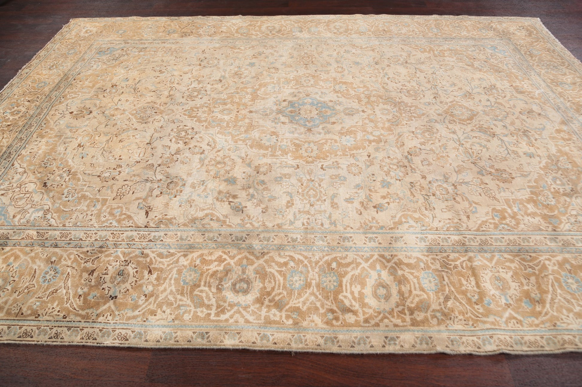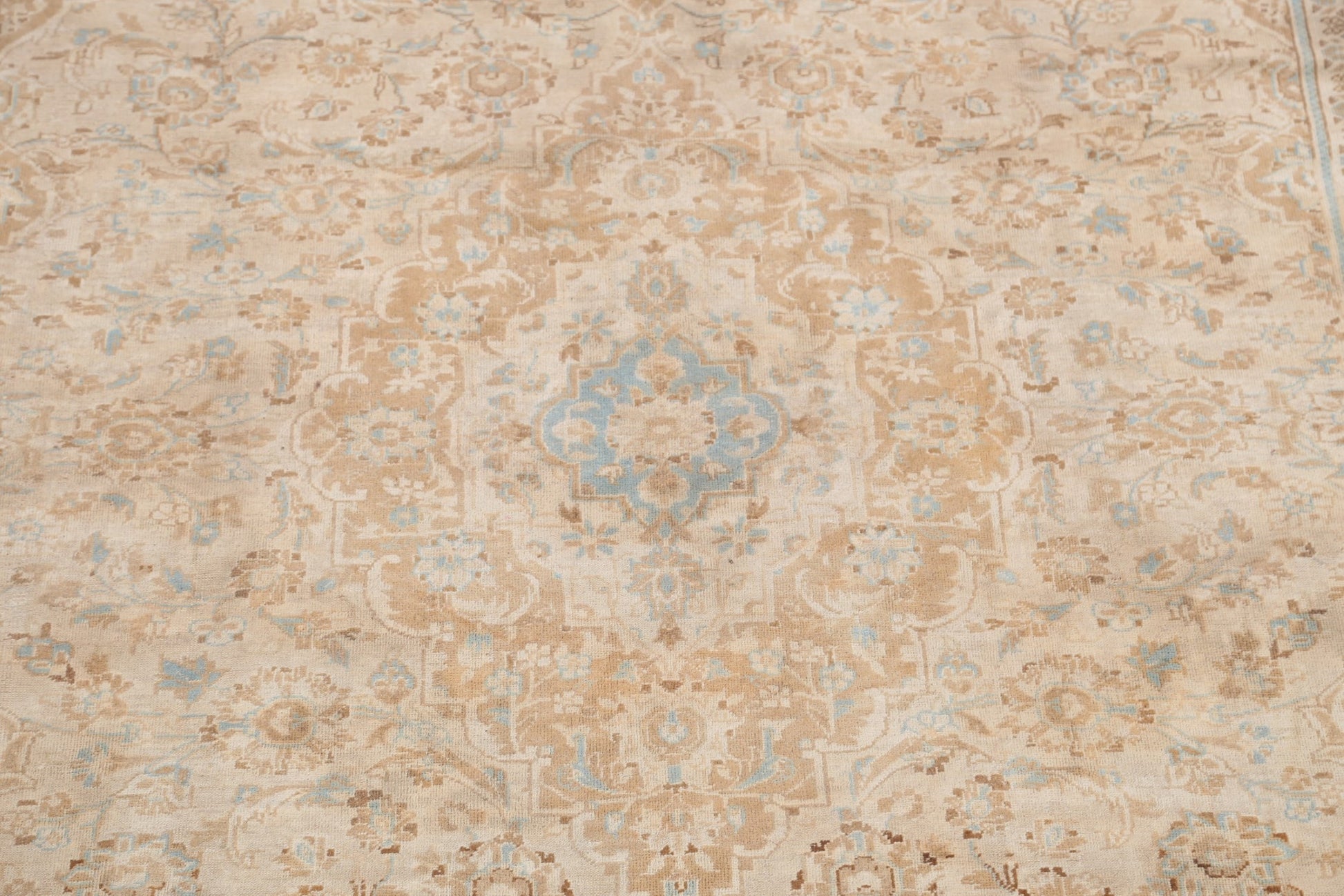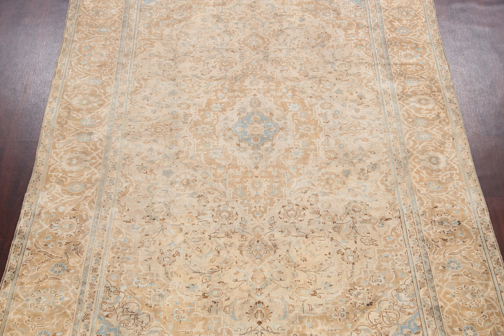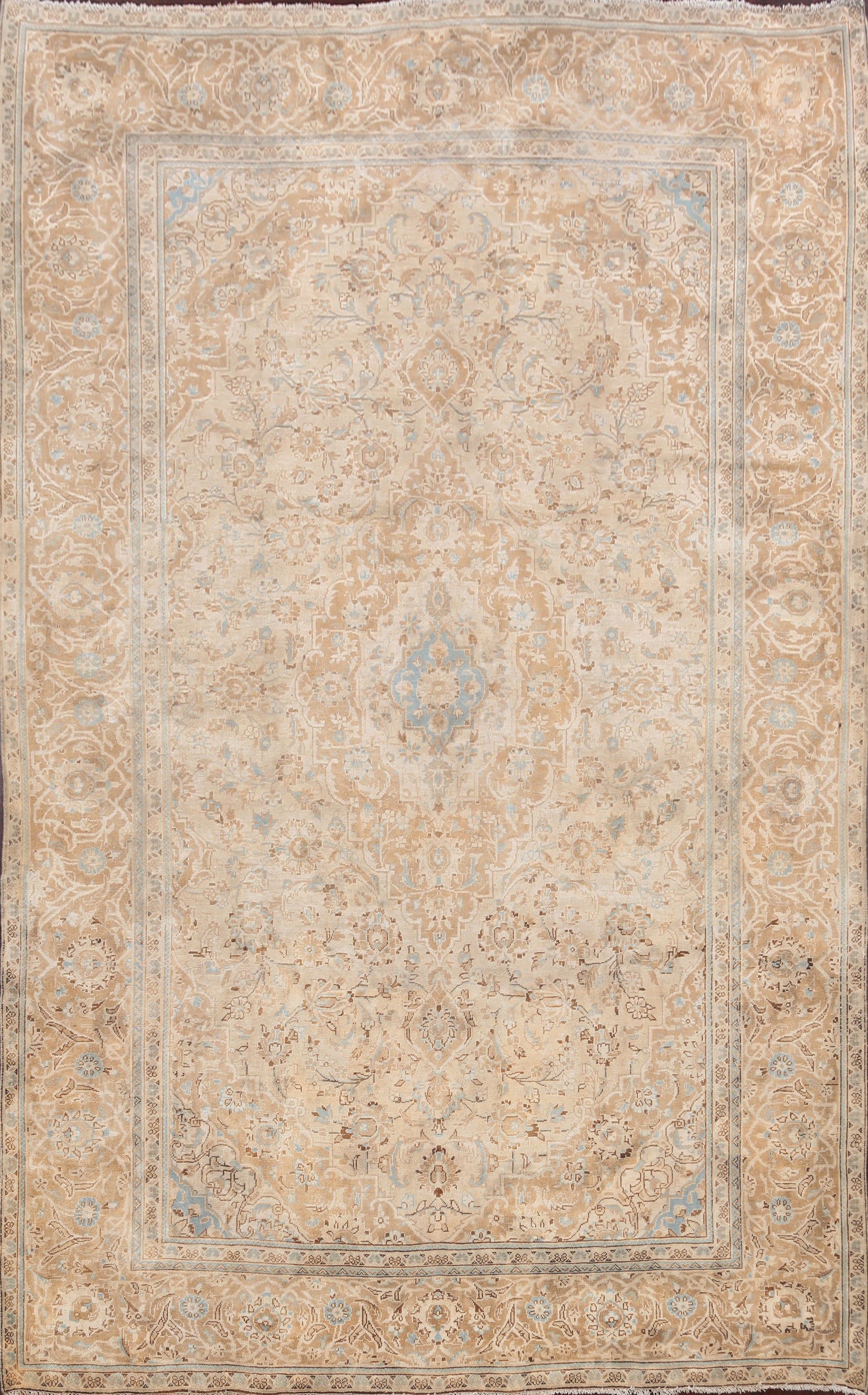 A Beautiful Genuine Persia ( Persia ) Kashan rug is Hand Knotted by skillful weavers in Persia ( Persia ) with 100% Wool Material. This rug is in Very Good (Evenly Low Pile) condition. dimensions are 10' 6'' X 7' 9'' in foot and 320 X 236 in centimeter. the primary color is Beige & Ivories.