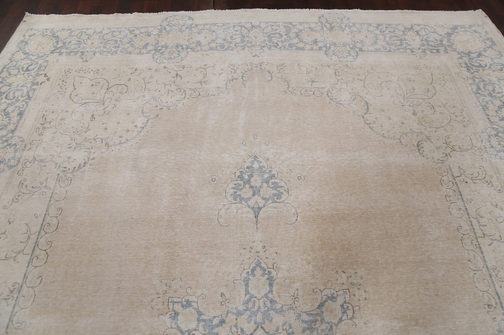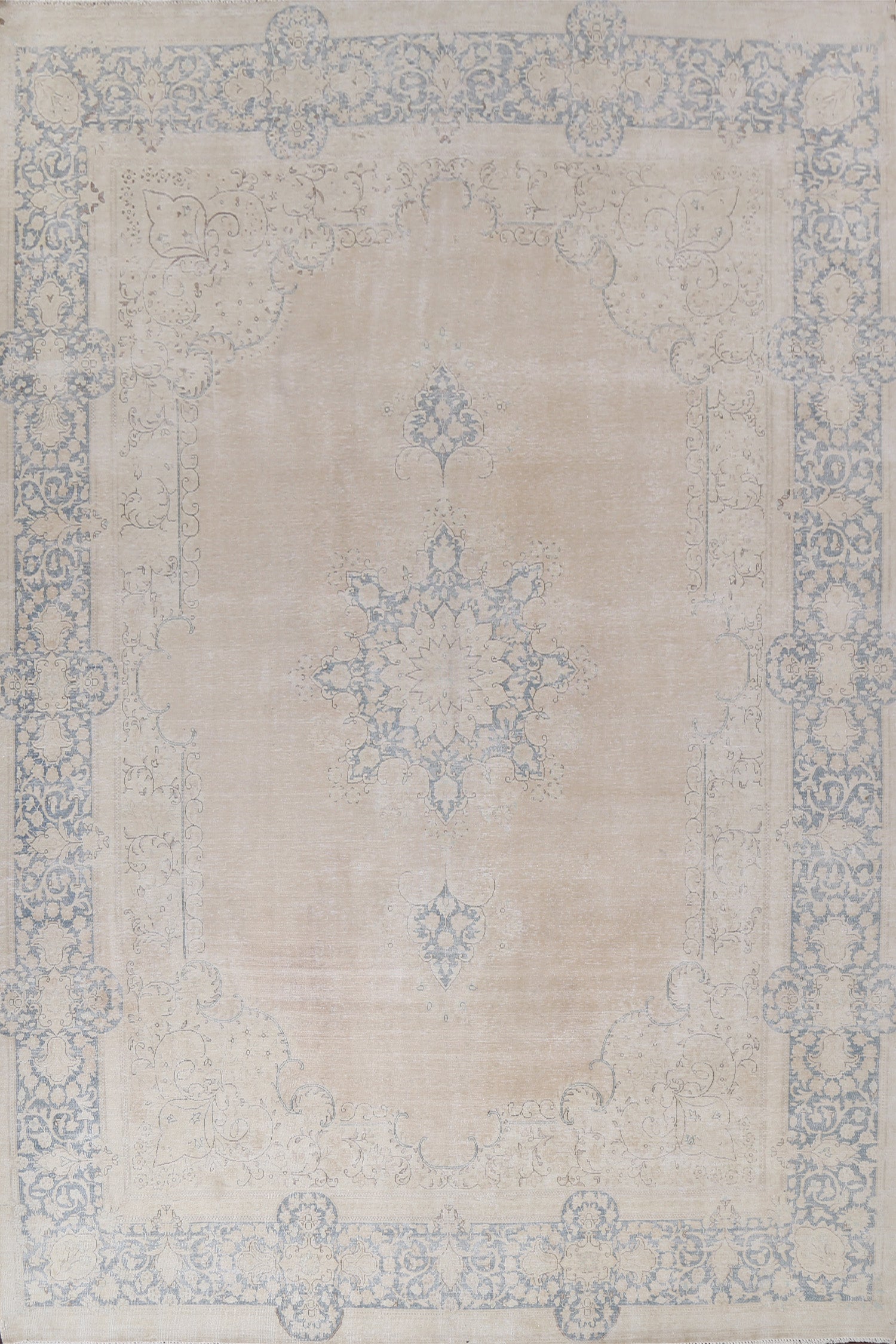 A Beautiful Genuine Persia ( Persia ) Kerman rug is Hand Knotted by skillful weavers in Persia ( Persia ) with 100% Wool Material. This rug is in Very Good (Evenly Low Pile) condition. dimensions are 13' 2'' X 9' 3'' in foot and 401 X 282 in centimeter. the primary color is Beige & Ivories.