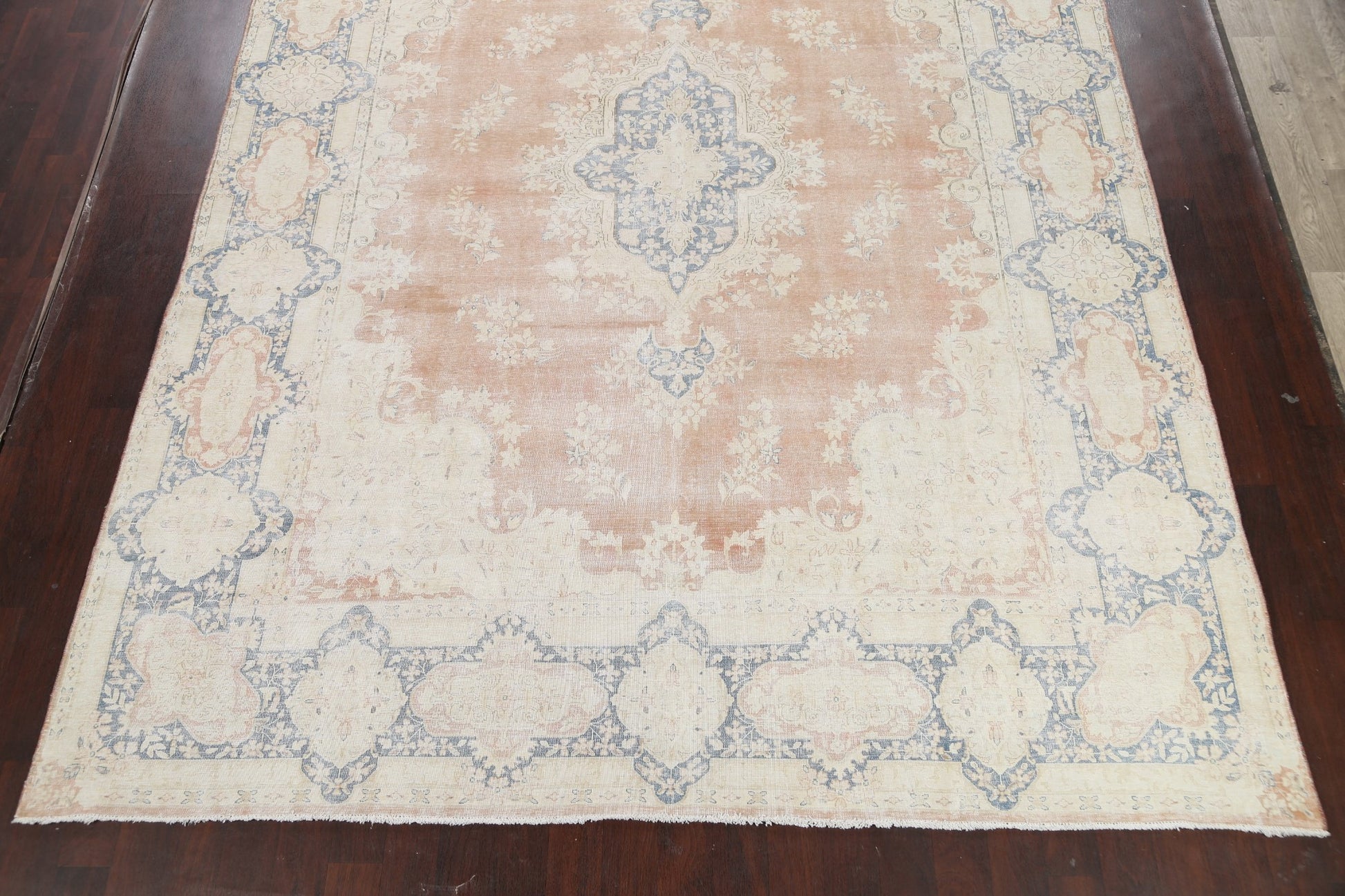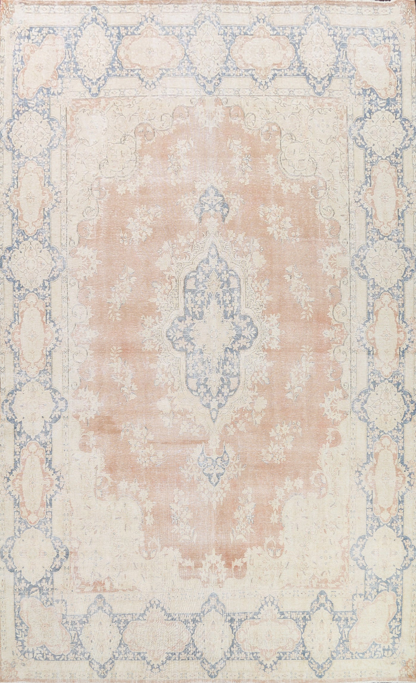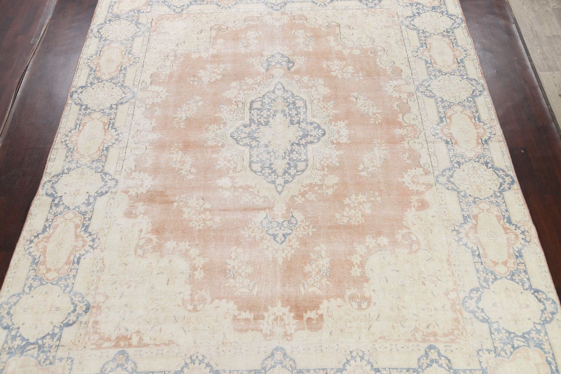 A Beautiful Genuine Persia ( Persia ) Kerman rug is Hand Knotted by skillful weavers in Persia ( Persia ) with 100% Wool Material. This rug is in Very Good (Evenly Low Pile) condition. dimensions are 12' 9'' X 9' 9'' in foot and 389 X 297 in centimeter. the primary color is Peach.