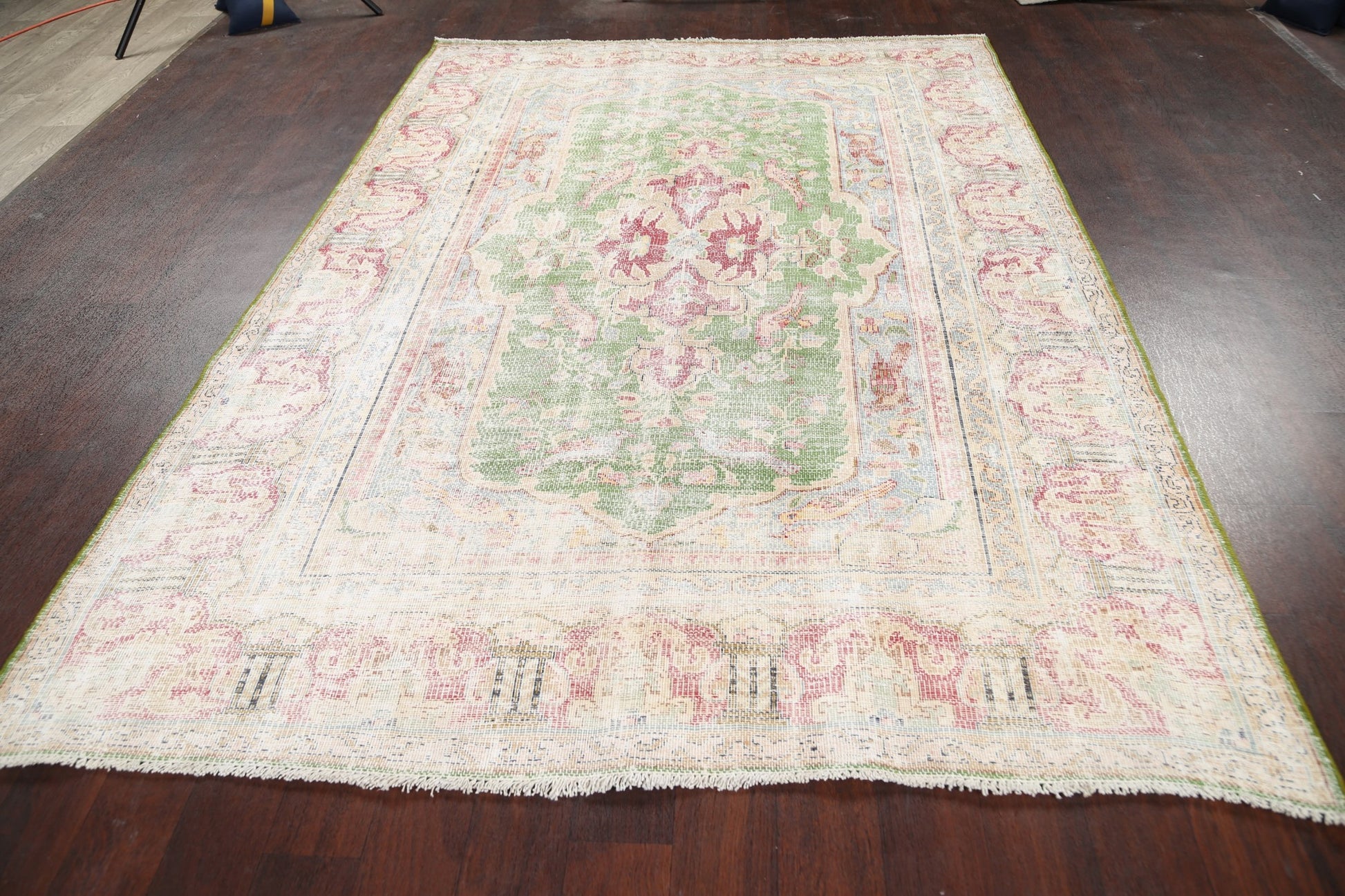 A Beautiful Genuine Persia ( Persia ) Kerman rug is Hand Knotted by skillful weavers in Persia ( Persia ) with 100% Wool Material. This rug is in Very Good (Evenly Low Pile) condition. dimensions are 8' 5'' X 6' 0'' in foot and 257 X 183 in centimeter. the primary color is Green.