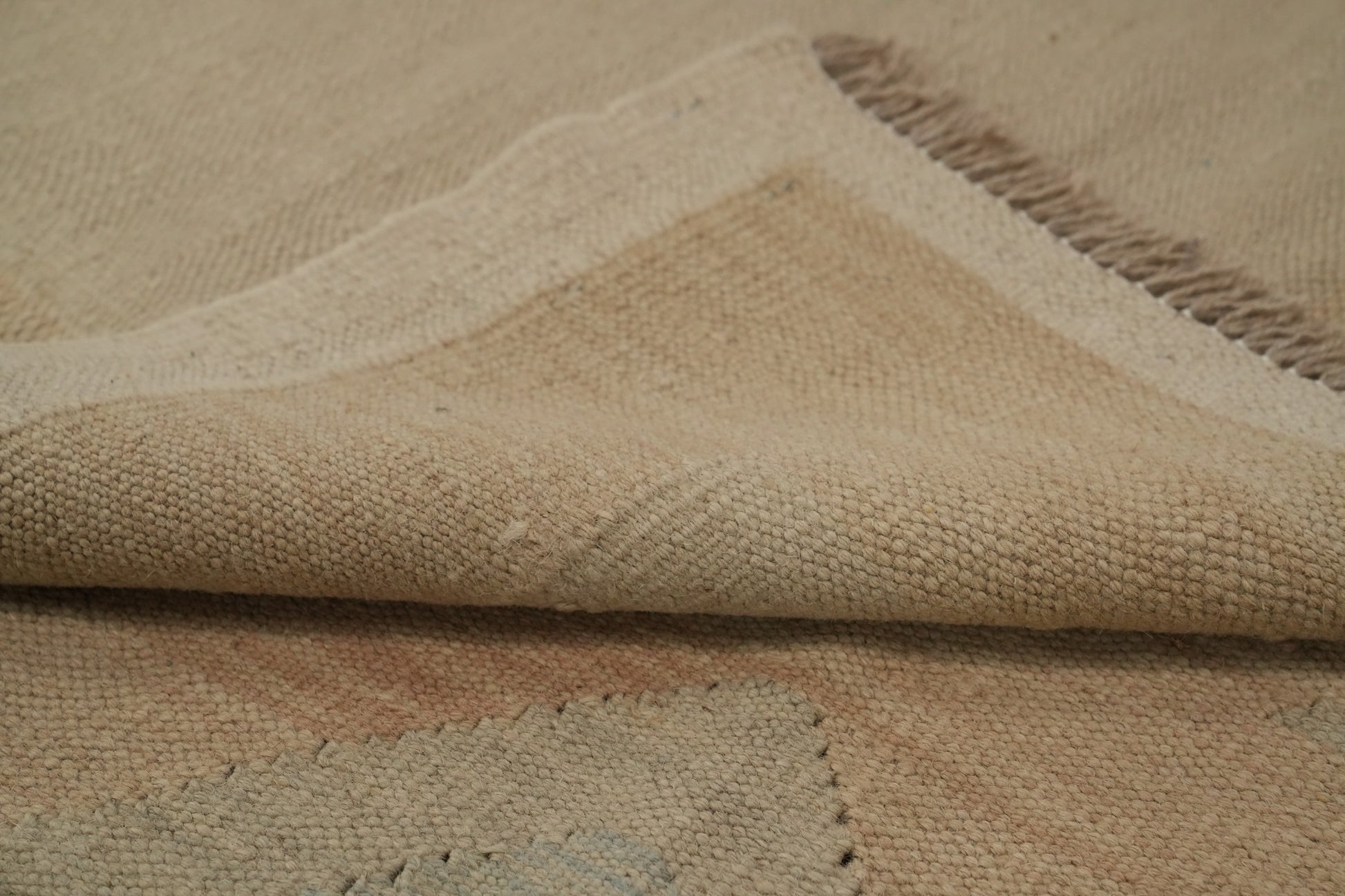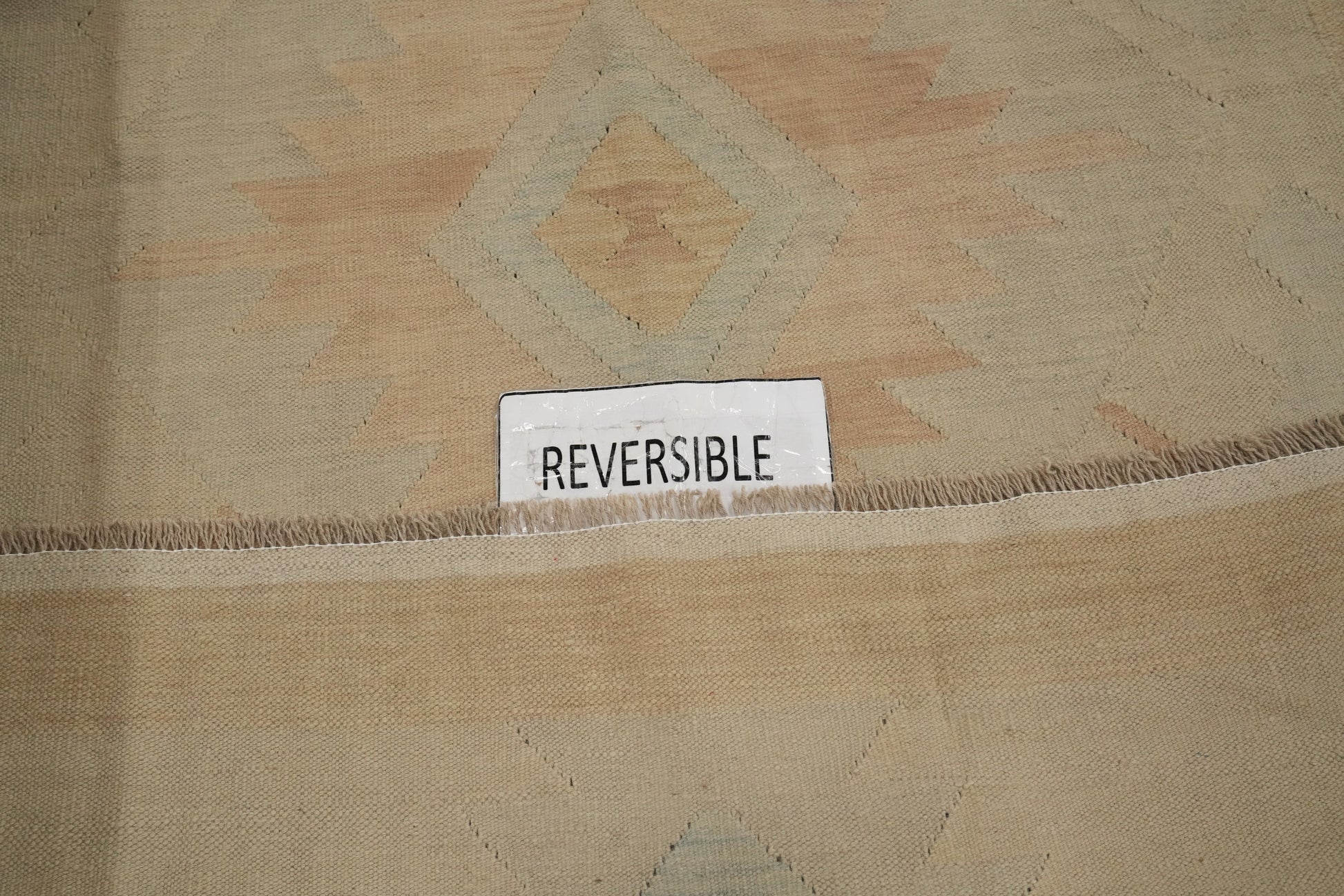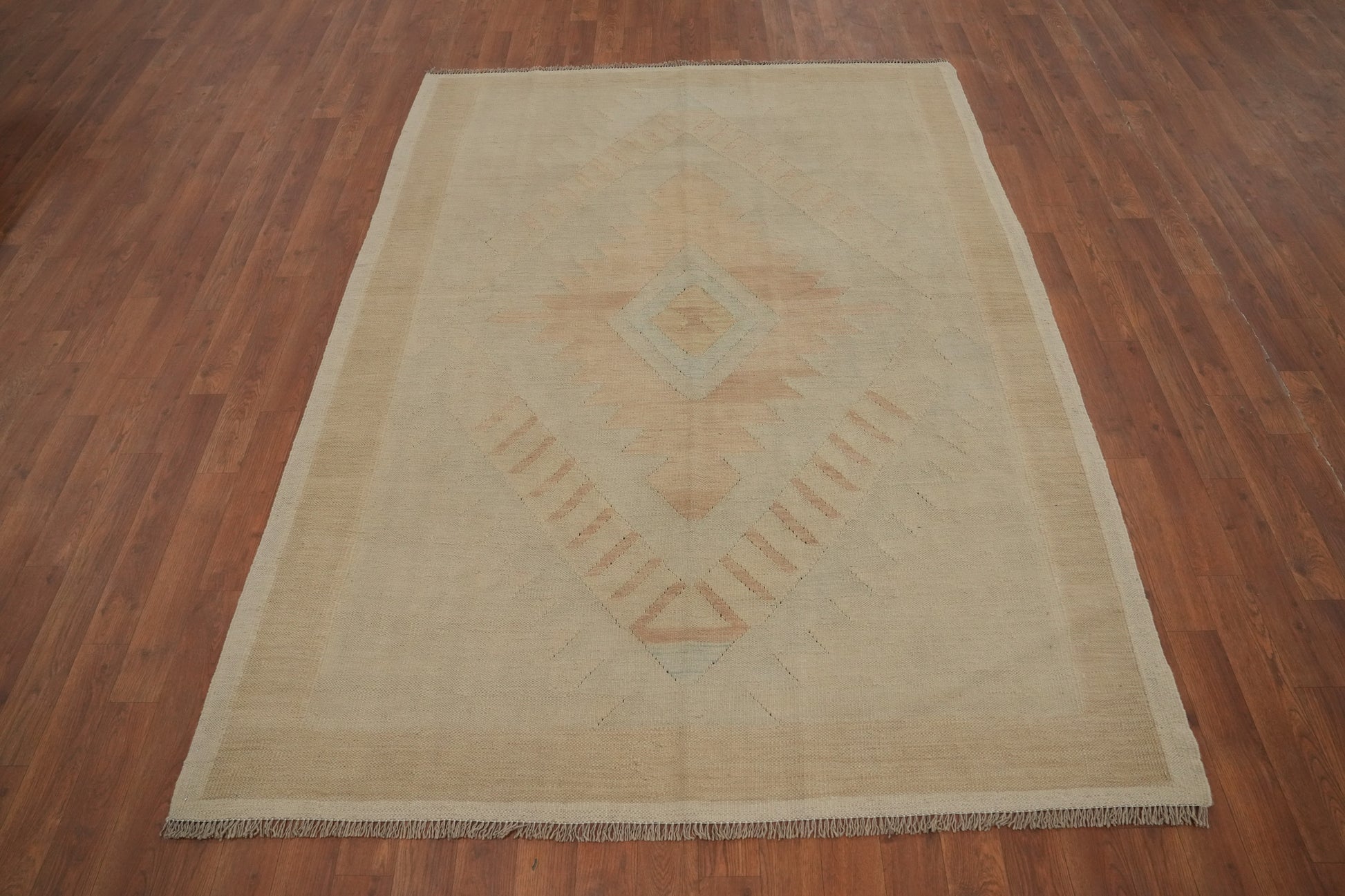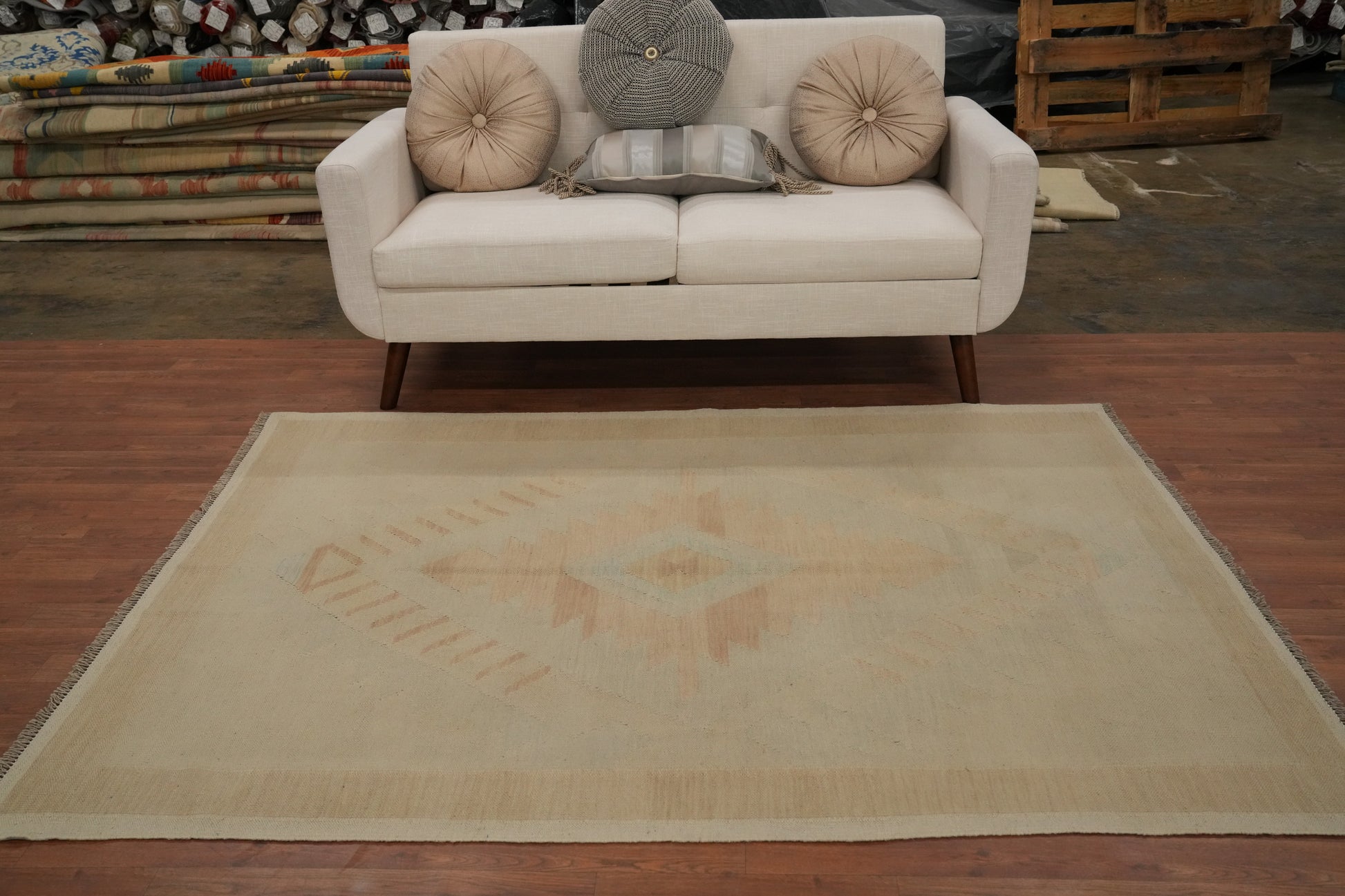 A Beautiful Genuine Pakistan Kilim rug is Hand Woven by skillful weavers in Pakistan with 100% Wool Material. This rug is in New, First Quality condition. dimensions are 6' 7'' X 4' 11'' in foot and 201 X 150 in centimeter. the primary color is Beige & Ivories.