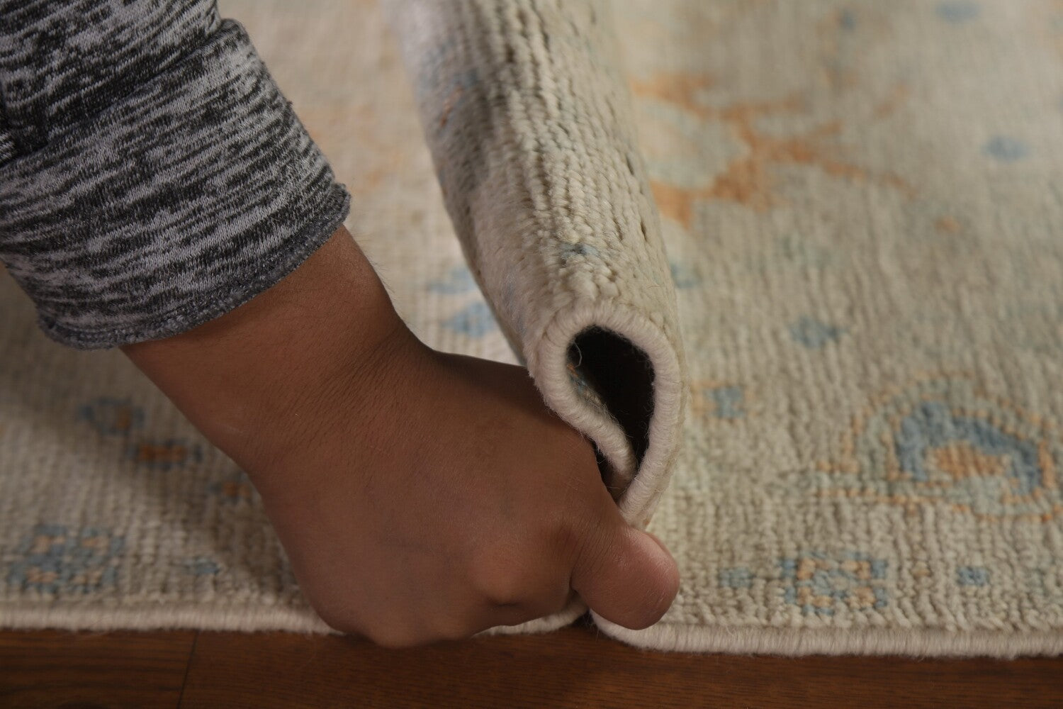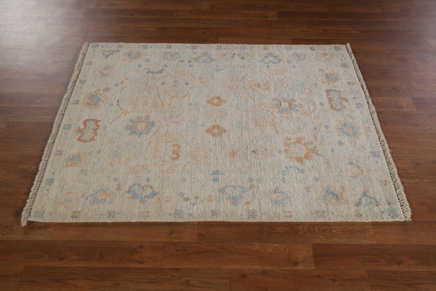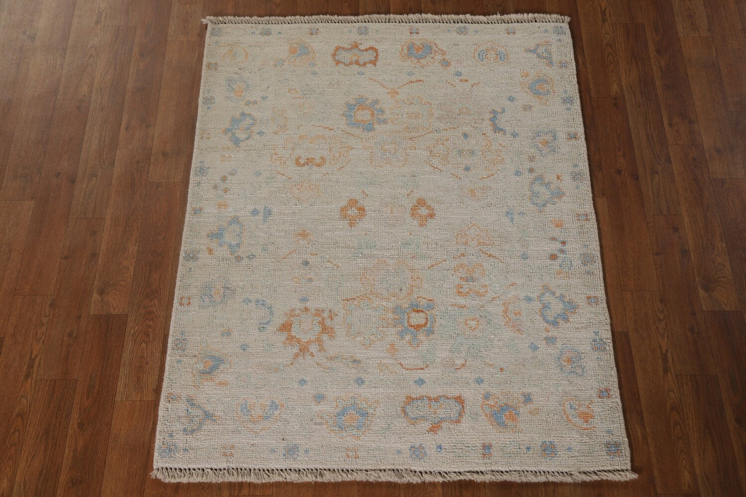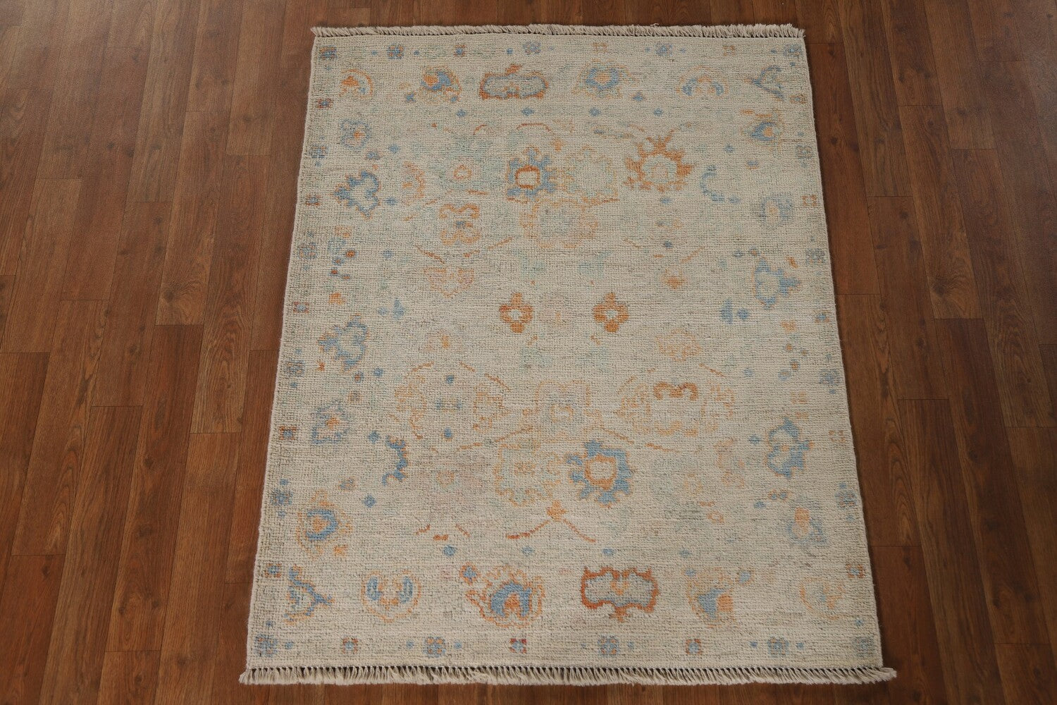 A Beautiful Genuine Turkey Oushak rug is Hand Knotted by skillful weavers in Turkey with 100% Wool Material. This rug is in New, First Quality condition. dimensions are 3' 11'' X 3' 1'' in foot and 119 X 94 in centimeter. the primary color is Beige & Ivories.
