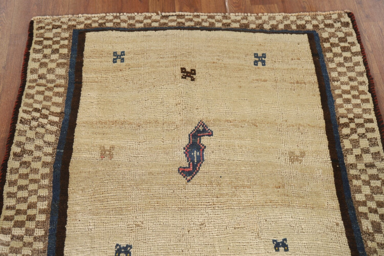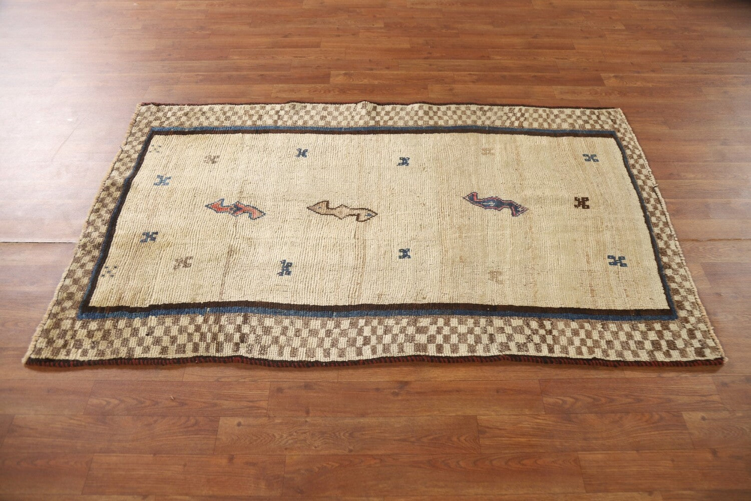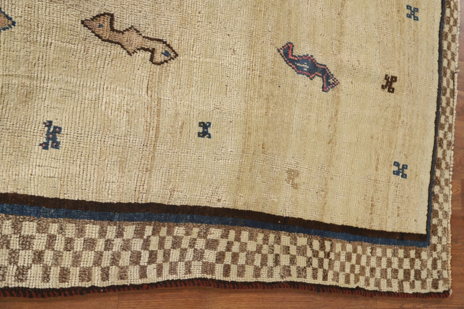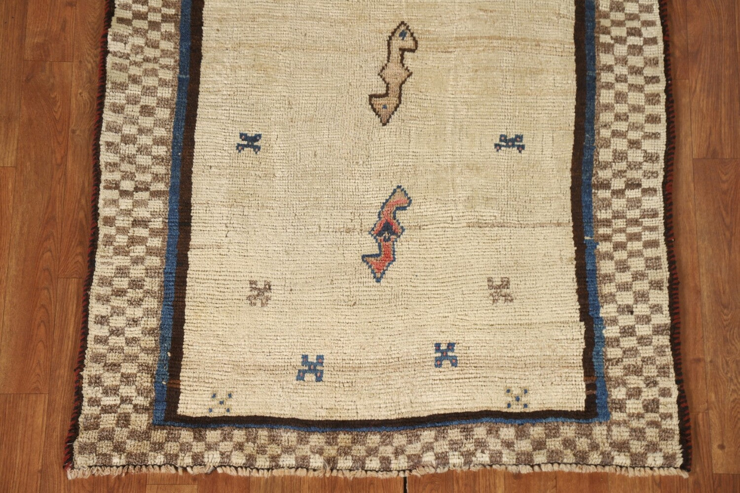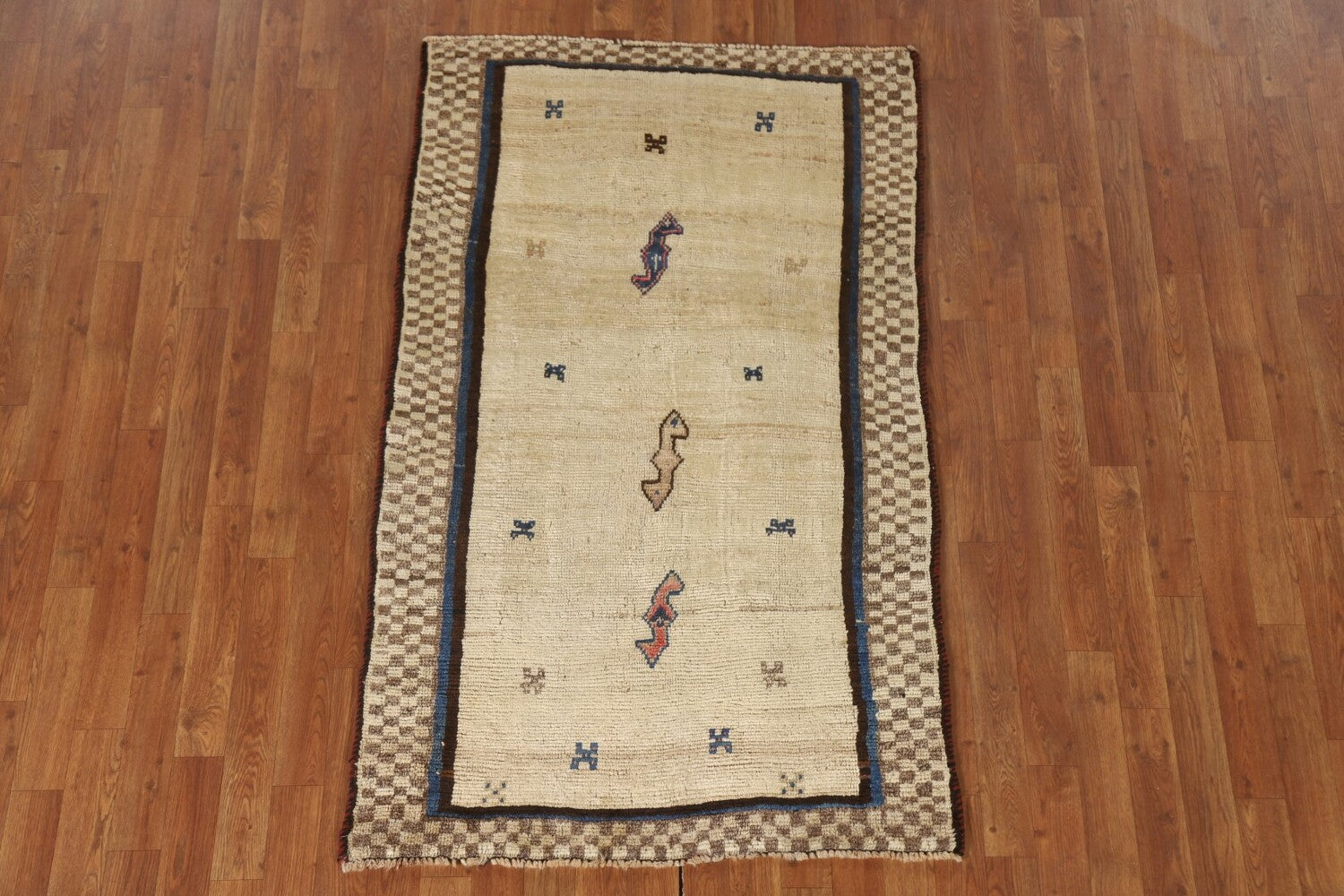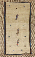 A Beautiful Genuine Persia ( Persia ) Gabbeh rug is Hand Knotted by skillful weavers in Persia ( Persia ) with 100% Wool Material. This rug is in Very Good condition. dimensions are 5' 5'' X 3' 3'' in foot and 165 X 99 in centimeter. the primary color is Beige & Ivories.