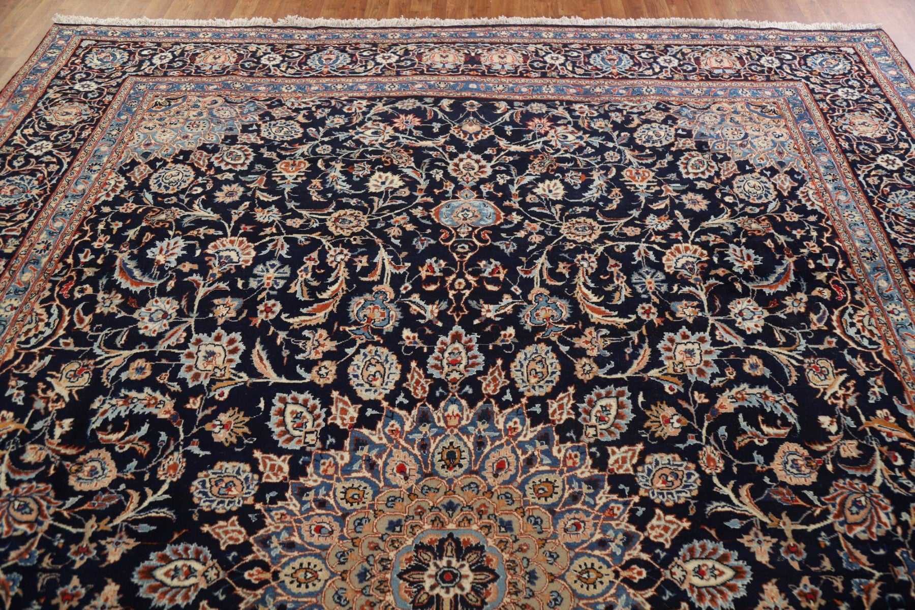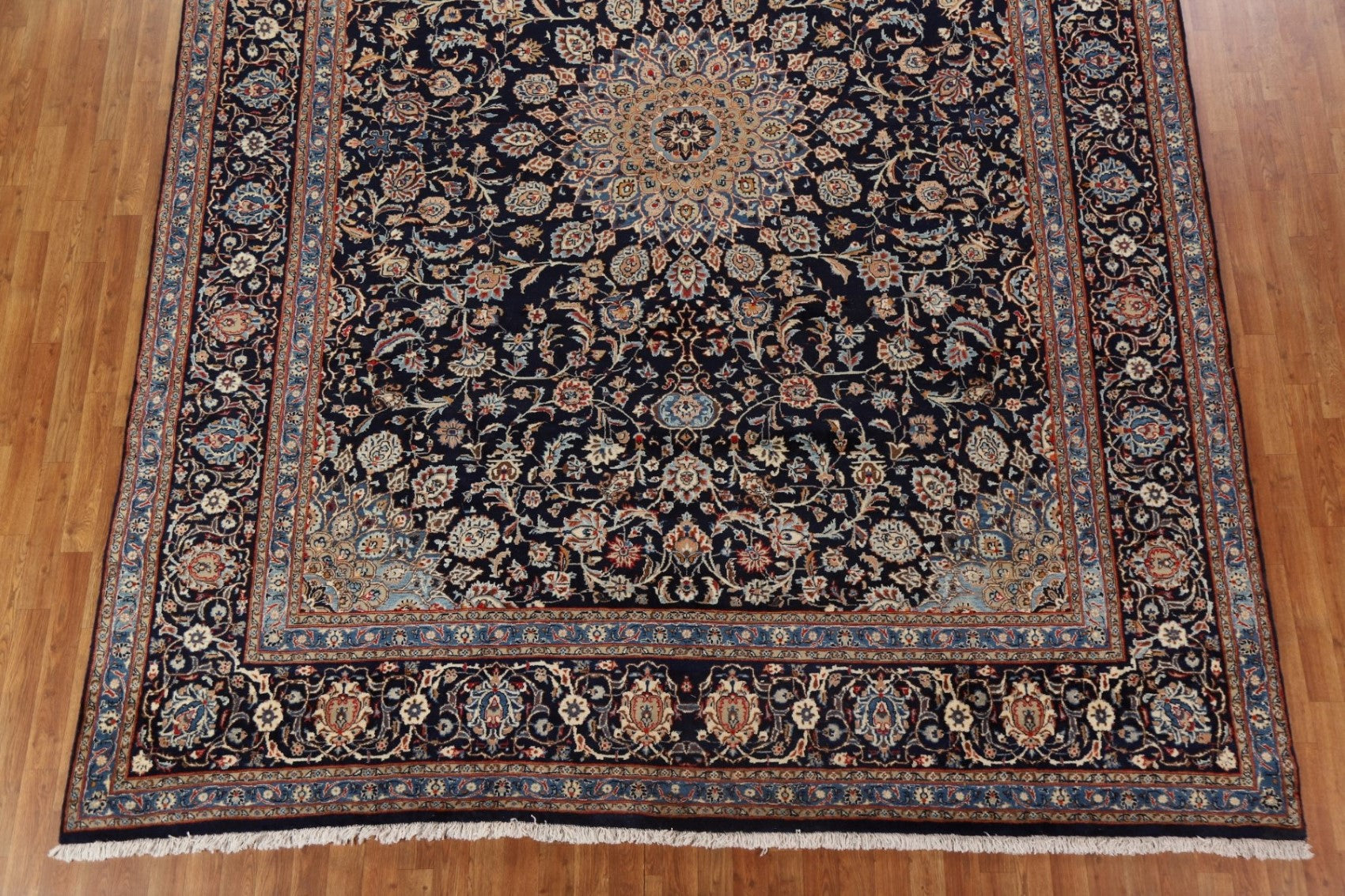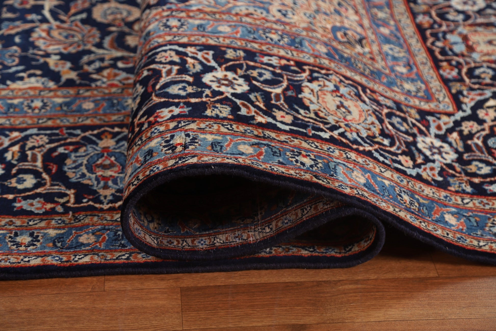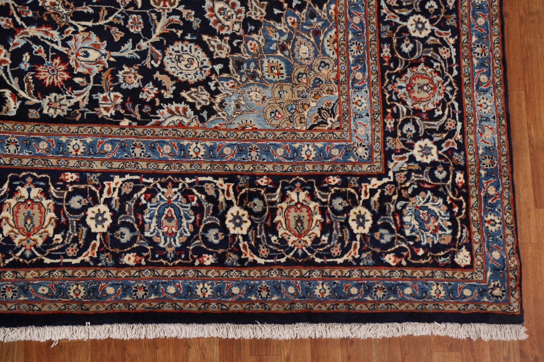 A Beautiful Genuine Persia ( Persia ) Kashan rug is Hand Knotted by skillful weavers in Persia ( Persia ) with 100% Wool Material. This rug is in Excellent condition. dimensions are 12' 11'' X 9' 10'' in foot and 394 X 300 in centimeter. the primary color is Navy Blue & Blues.