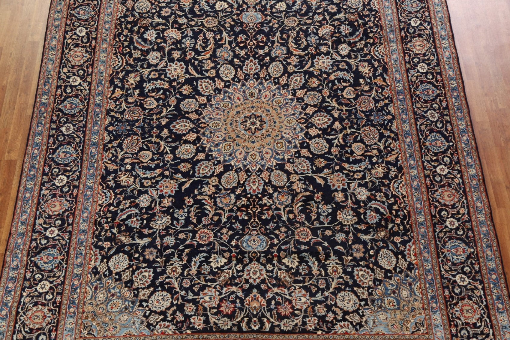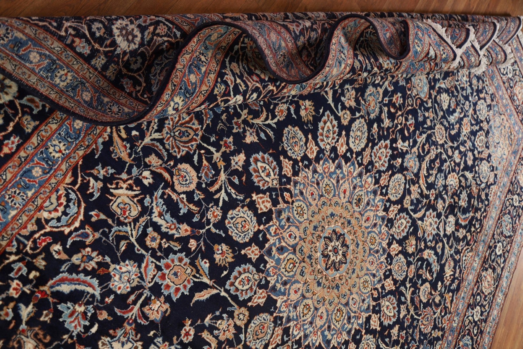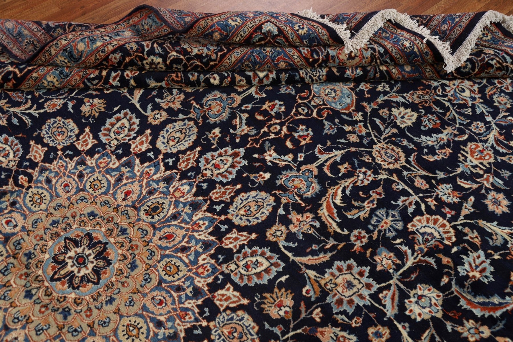 A Beautiful Genuine Persia ( Persia ) Kashan rug is Hand Knotted by skillful weavers in Persia ( Persia ) with 100% Wool Material. This rug is in Excellent condition. dimensions are 12' 11'' X 9' 10'' in foot and 394 X 300 in centimeter. the primary color is Navy Blue & Blues.