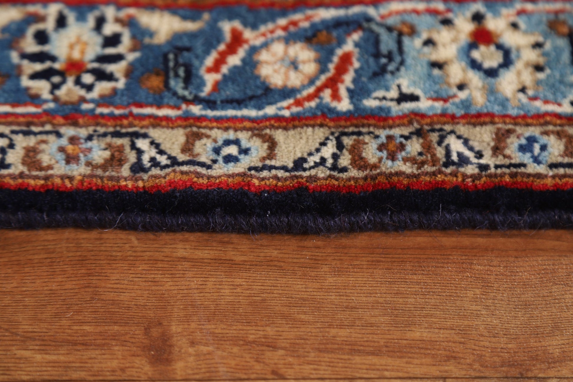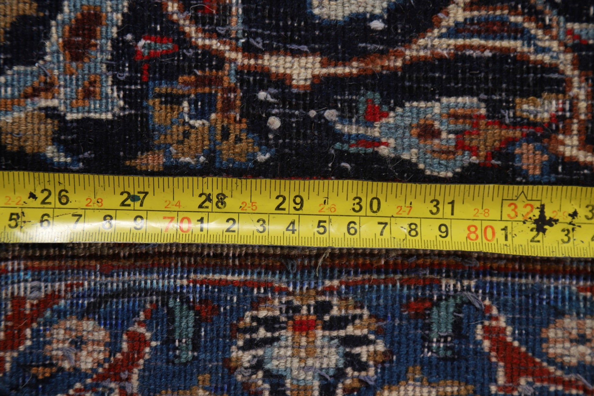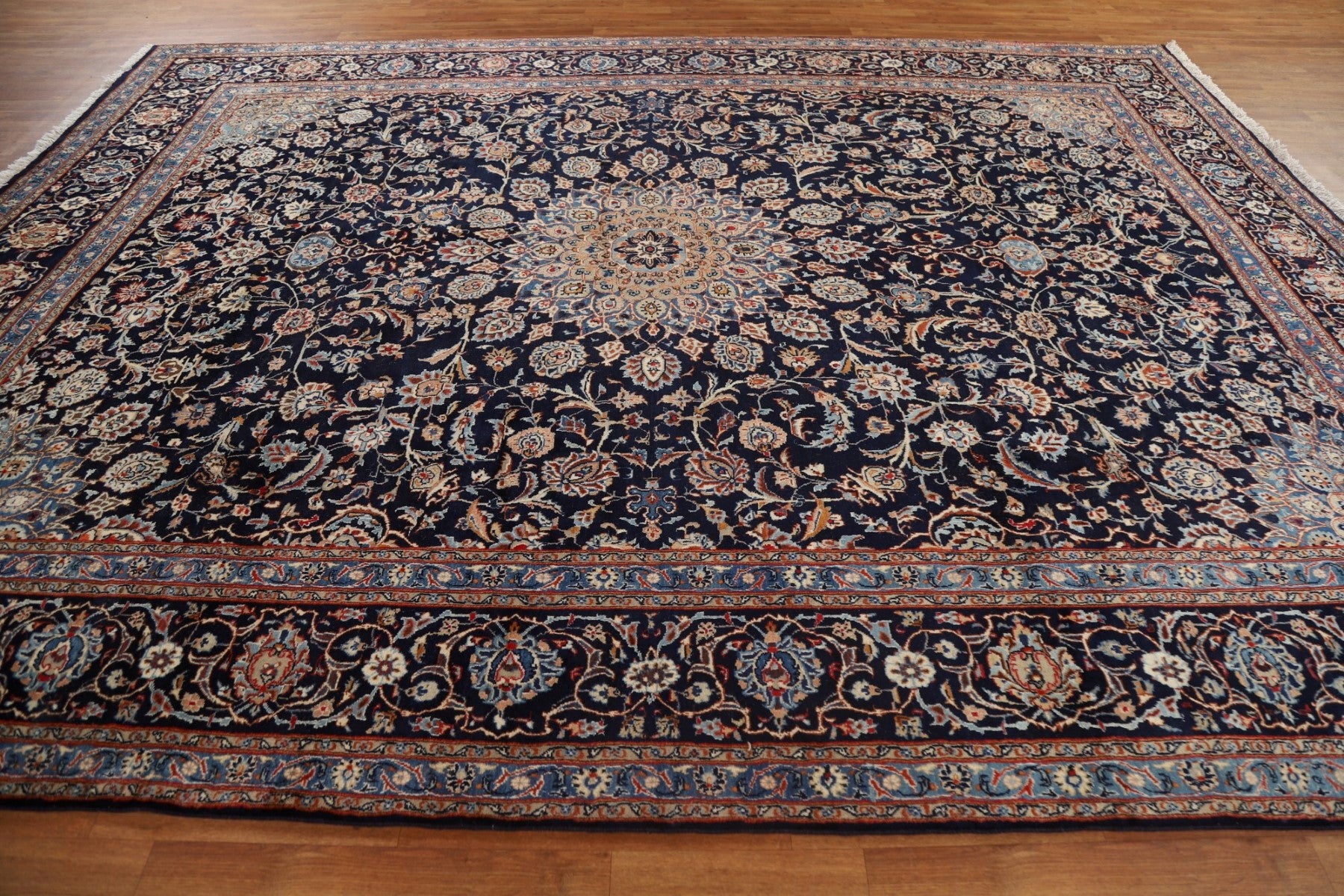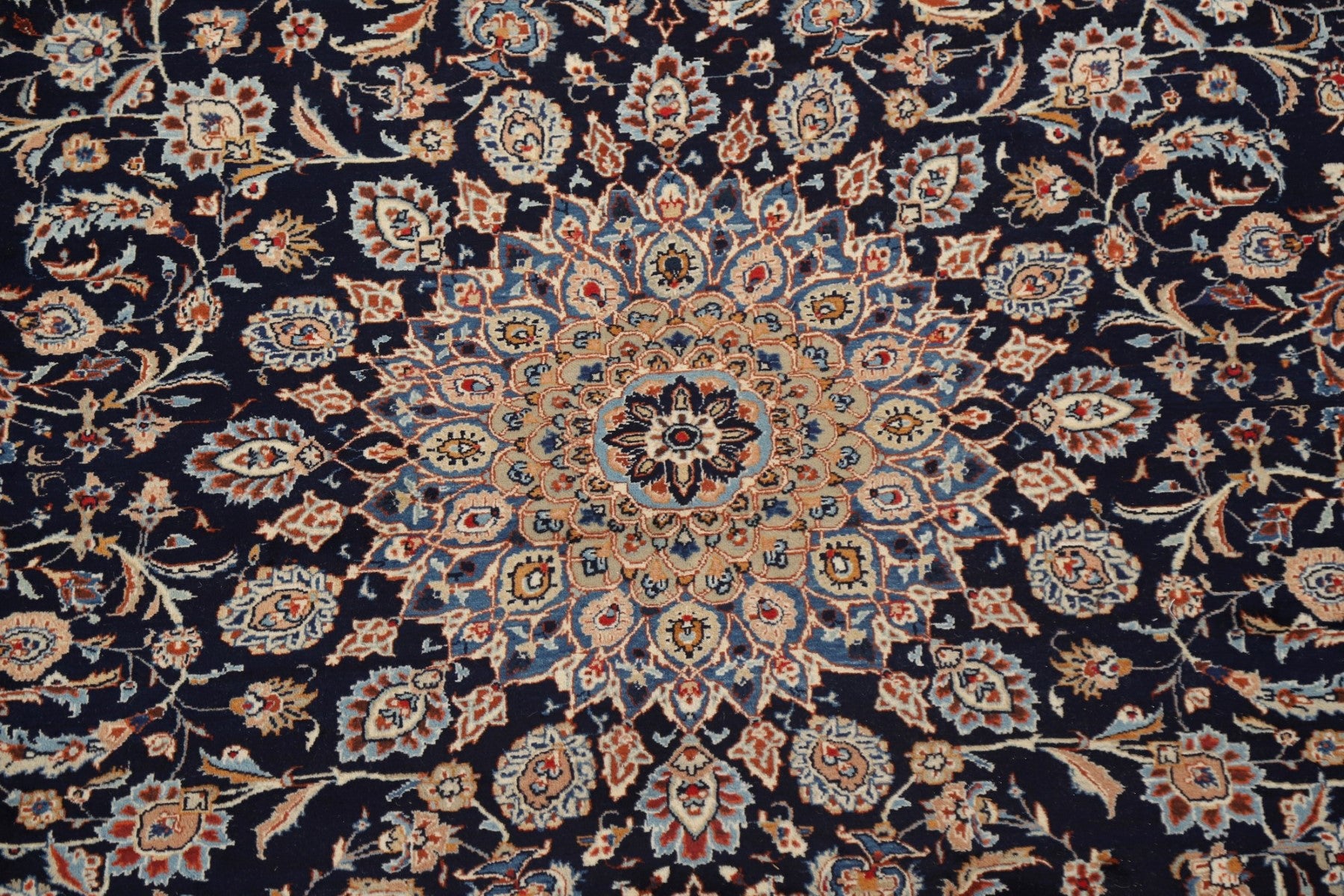 A Beautiful Genuine Persia ( Persia ) Kashan rug is Hand Knotted by skillful weavers in Persia ( Persia ) with 100% Wool Material. This rug is in Excellent condition. dimensions are 12' 11'' X 9' 10'' in foot and 394 X 300 in centimeter. the primary color is Navy Blue & Blues.