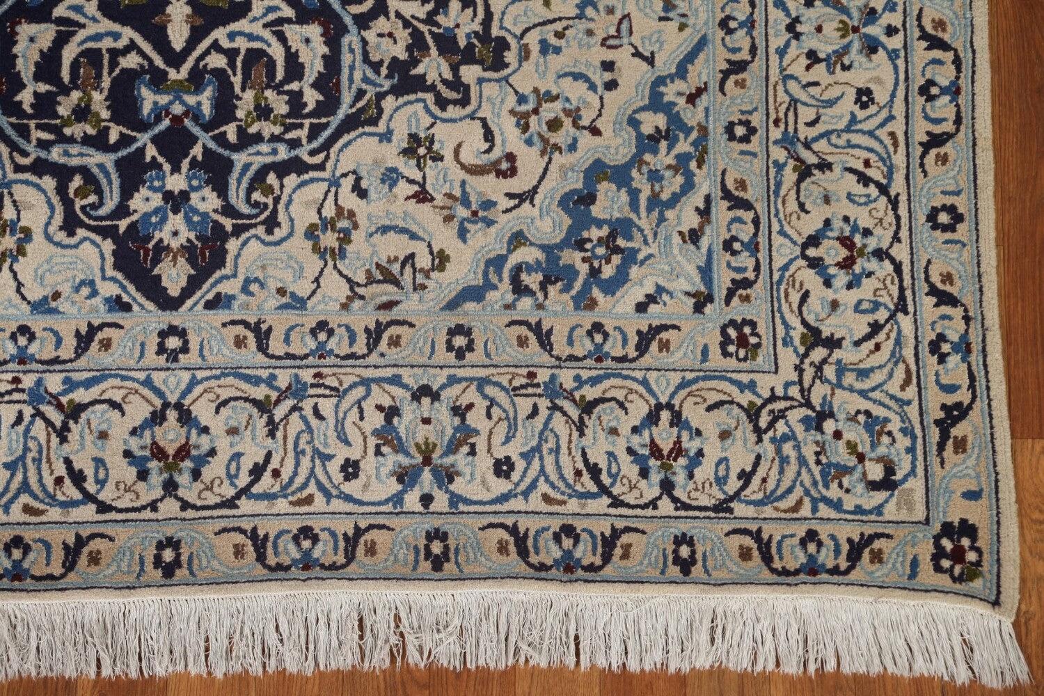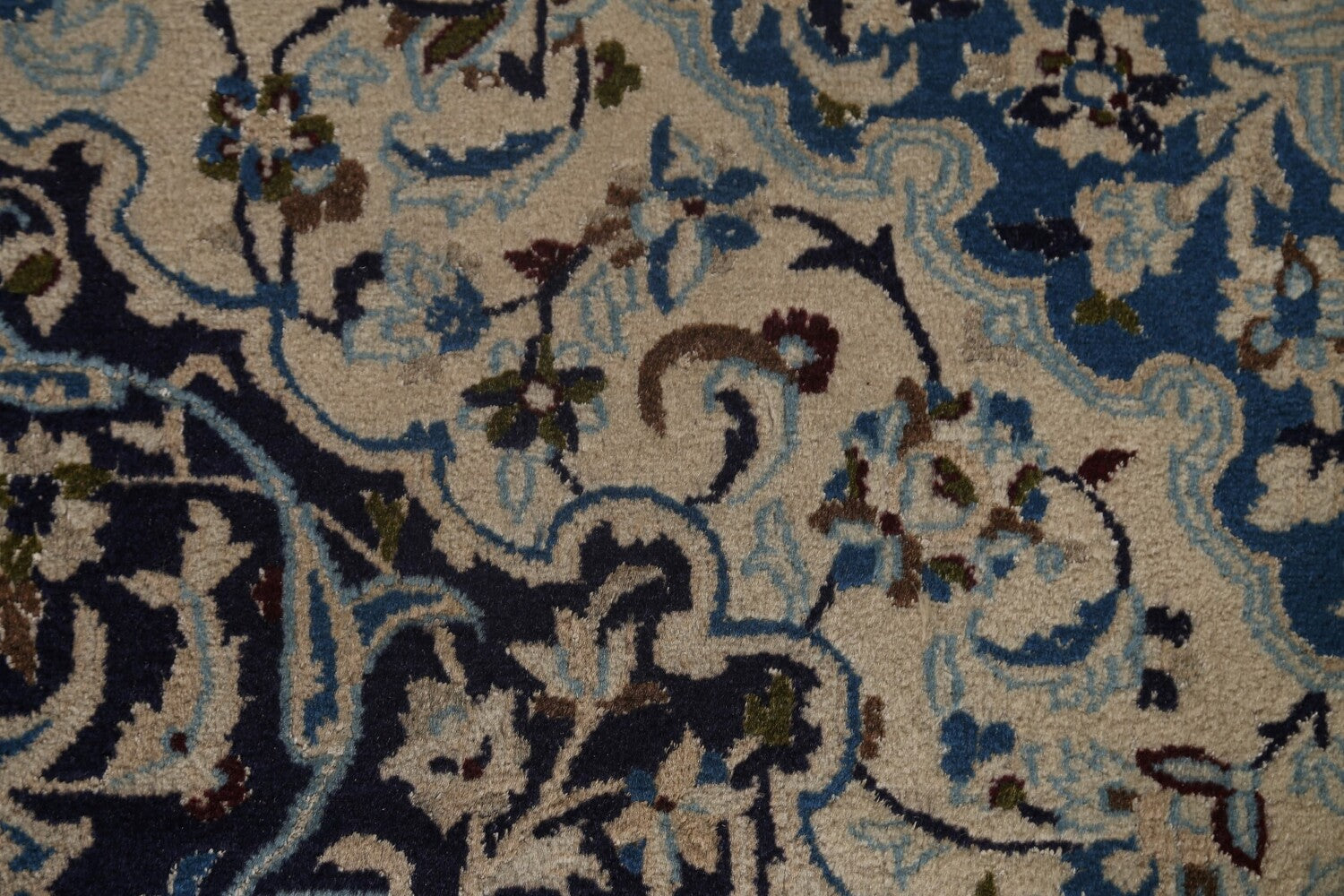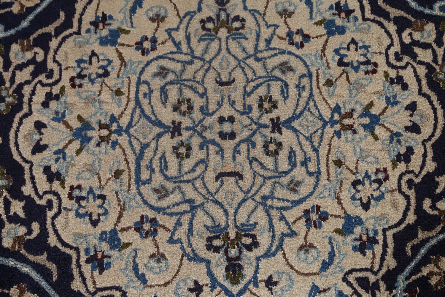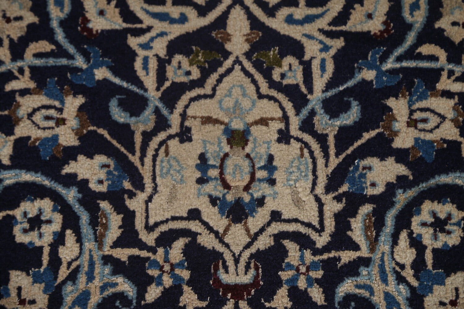 A Beautiful Genuine Persia ( Persia ) Nain rug is Hand Knotted by skillful weavers in Persia ( Persia ) with 100% Wool Material. This rug is in Very Good condition. dimensions are 8' 5'' X 5' 6'' in foot and 257 X 168 in centimeter. the primary color is Navy Blue & Blues.