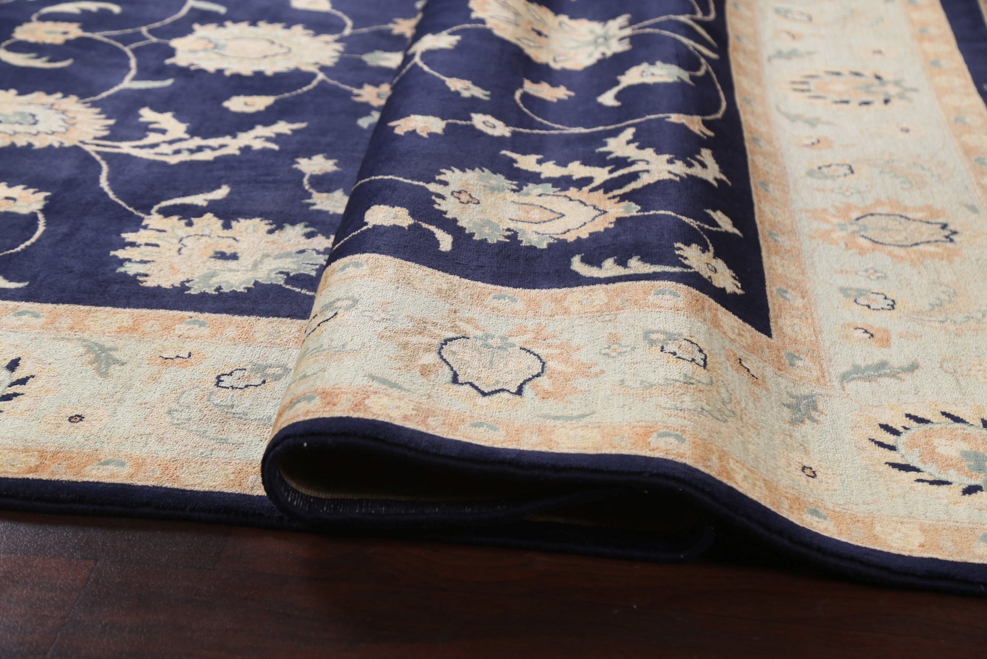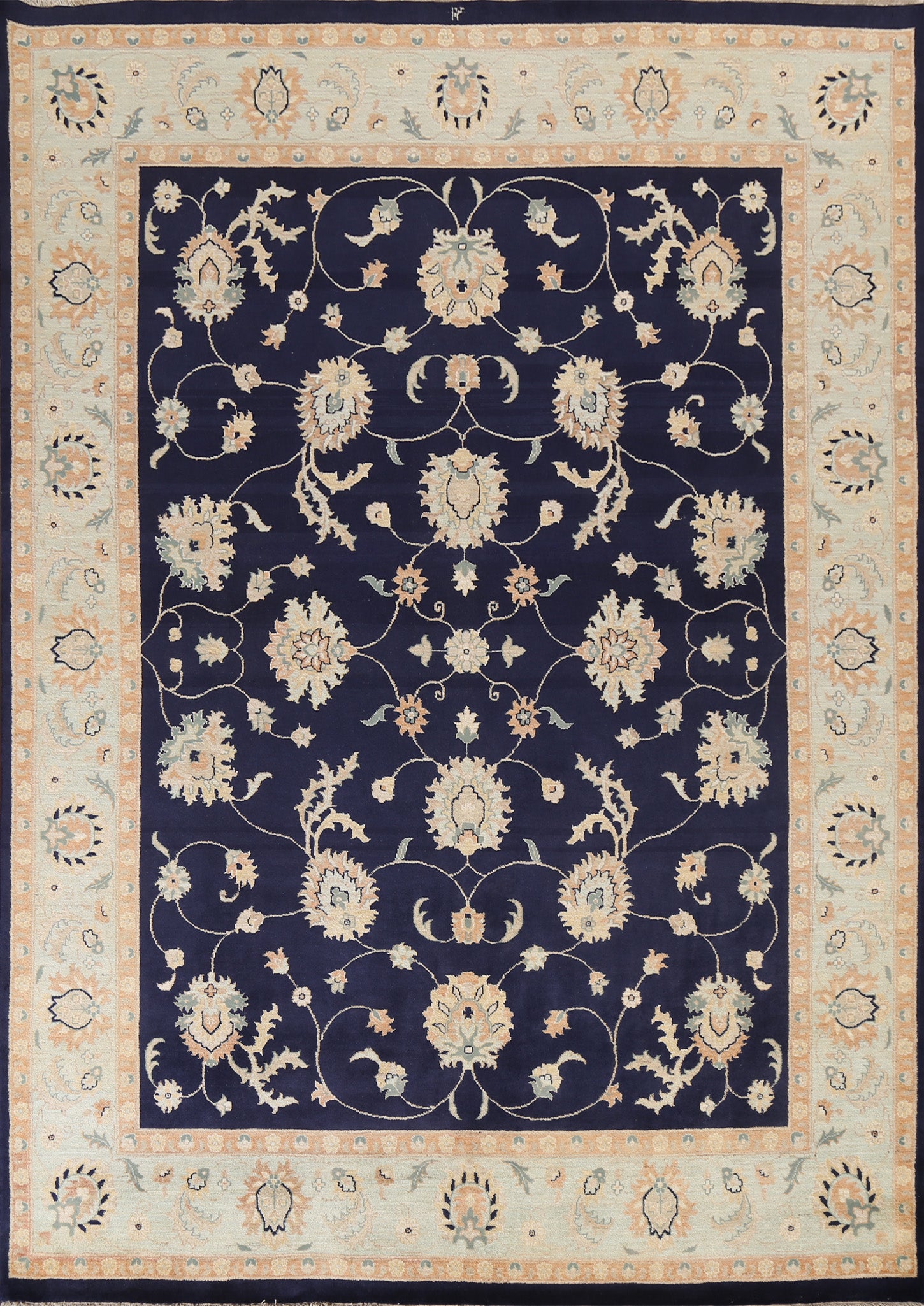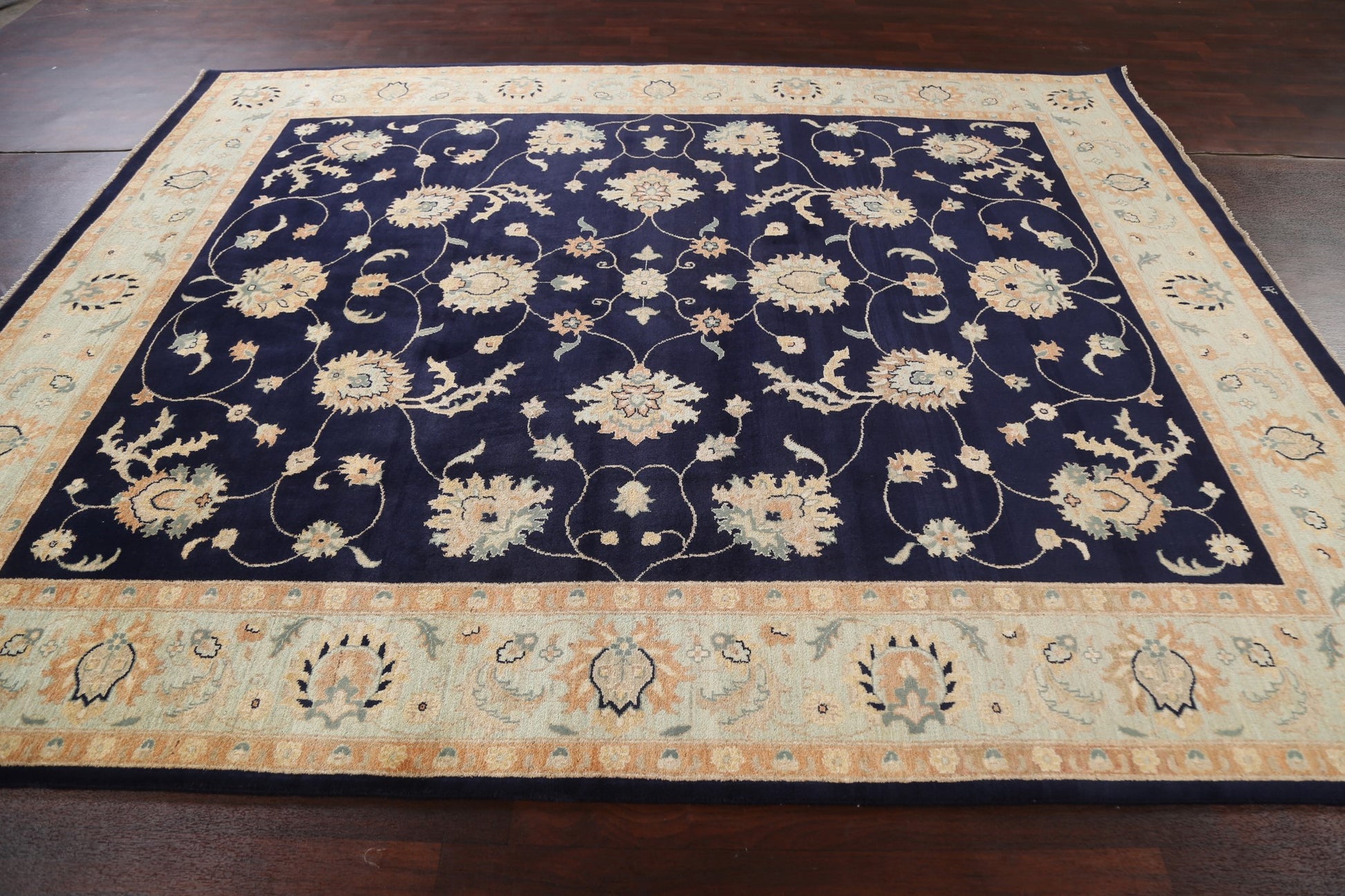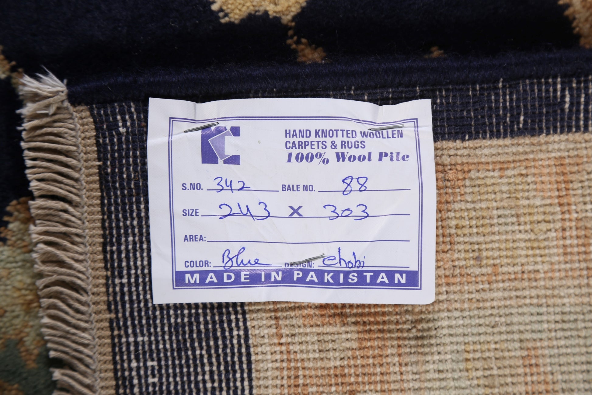 A Beautiful Genuine Pakistan Chobi-Peshawar rug is Hand Knotted by skillful weavers in Pakistan with 100% Wool Material. This rug is in New, First Quality condition. dimensions are 10' 0'' X 8' 0'' in foot and 305 X 244 in centimeter. the primary color is Navy Blue & Blues.