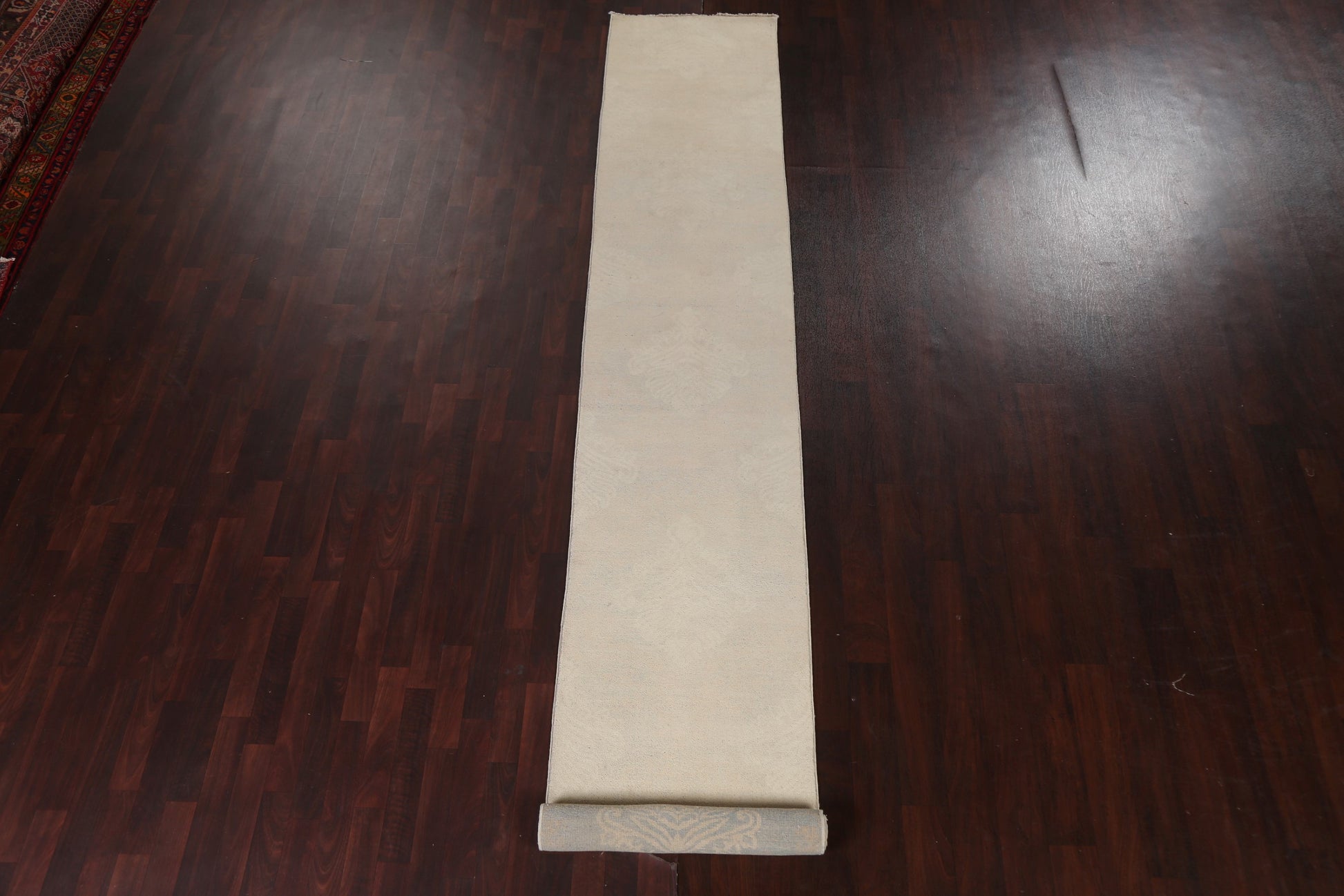 A Beautiful Genuine Turkey Oushak rug is Hand Knotted by skillful weavers in Turkey with 100% Wool Material. This rug is in New, First Quality condition. dimensions are 13' 9'' X 2' 4'' in foot and 419 X 71 in centimeter. the primary color is Beige & Ivories.