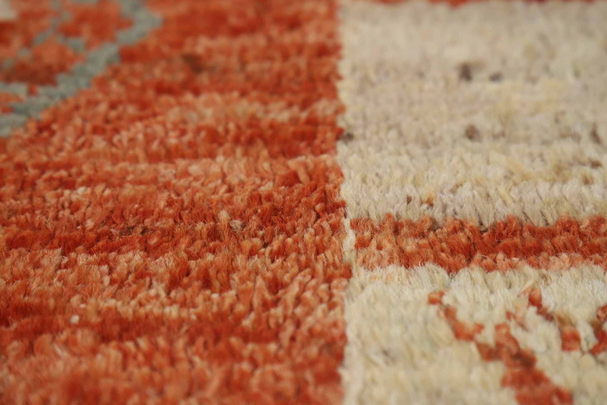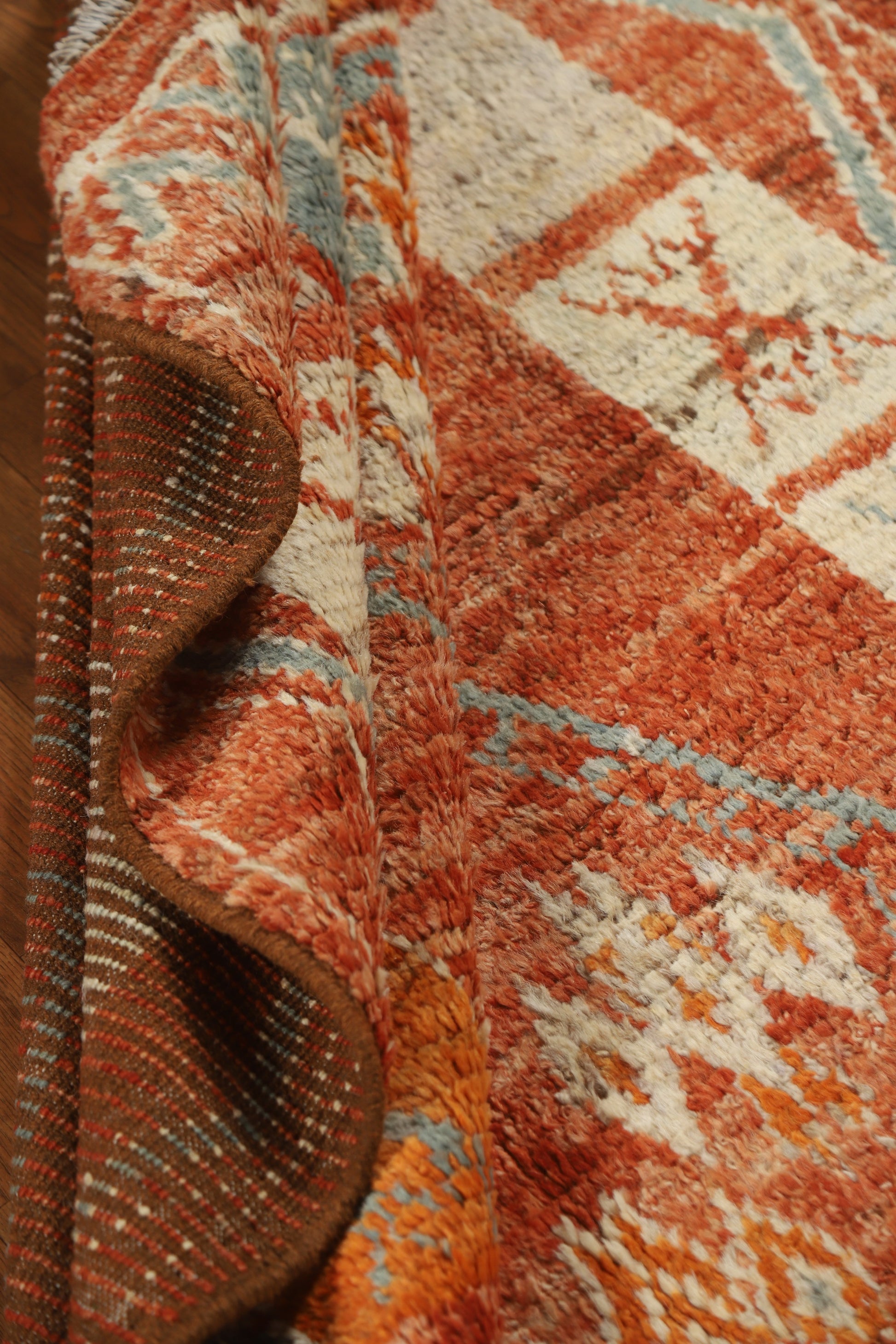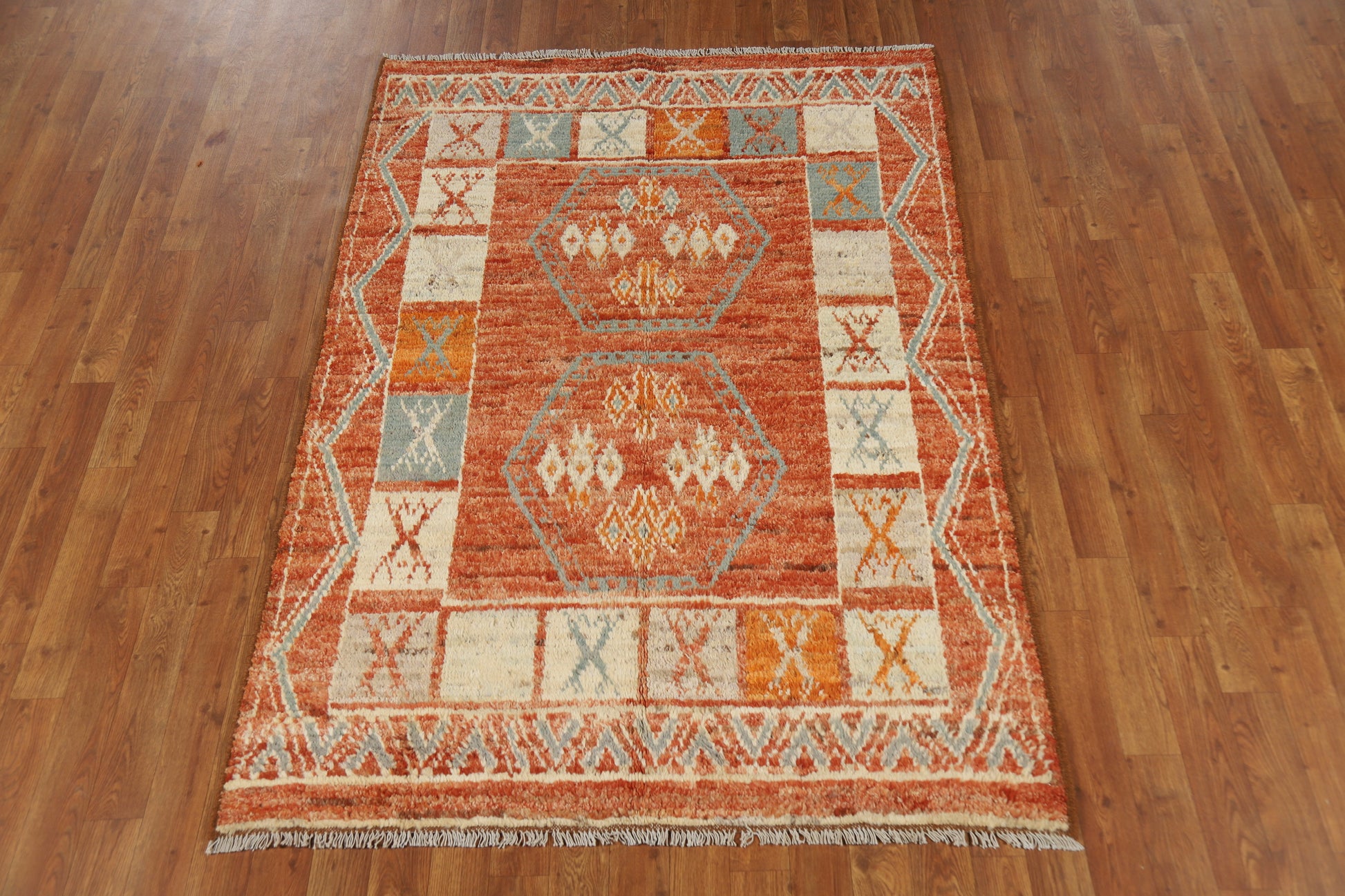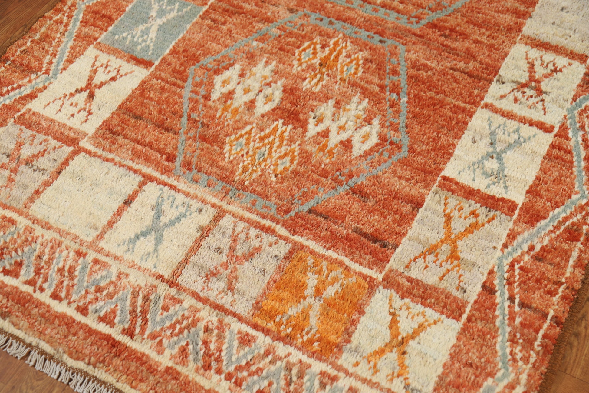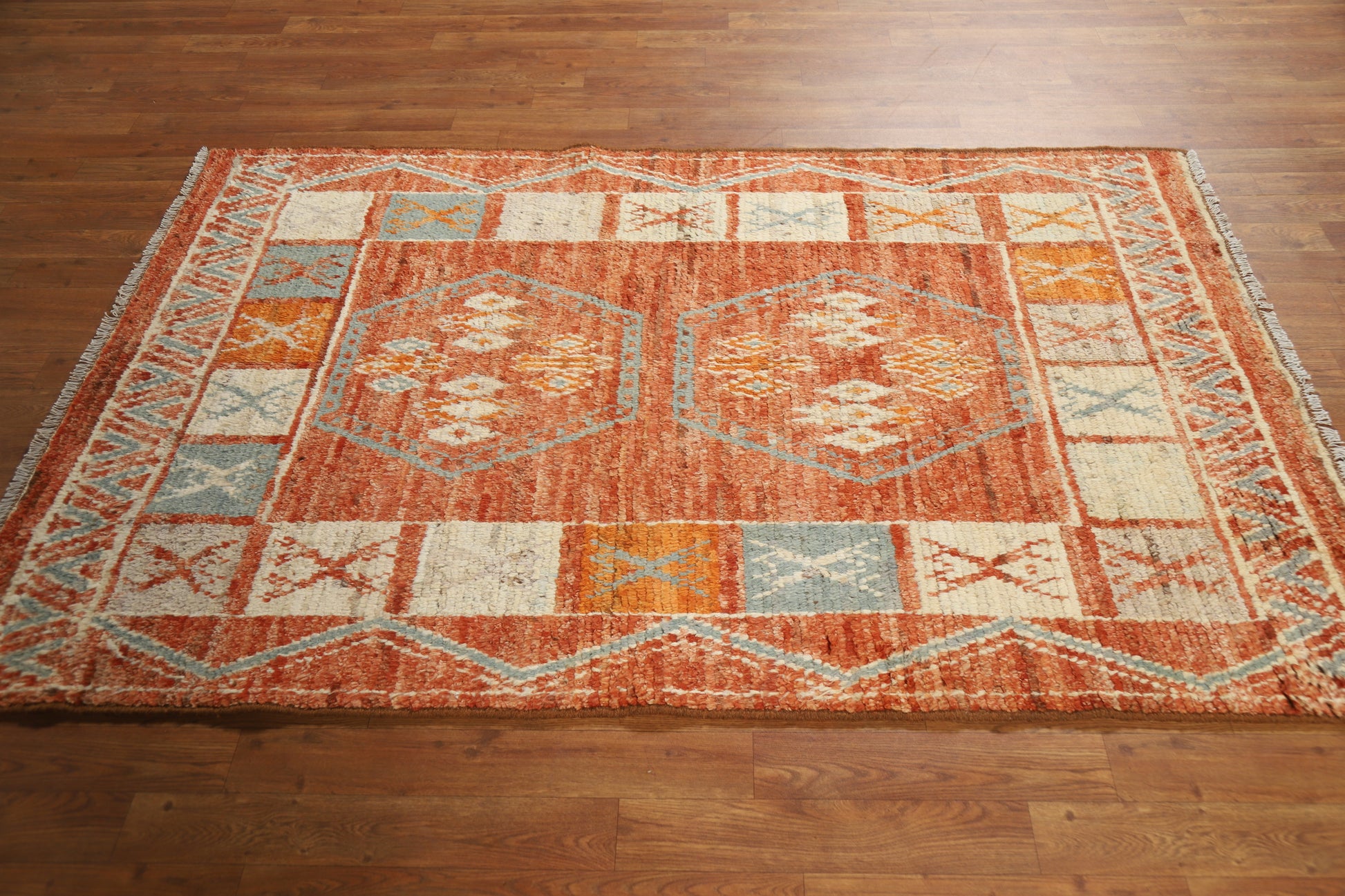 A Beautiful Genuine Pakistan Moroccan rug is Hand Knotted by skillful weavers in Pakistan with 100% Wool Material. This rug is in New, First Quality condition. dimensions are 6' 1'' X 4' 1'' in foot and 185 X 124 in centimeter. the primary color is Oranges & Rust.
