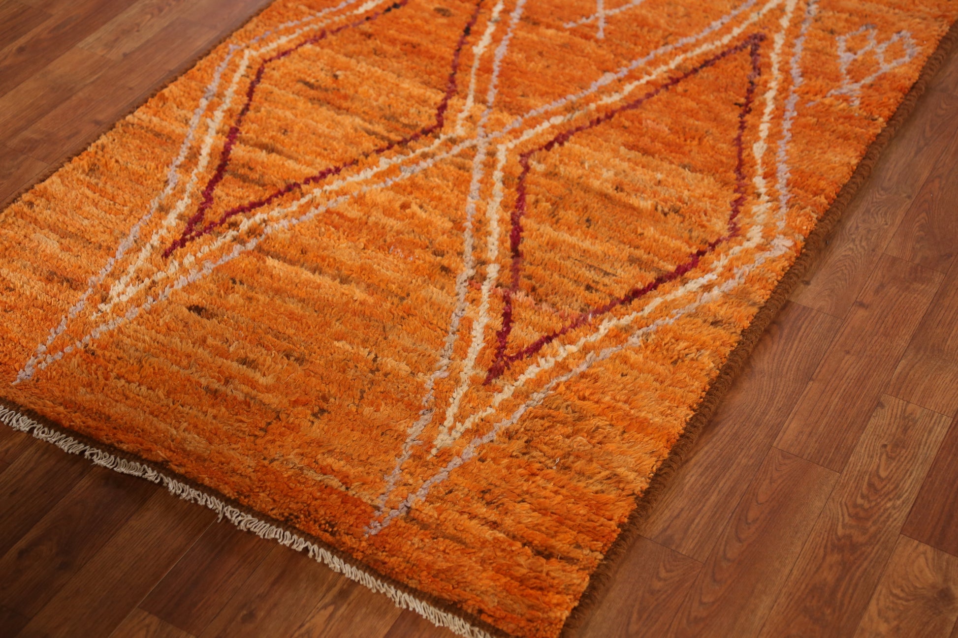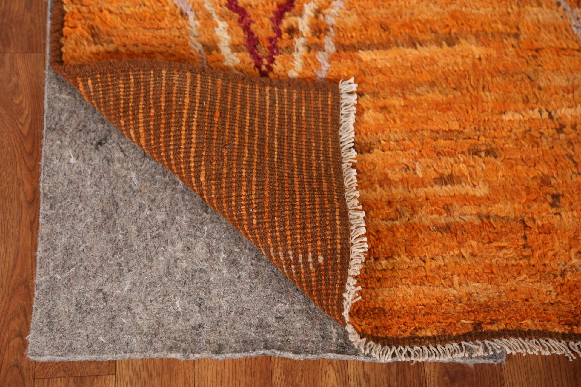 A Beautiful Genuine Pakistan Moroccan rug is Hand Knotted by skillful weavers in Pakistan with 100% Wool Material. This rug is in New, First Quality condition. dimensions are 9' 8'' X 3' 3'' in foot and 295 X 99 in centimeter. the primary color is Oranges & Rust.