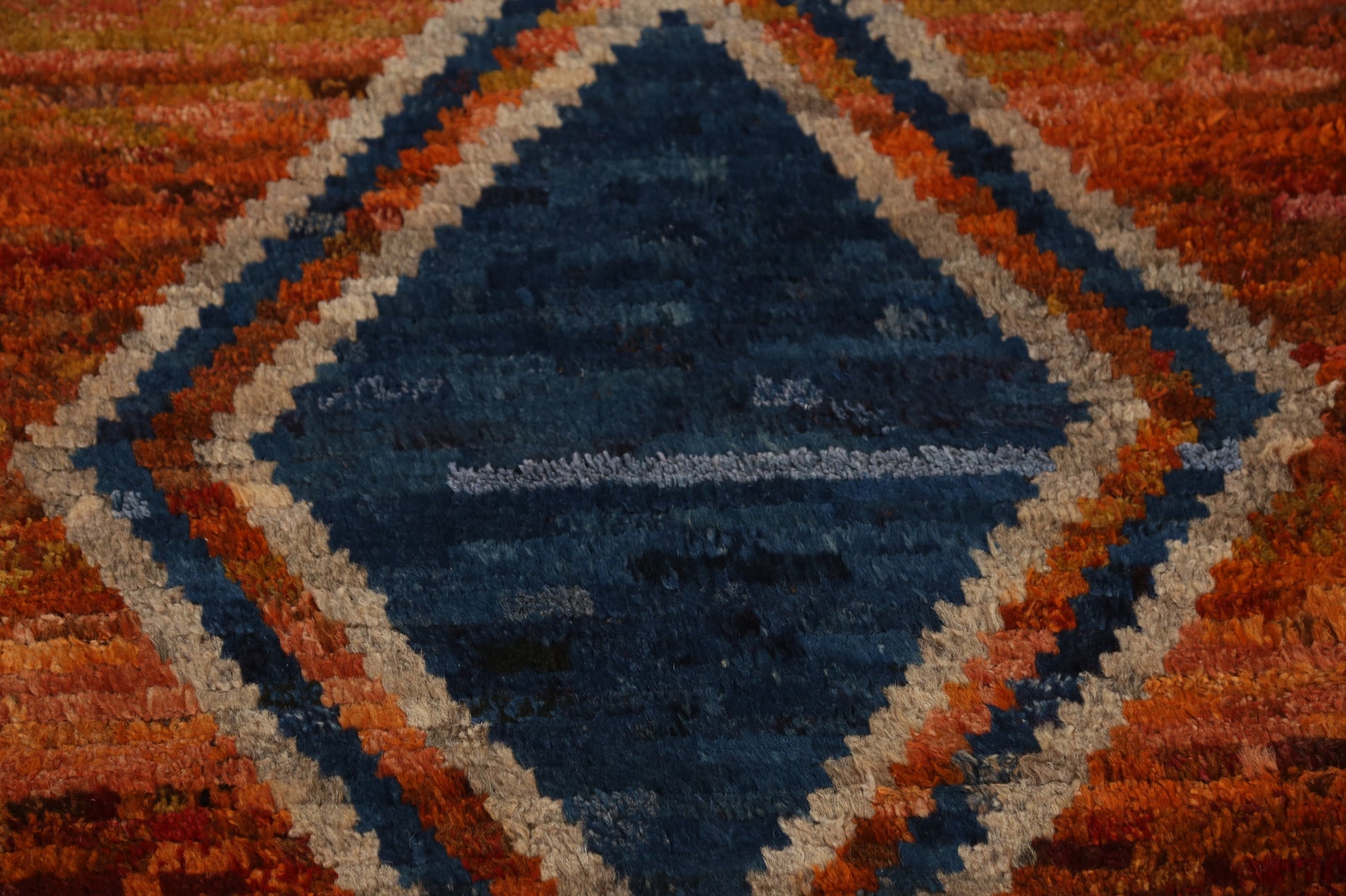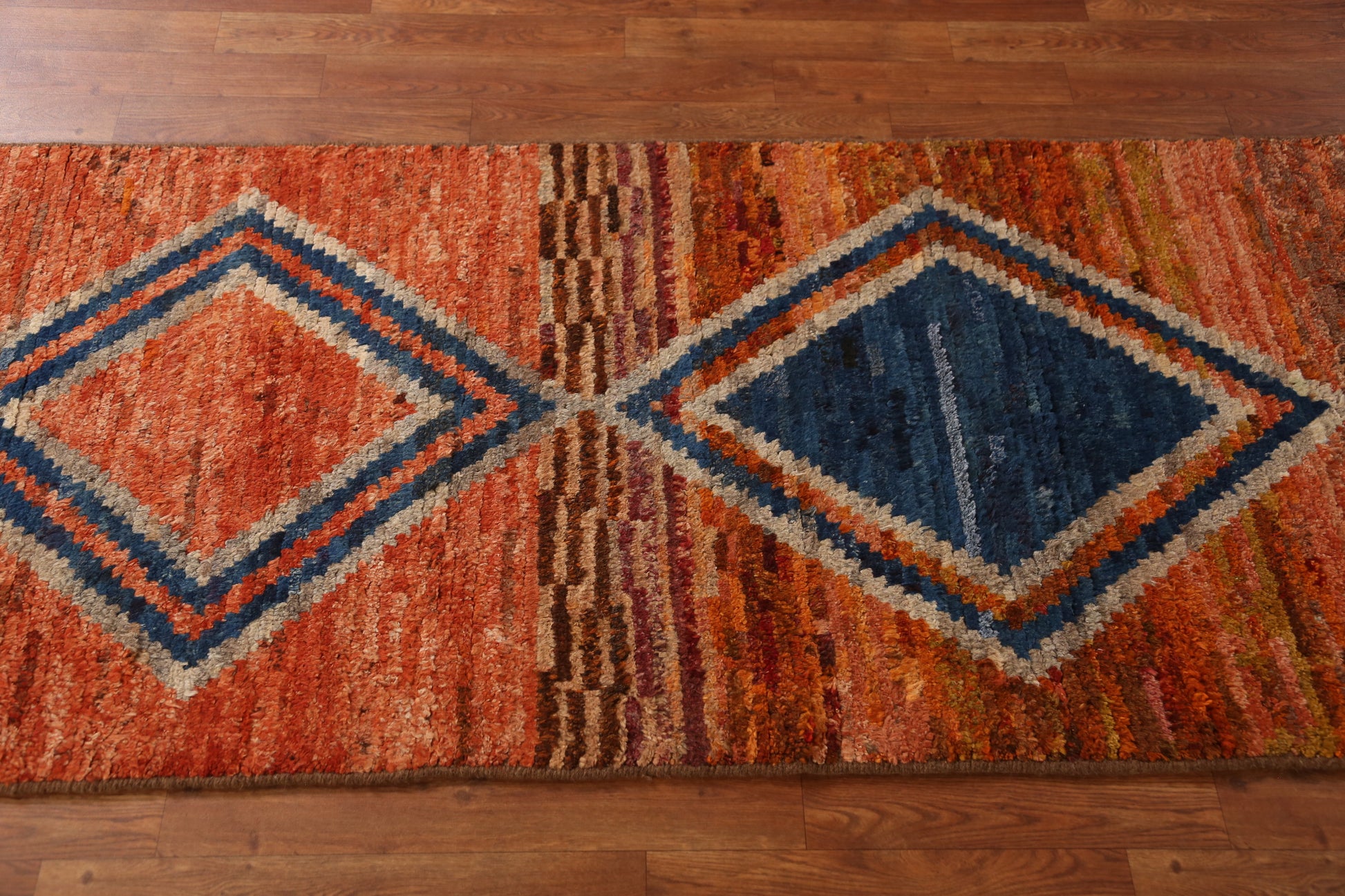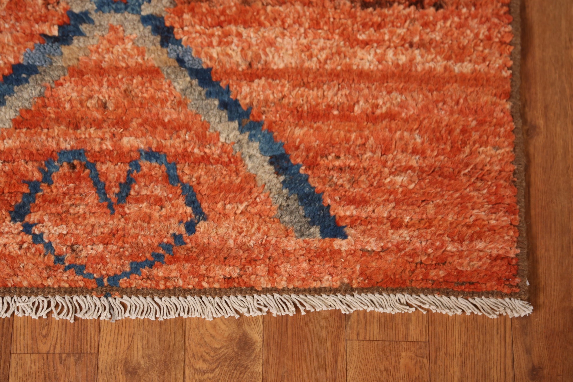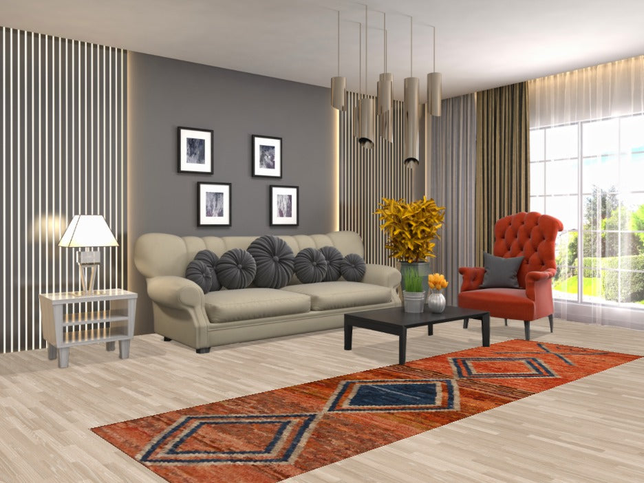 A Beautiful Genuine Pakistan Moroccan rug is Hand Knotted by skillful weavers in Pakistan with 100% Wool Material. This rug is in New, First Quality condition. dimensions are 9' 10'' X 2' 9'' in foot and 300 X 84 in centimeter. the primary color is Oranges & Rust.