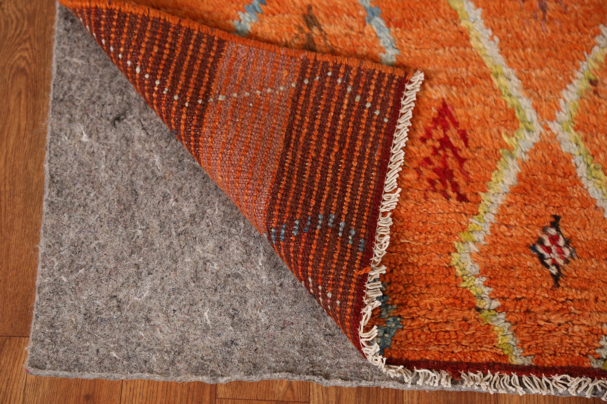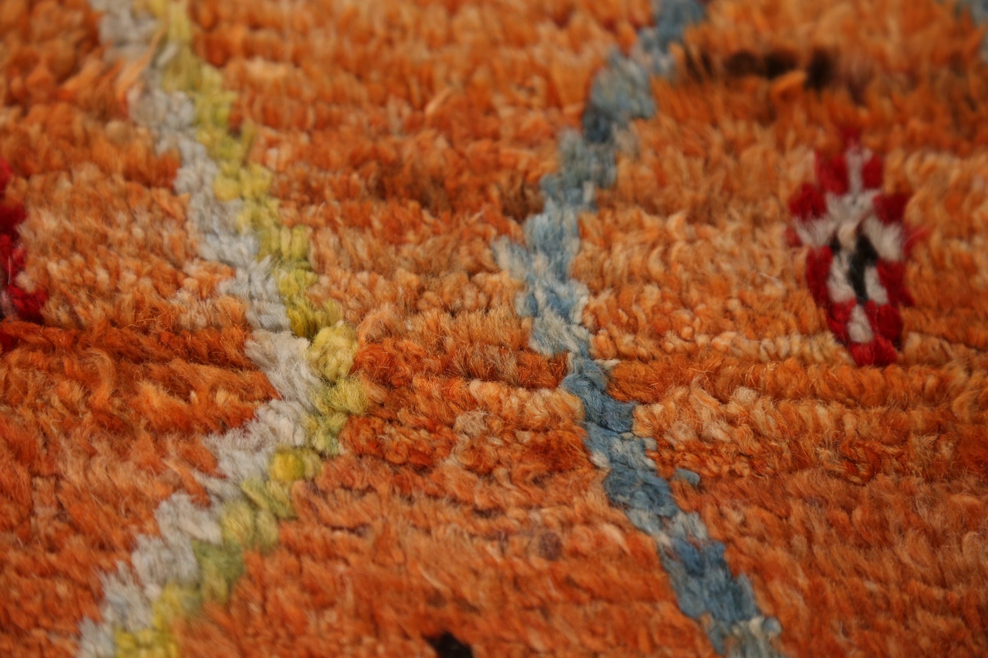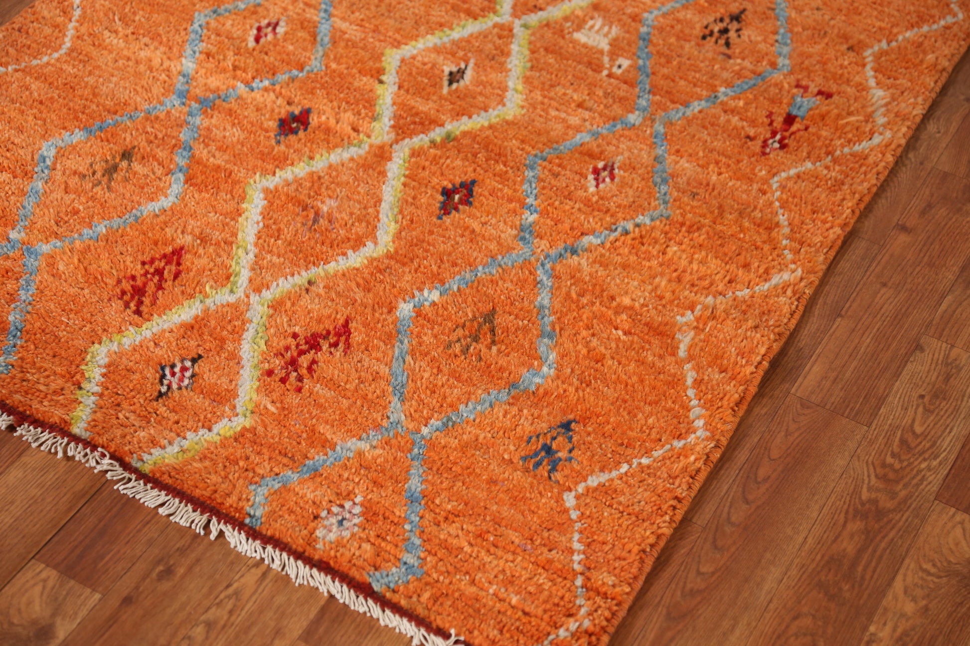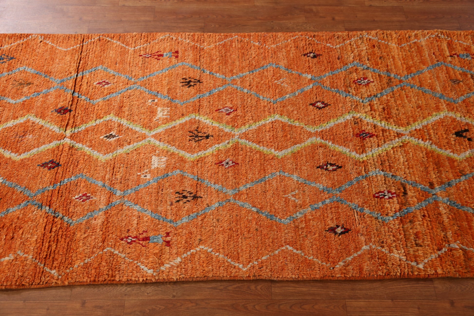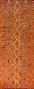 A Beautiful Genuine Pakistan Moroccan rug is Hand Knotted by skillful weavers in Pakistan with 100% Wool Material. This rug is in New, First Quality condition. dimensions are 9' 9'' X 3' 2'' in foot and 297 X 97 in centimeter. the primary color is Oranges & Rust.