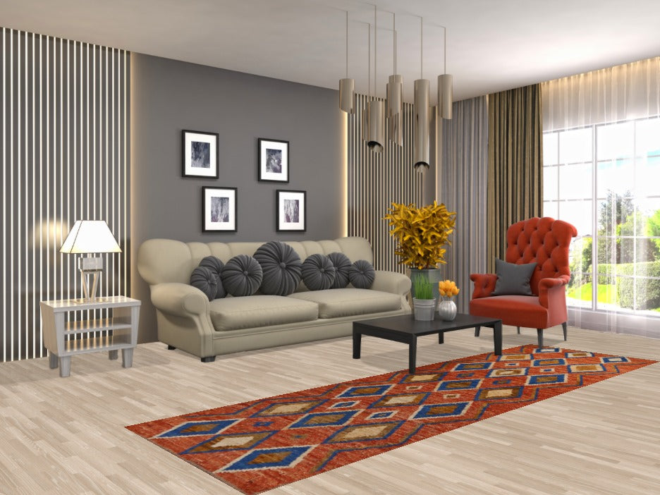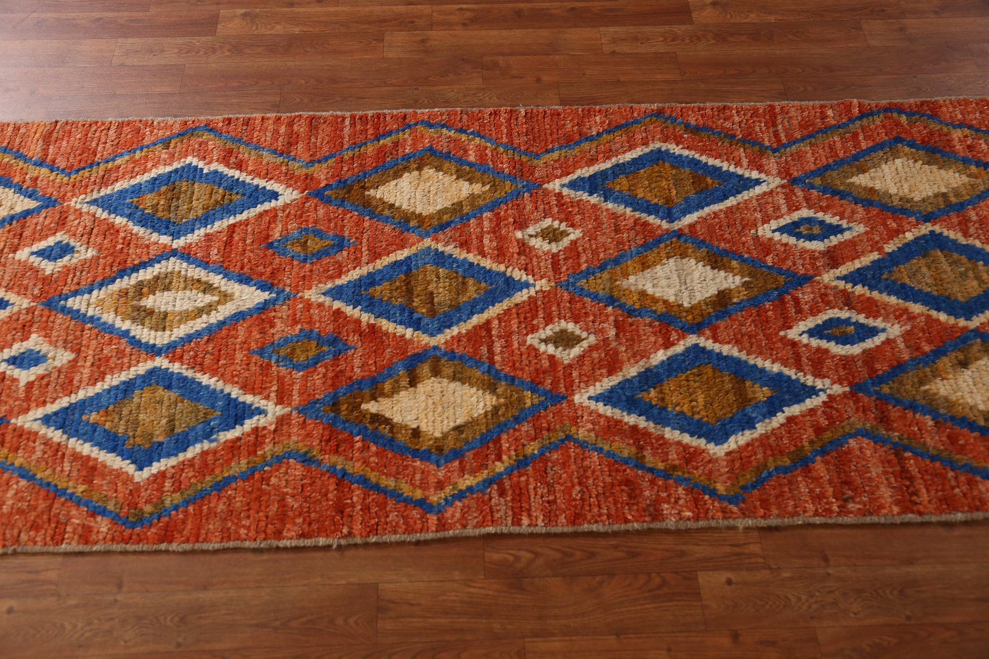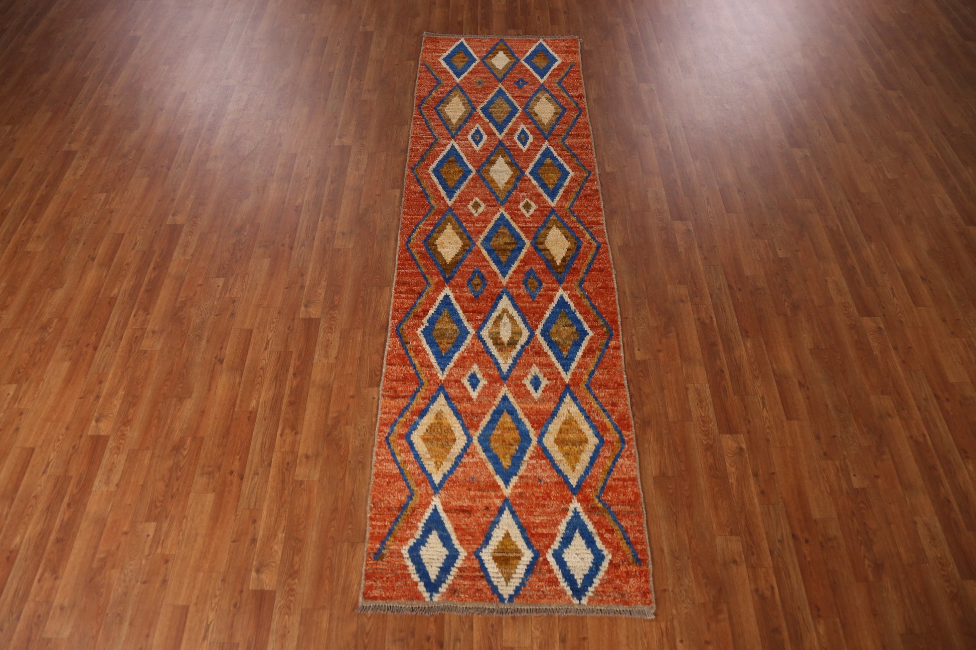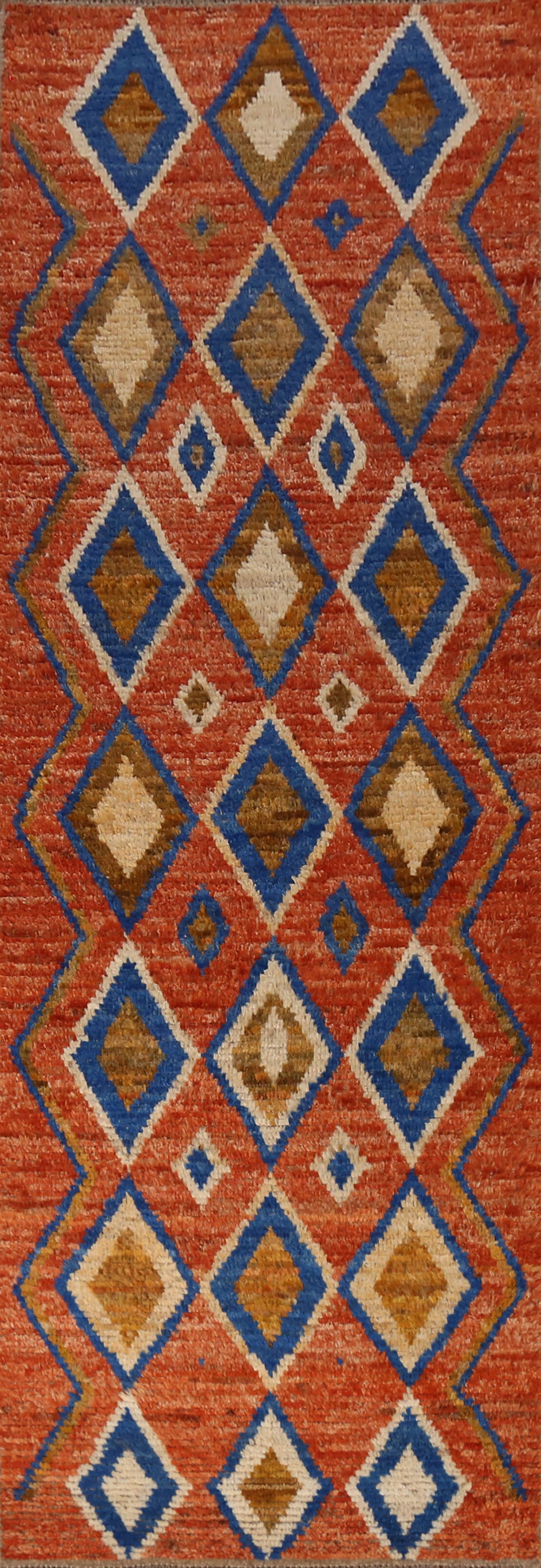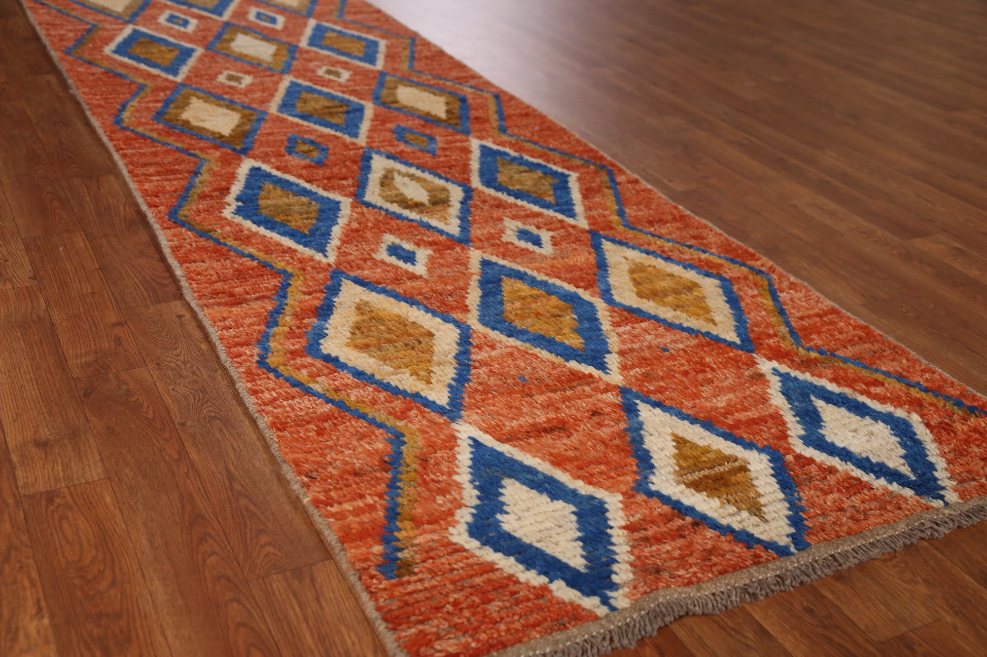 A Beautiful Genuine Pakistan Moroccan rug is Hand Knotted by skillful weavers in Pakistan with 100% Wool Material. This rug is in New, First Quality condition. dimensions are 9' 9'' X 2' 10'' in foot and 297 X 86 in centimeter. the primary color is Oranges & Rust.