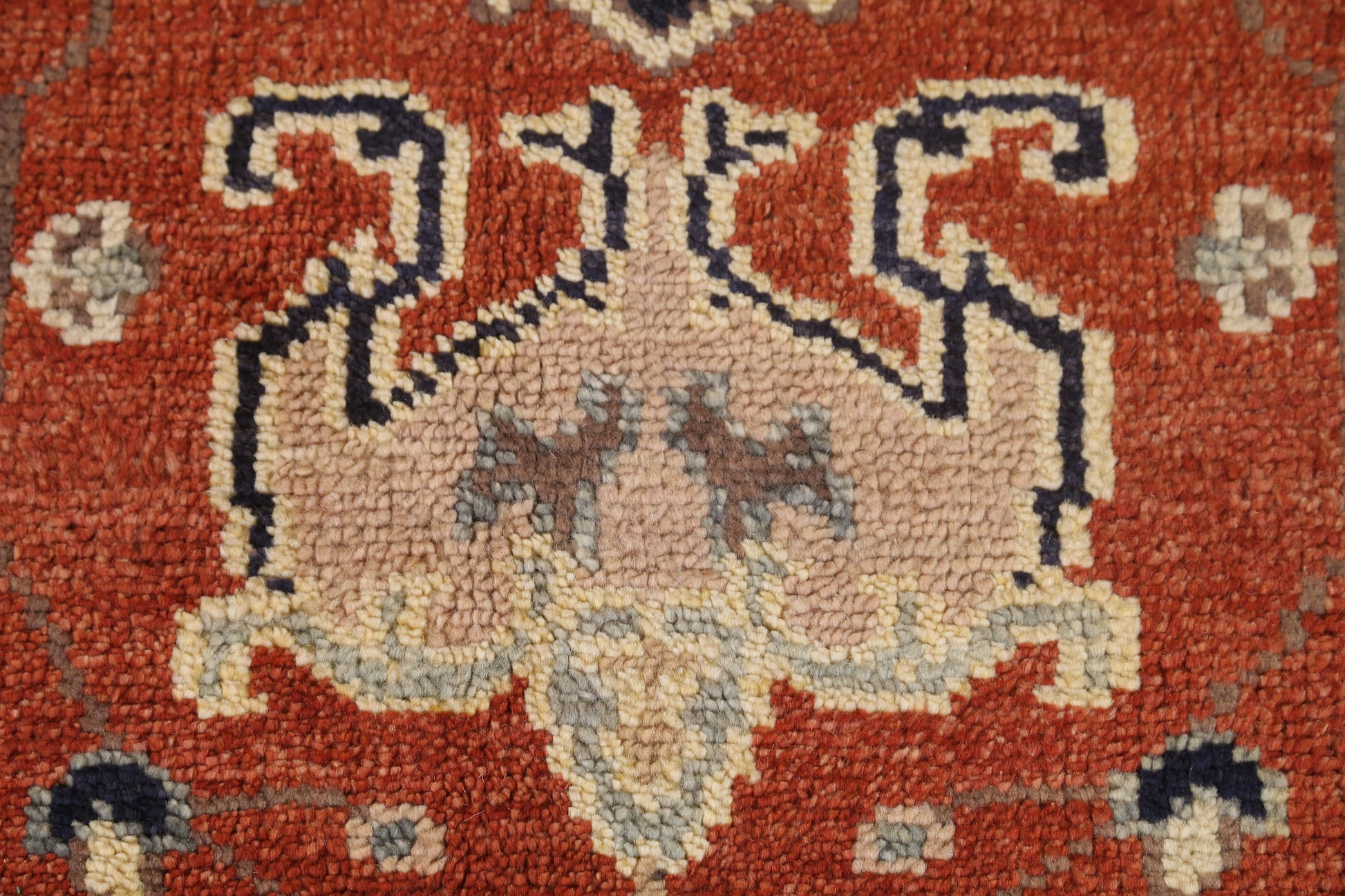 A Beautiful Genuine India Oushak rug is Hand Knotted by skillful weavers in India with 100% Wool Material. This rug is in New, First Quality condition. dimensions are 10' 4'' X 7' 9'' in foot and  315 X 236 in centimeter. the primary color is Oranges & Rust.