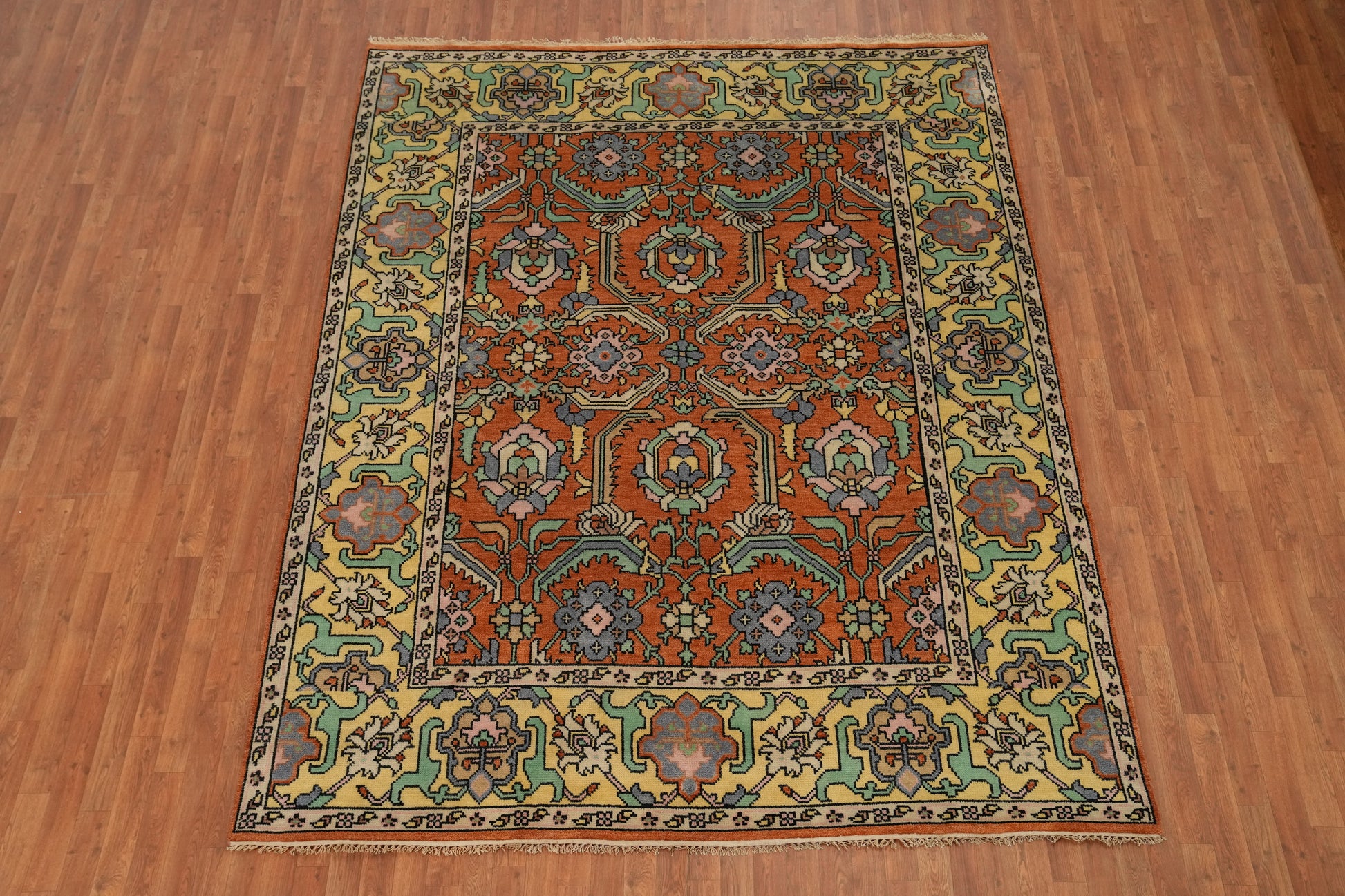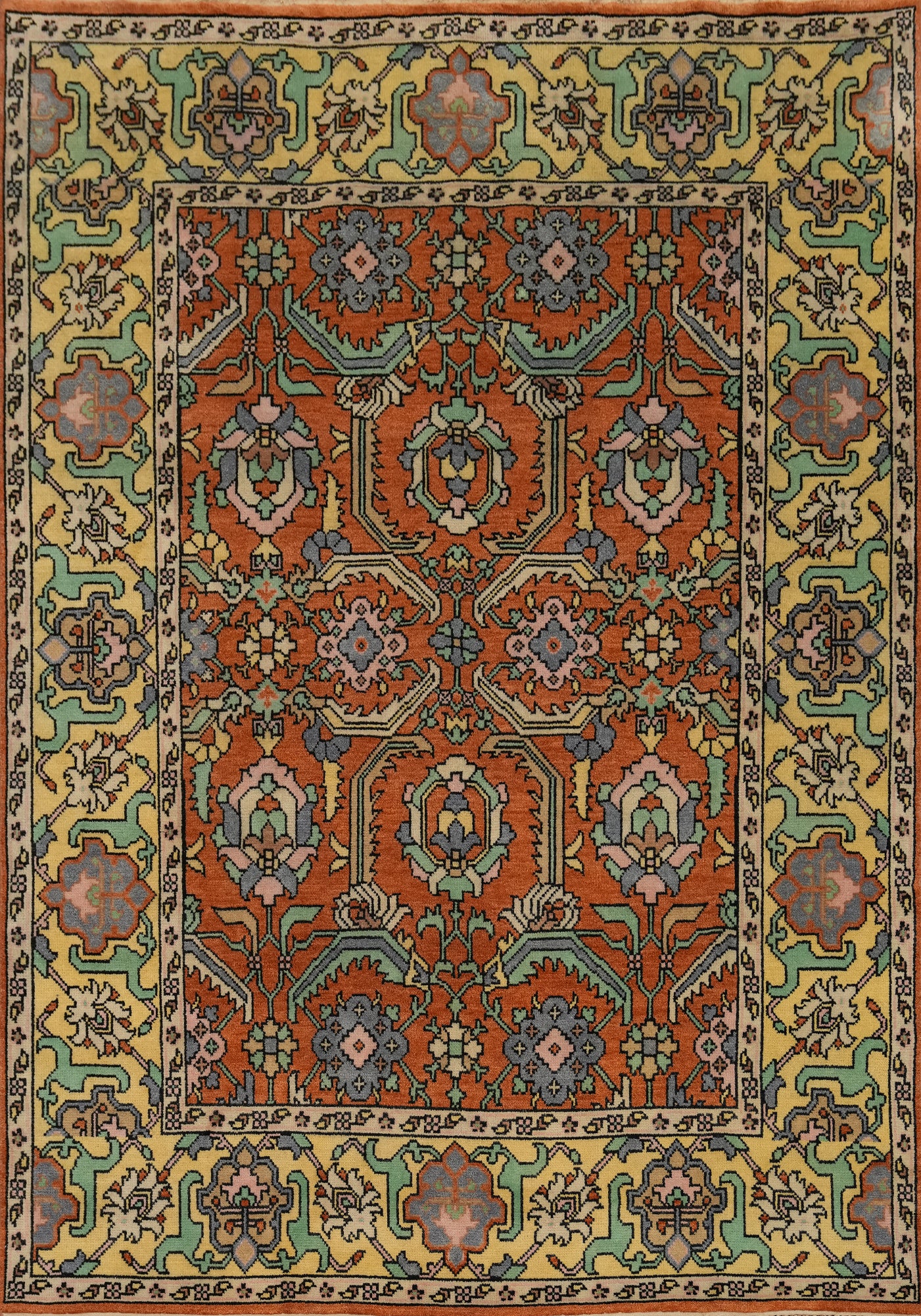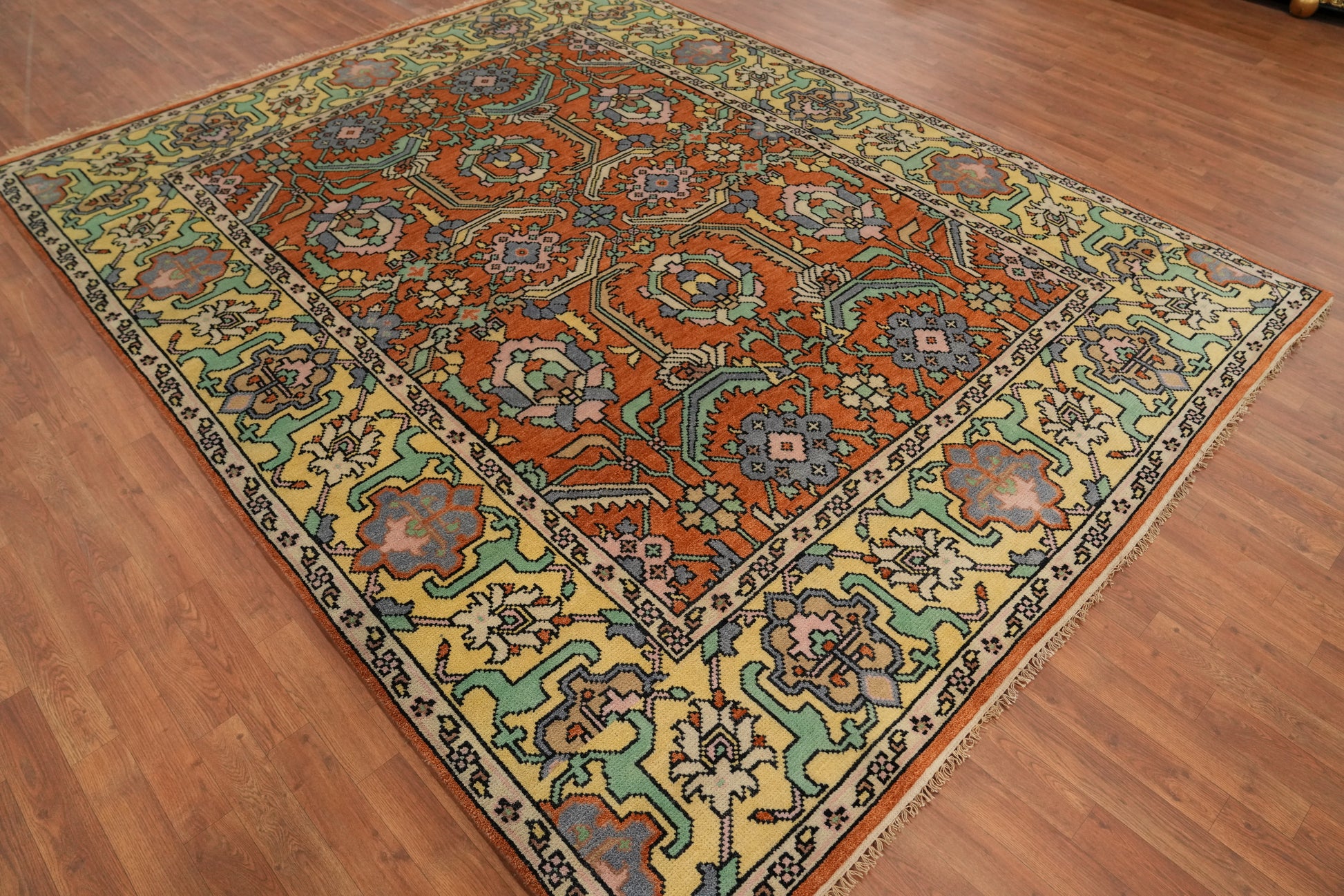 A Beautiful Genuine India Oushak rug is Hand Knotted by skillful weavers in India with 100% Wool Material. This rug is in New, First Quality condition. dimensions are 10' 0'' X 7' 10'' in foot and  305 X 239 in centimeter. the primary color is Oranges & Rust.