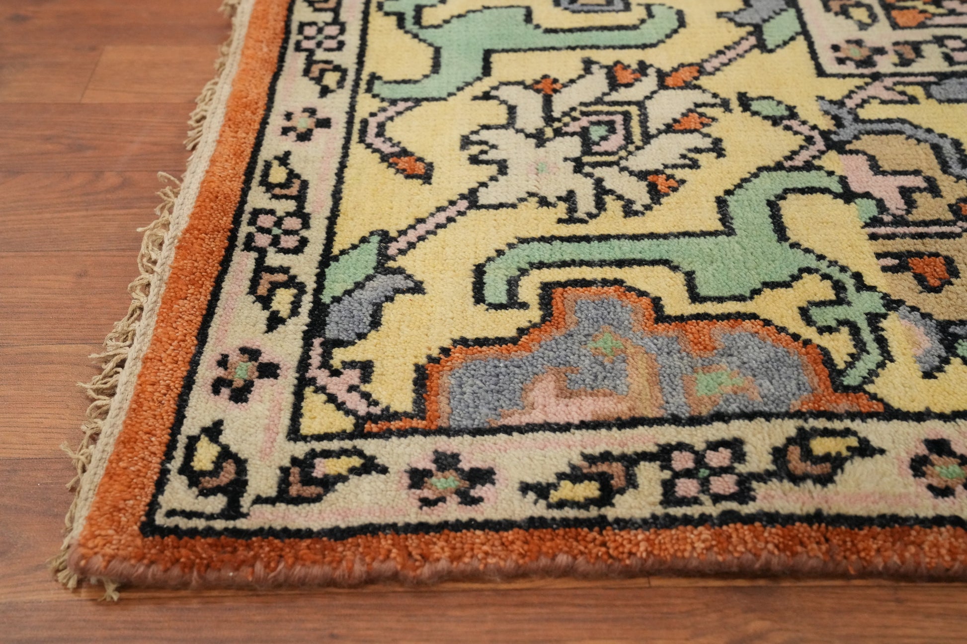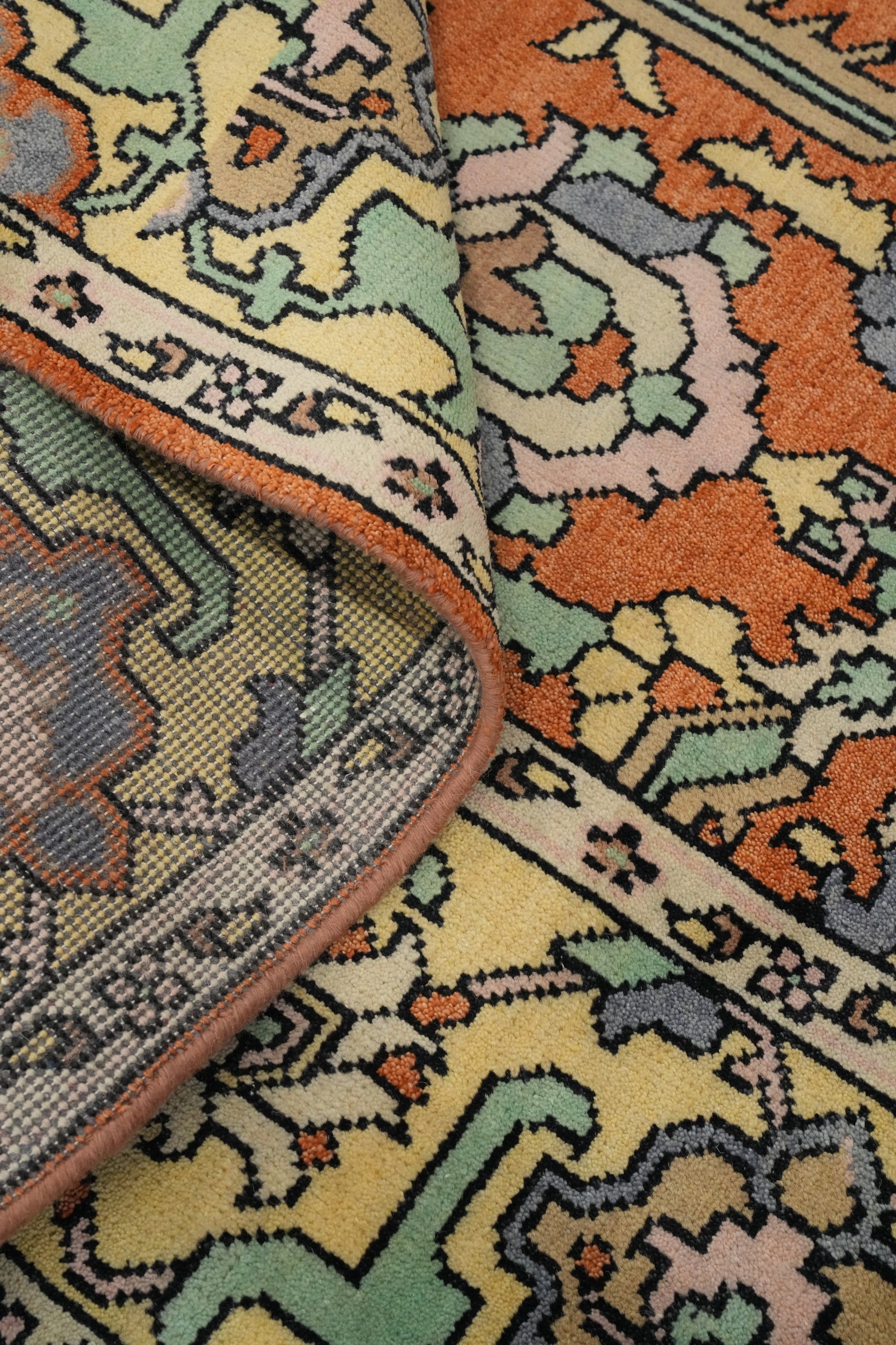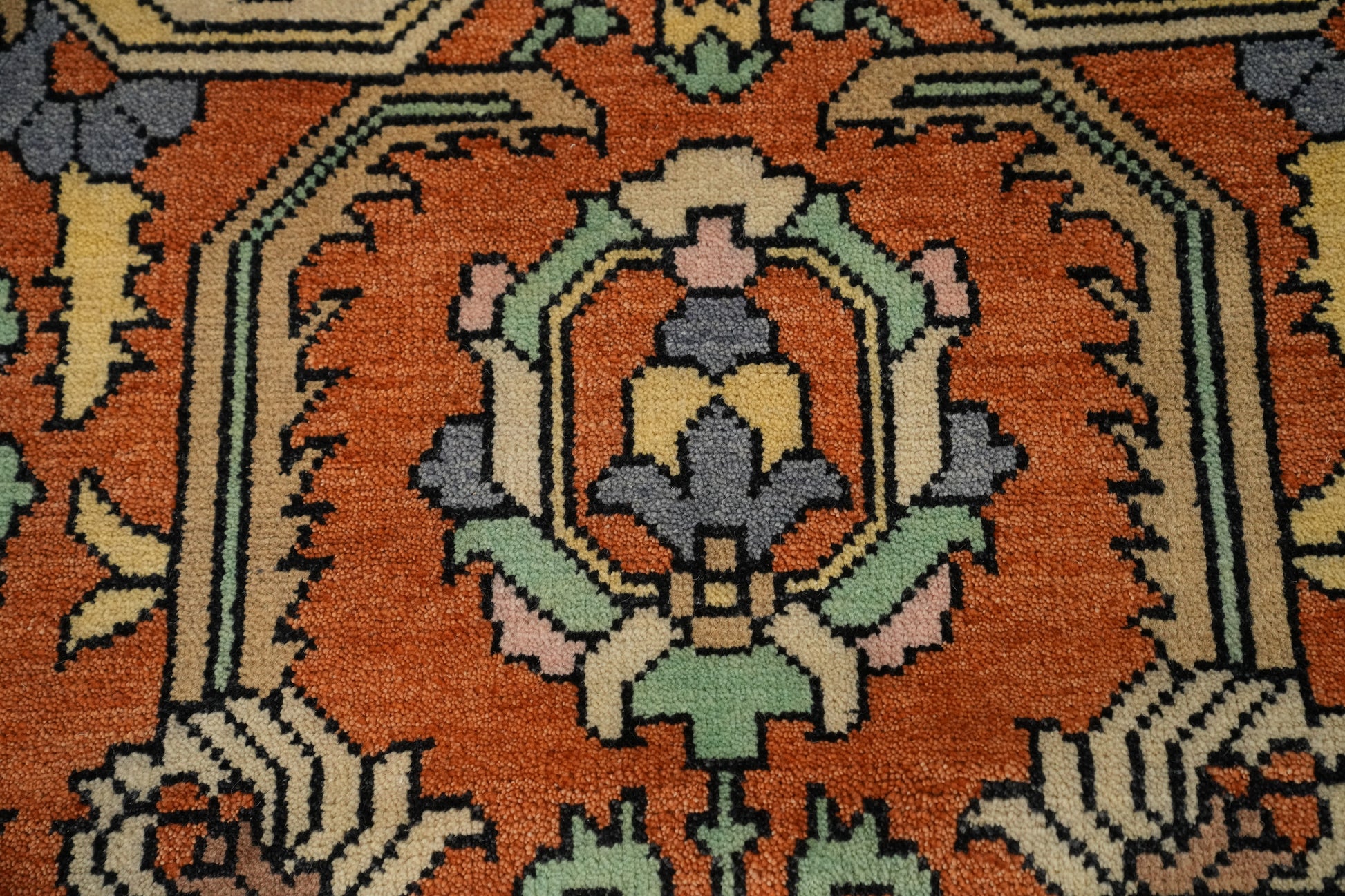 A Beautiful Genuine India Oushak rug is Hand Knotted by skillful weavers in India with 100% Wool Material. This rug is in New, First Quality condition. dimensions are 10' 0'' X 7' 10'' in foot and  305 X 239 in centimeter. the primary color is Oranges & Rust.