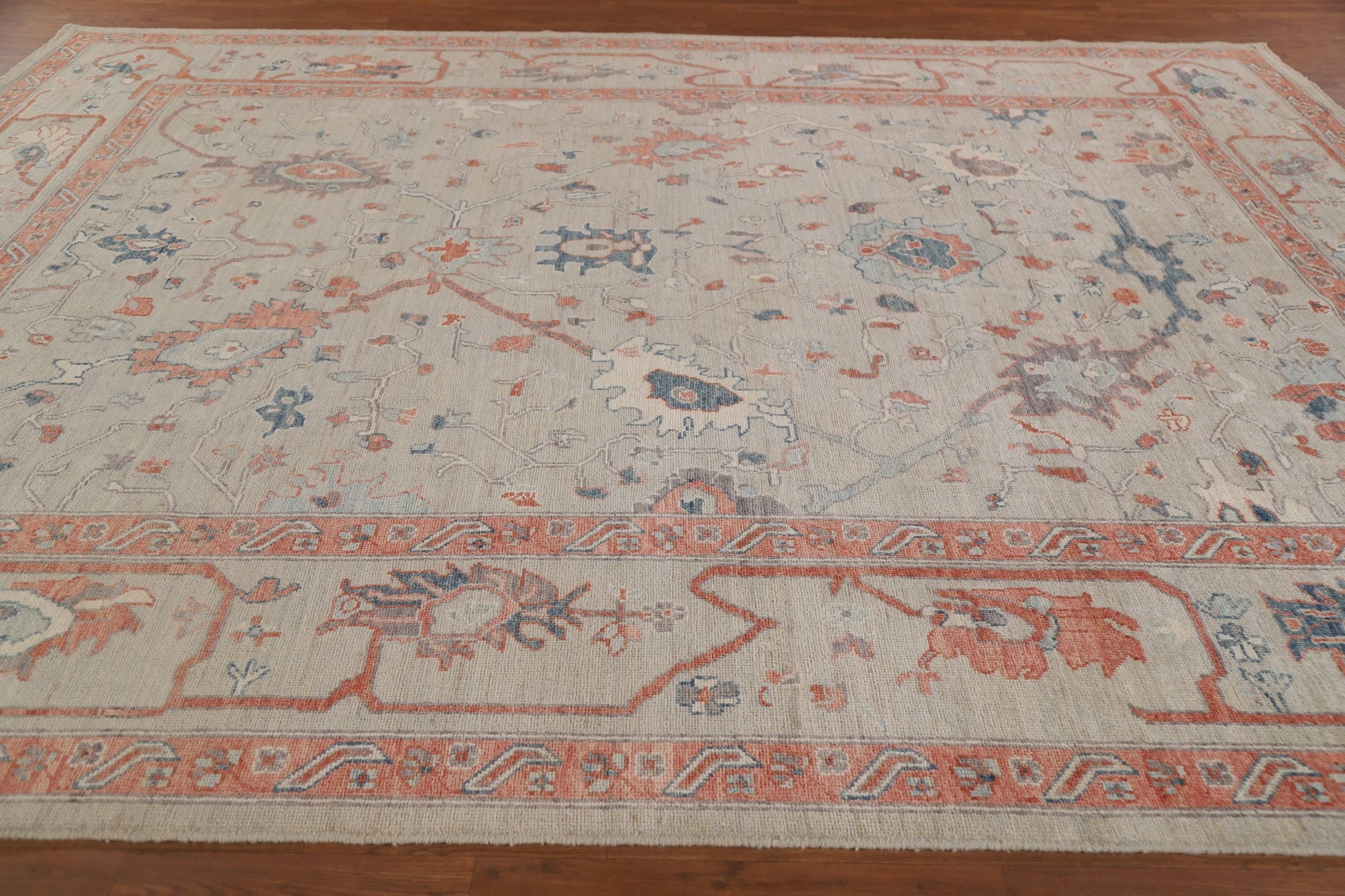 A Beautiful Genuine Turkey Oushak rug is Hand Knotted by skillful weavers in Turkey with 100% Wool Material. This rug is in New, First Quality condition. dimensions are 12' 0'' X 9' 2'' in foot and 366 X 279 in centimeter. the primary color is Beige & Ivories.