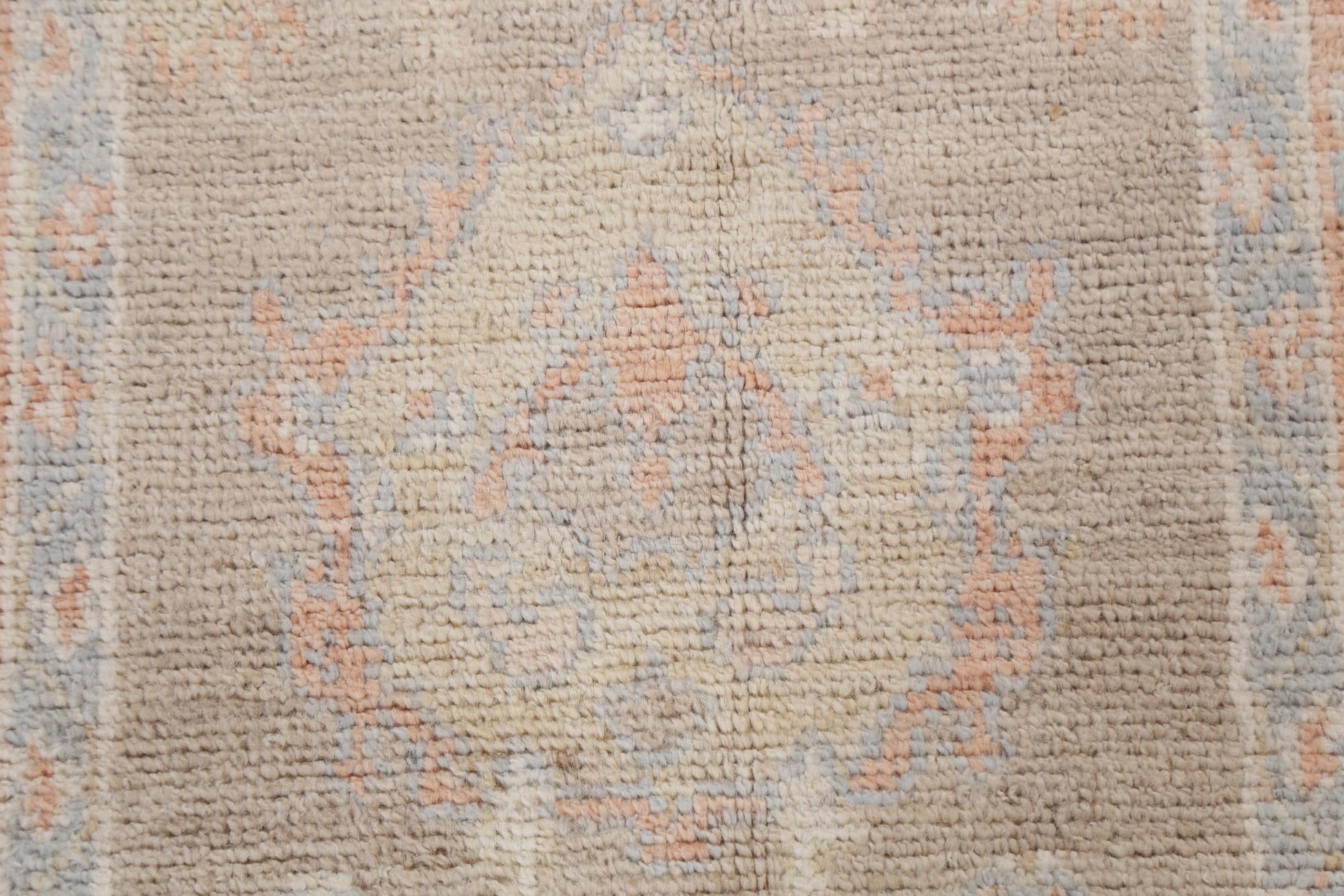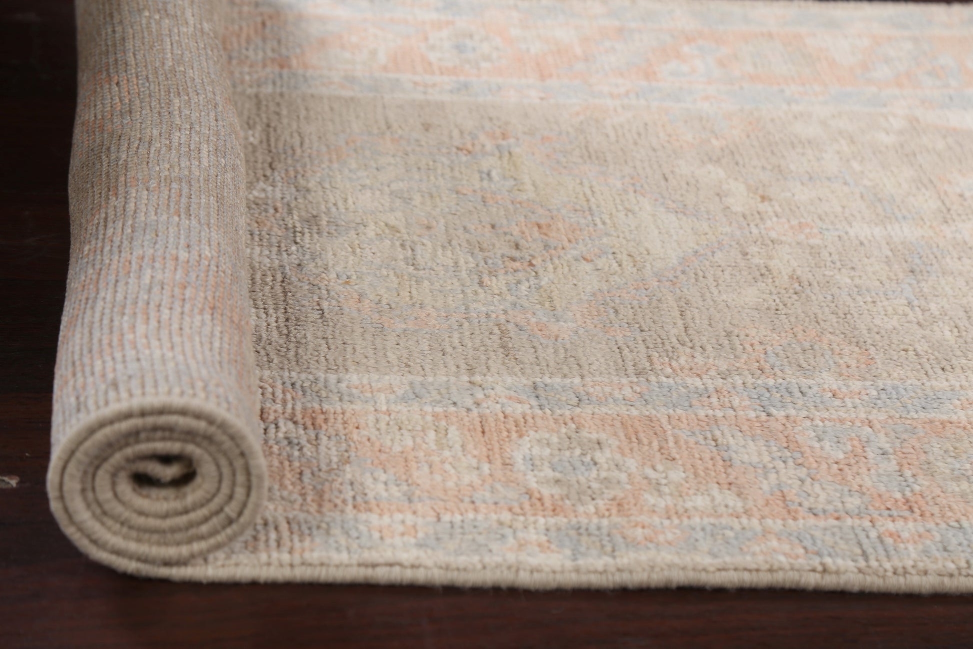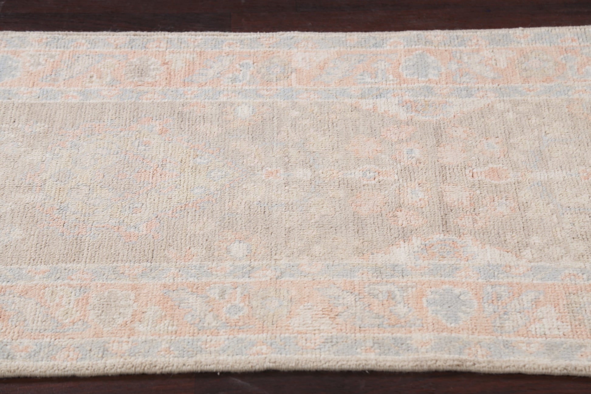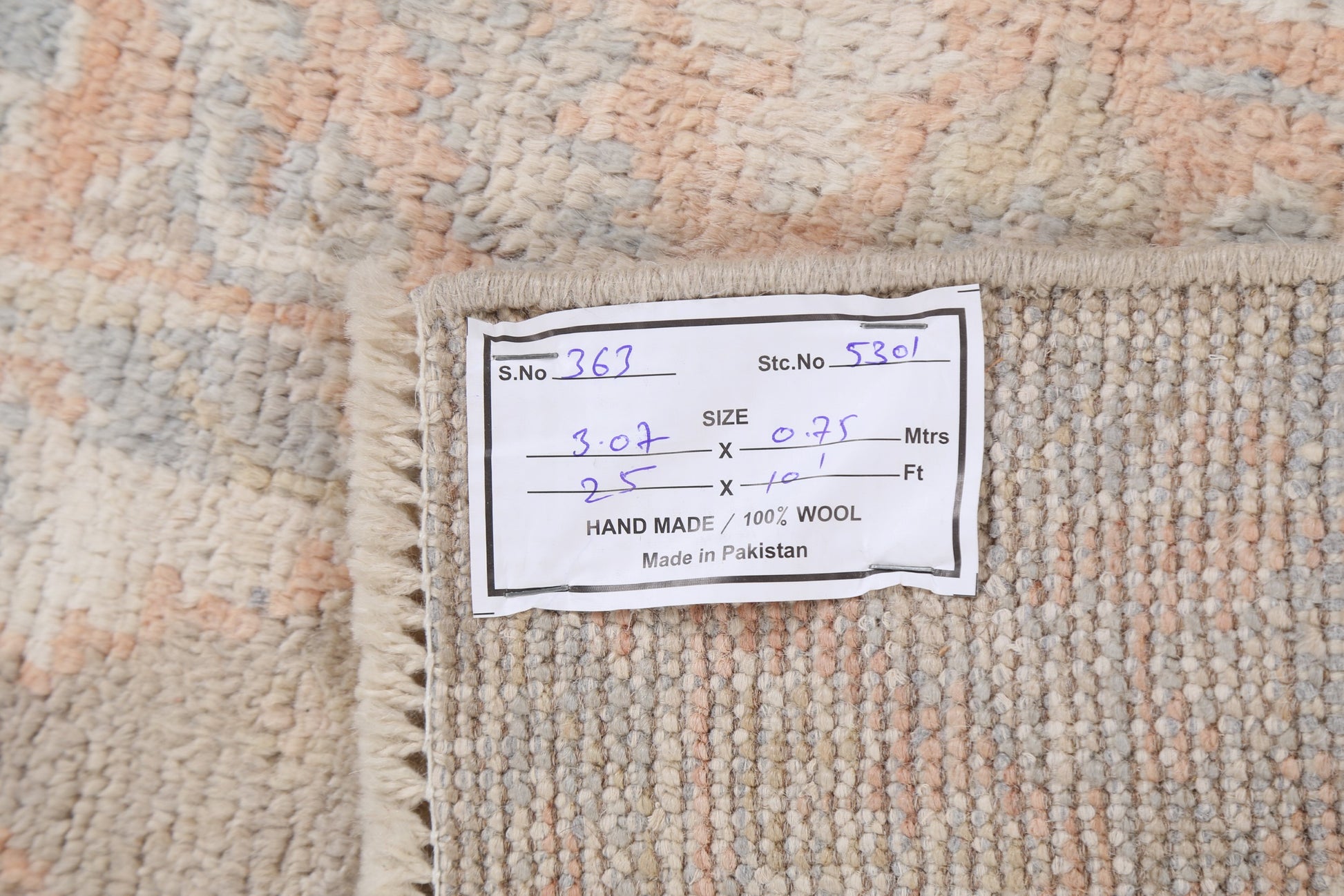 A Beautiful Genuine Turkey Oushak rug is Hand Knotted by skillful weavers in Turkey with 100% Wool Material. This rug is in New, First Quality condition. dimensions are 10' 1'' X 2' 5'' in foot and 307 X 74 in centimeter. the primary color is Beige & Ivories.
