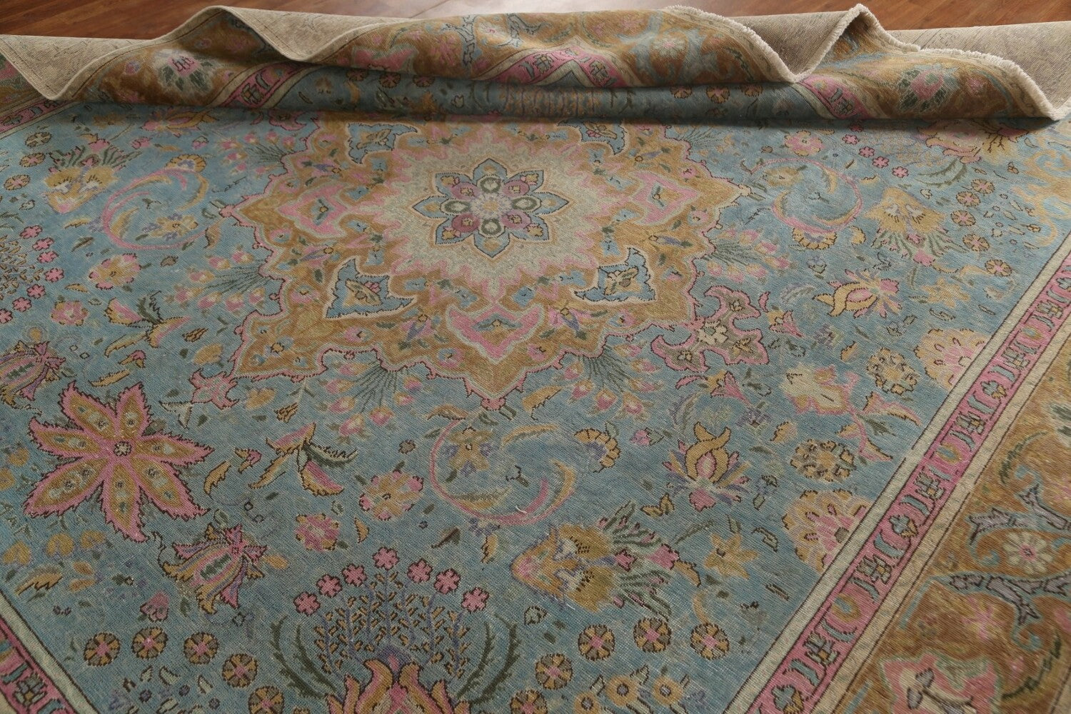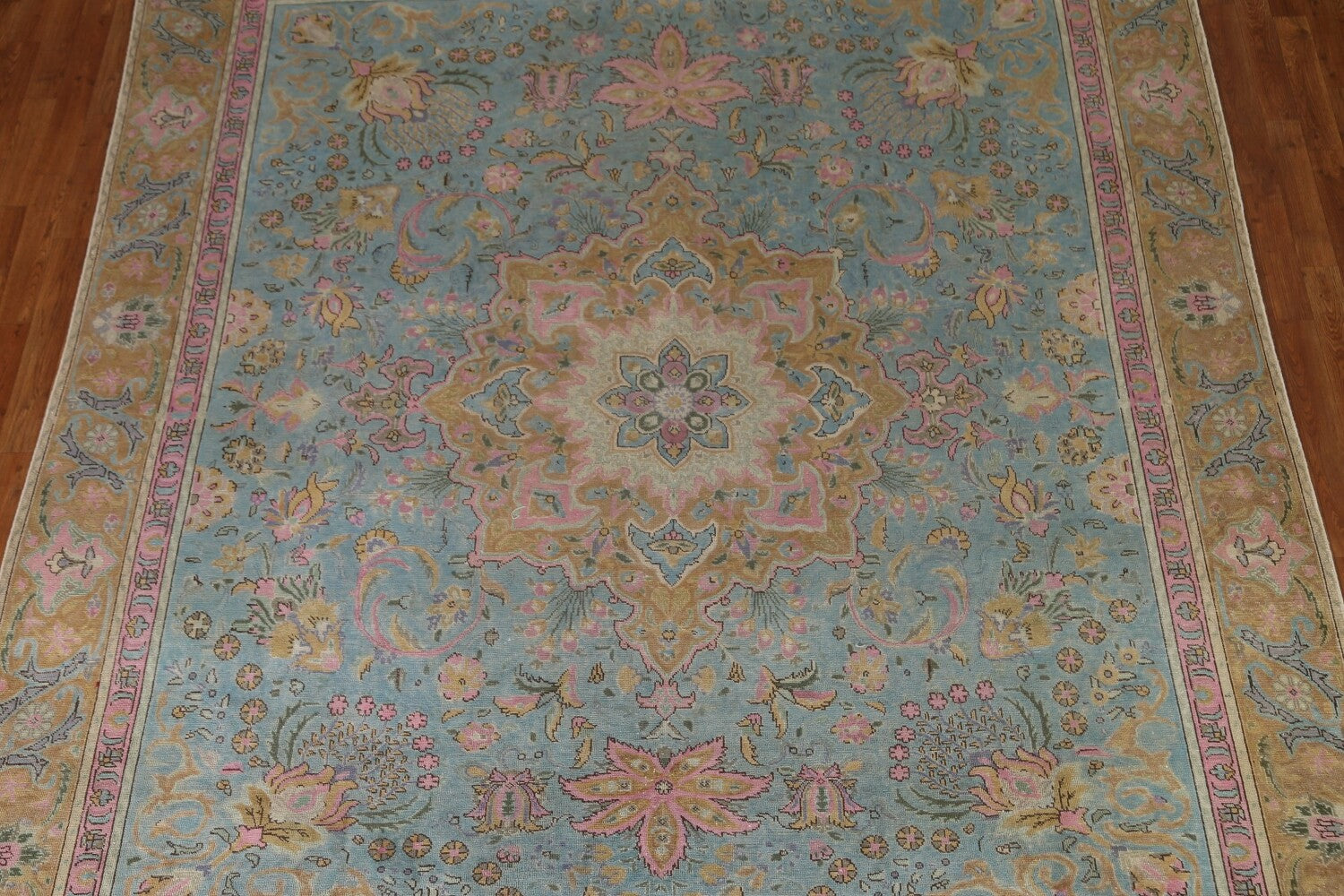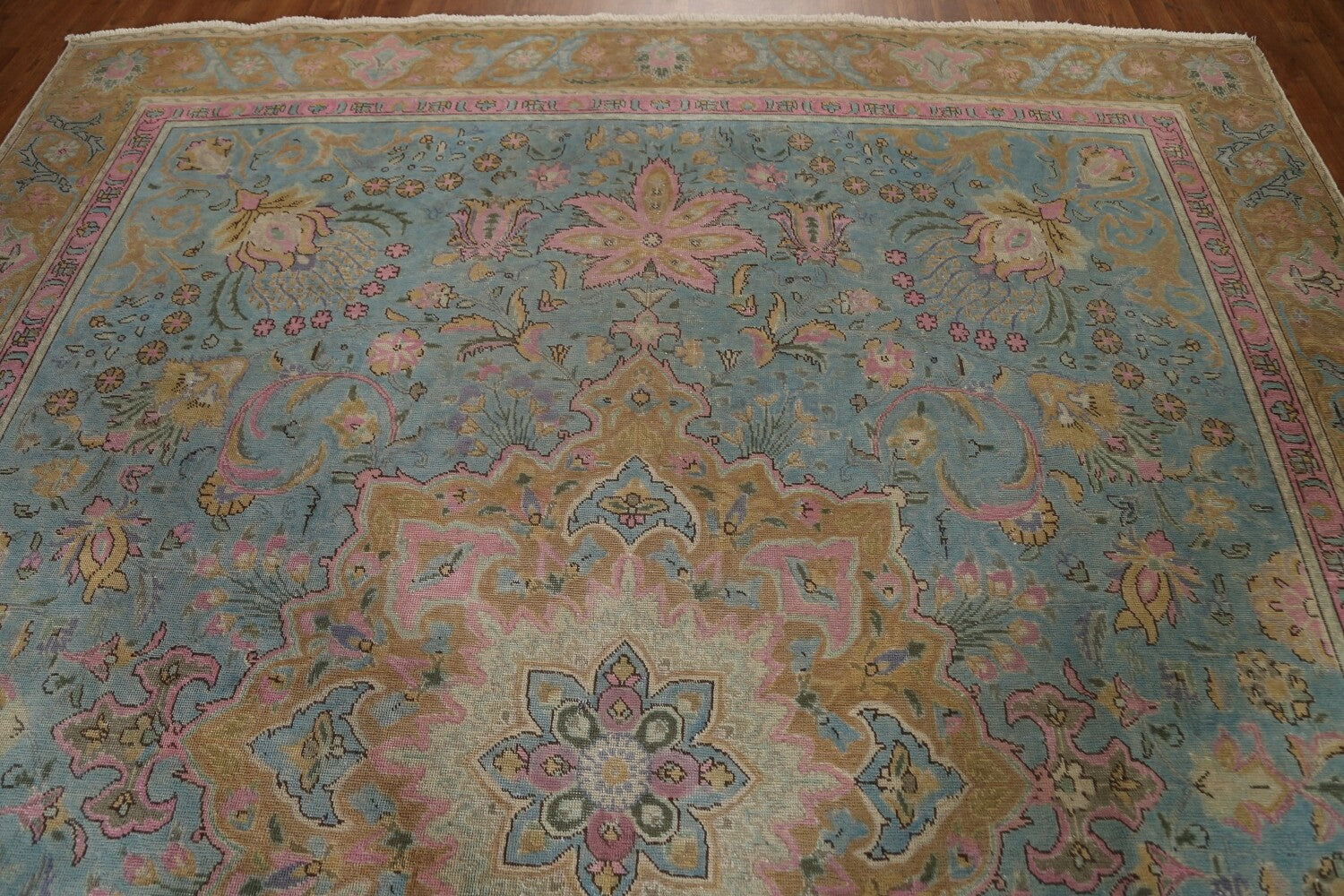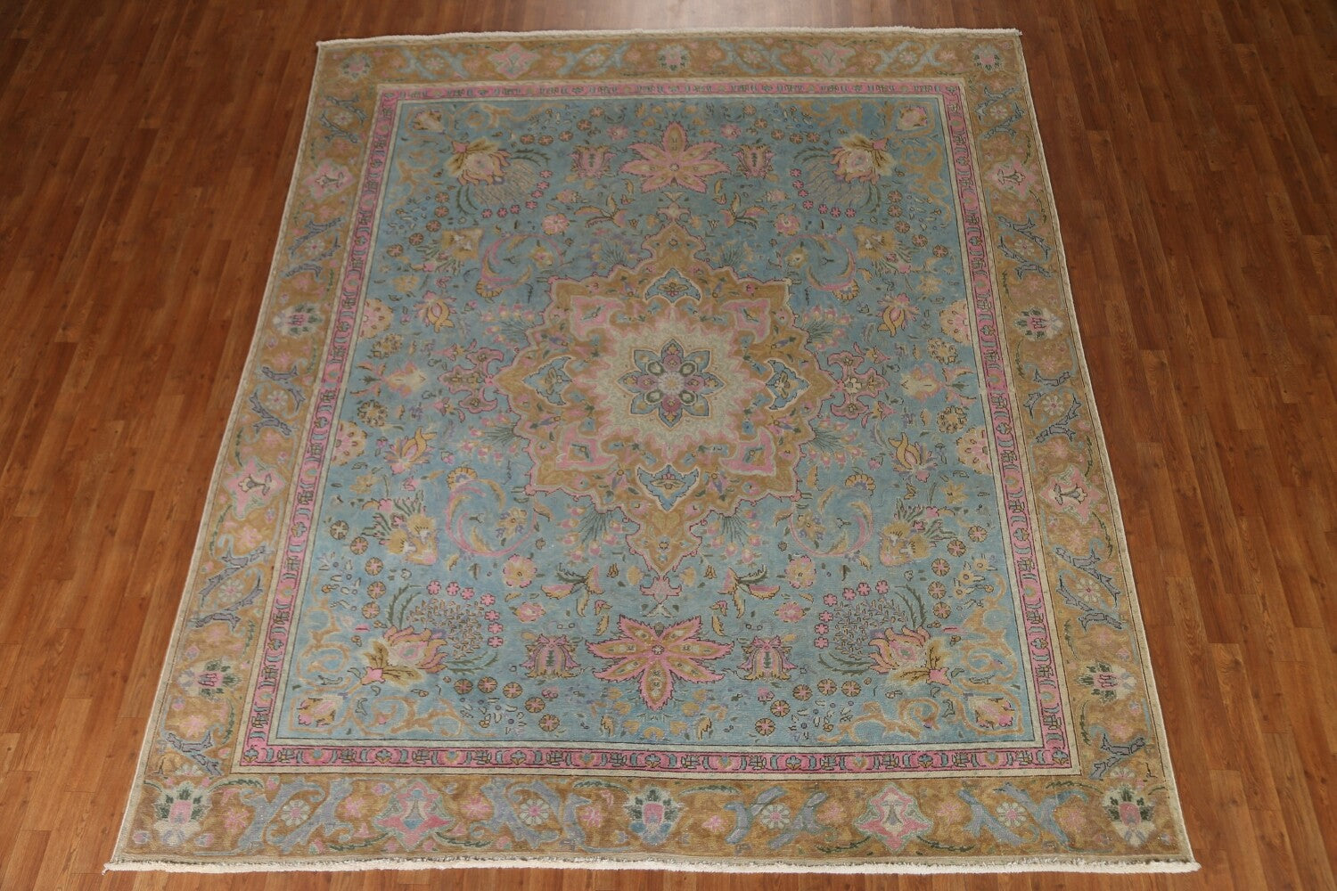 A Beautiful Genuine Persia ( Persia ) Tabriz rug is Hand Knotted by skillful weavers in Persia ( Persia ) with 100% Wool Material. This rug is in Very Good (Low Pile) condition. dimensions are 10' 3'' X 8' 11'' in foot and 312 X 272 in centimeter. the primary color is Navy Blue & Blues.