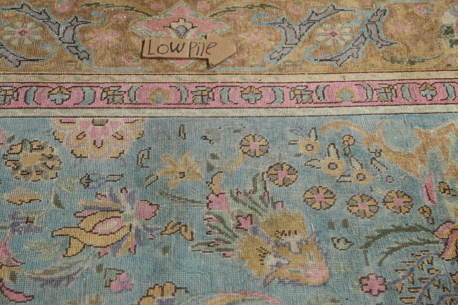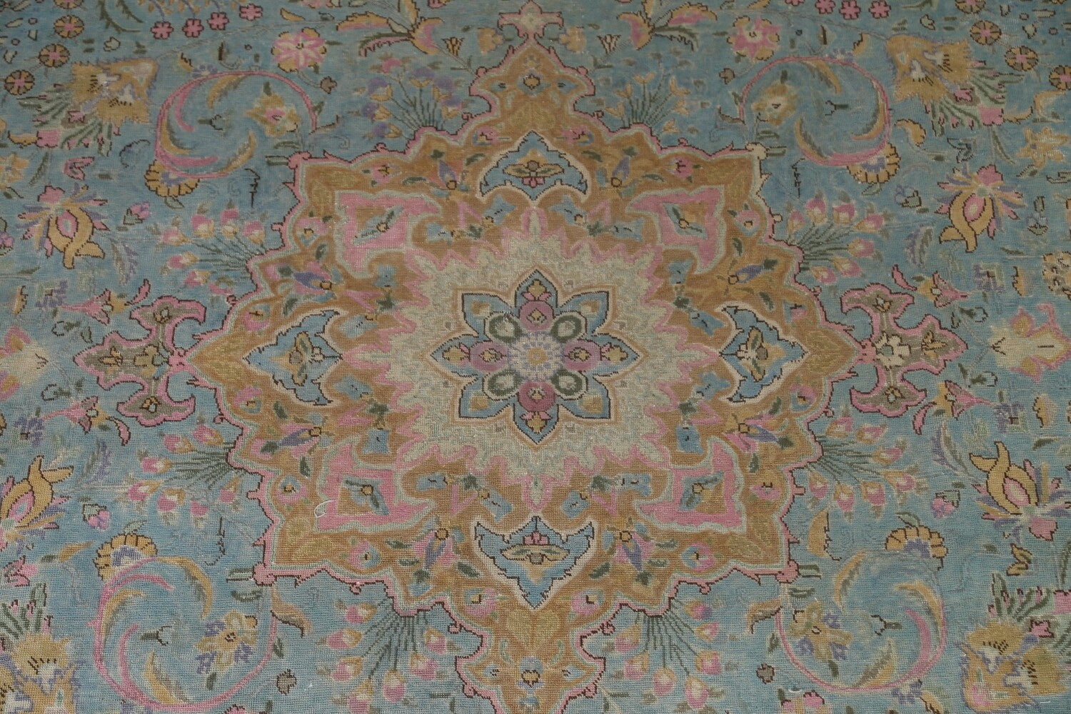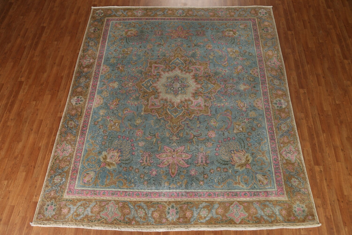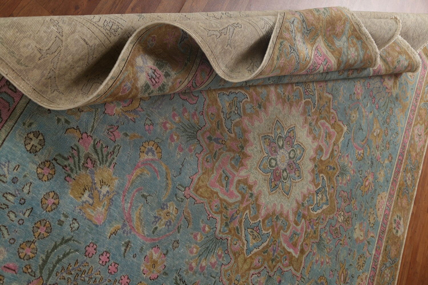 A Beautiful Genuine Persia ( Persia ) Tabriz rug is Hand Knotted by skillful weavers in Persia ( Persia ) with 100% Wool Material. This rug is in Very Good (Low Pile) condition. dimensions are 10' 3'' X 8' 11'' in foot and 312 X 272 in centimeter. the primary color is Navy Blue & Blues.