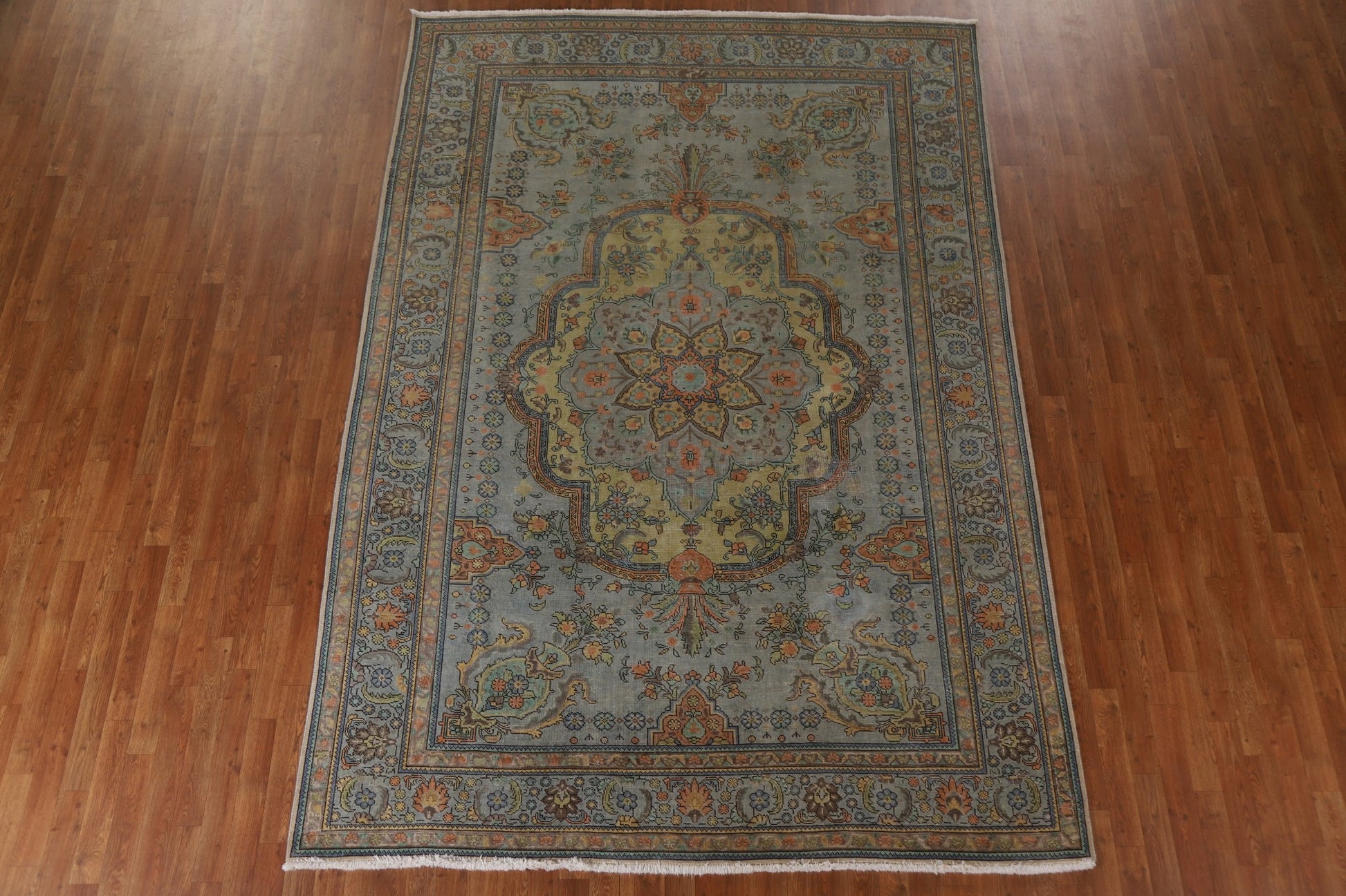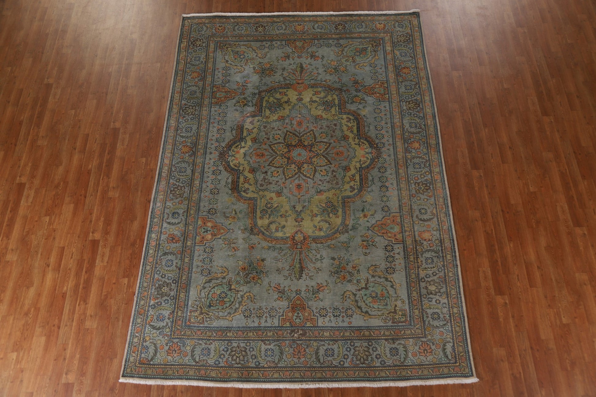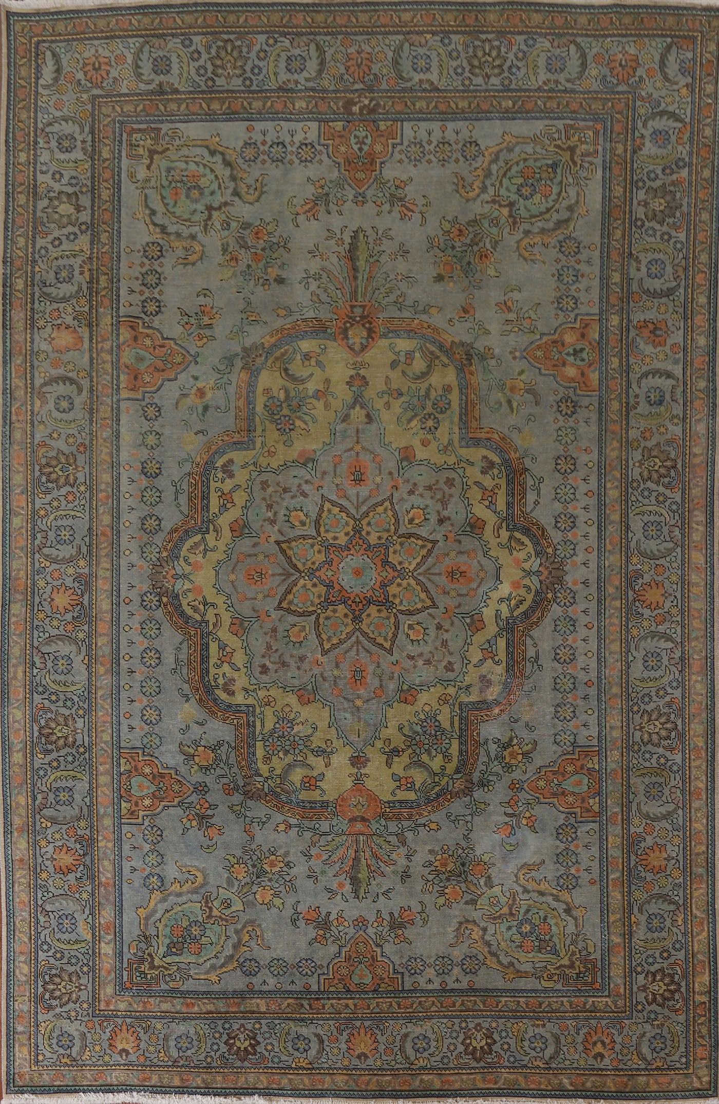 A Beautiful Genuine Persia ( Persia ) Tabriz rug is Hand Knotted by skillful weavers in Persia ( Persia ) with 100% Wool Material. This rug is in Very Good (Evenly Low Pile-small Repair) condition. dimensions are 10' 9'' X 7' 6'' in foot and 328 X 229 in centimeter. the primary color is Green.