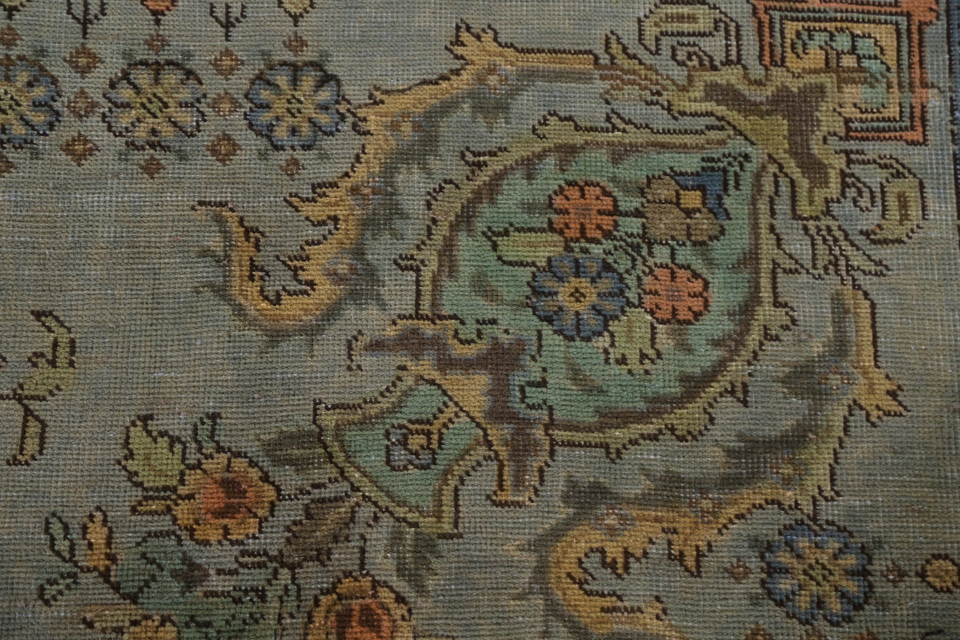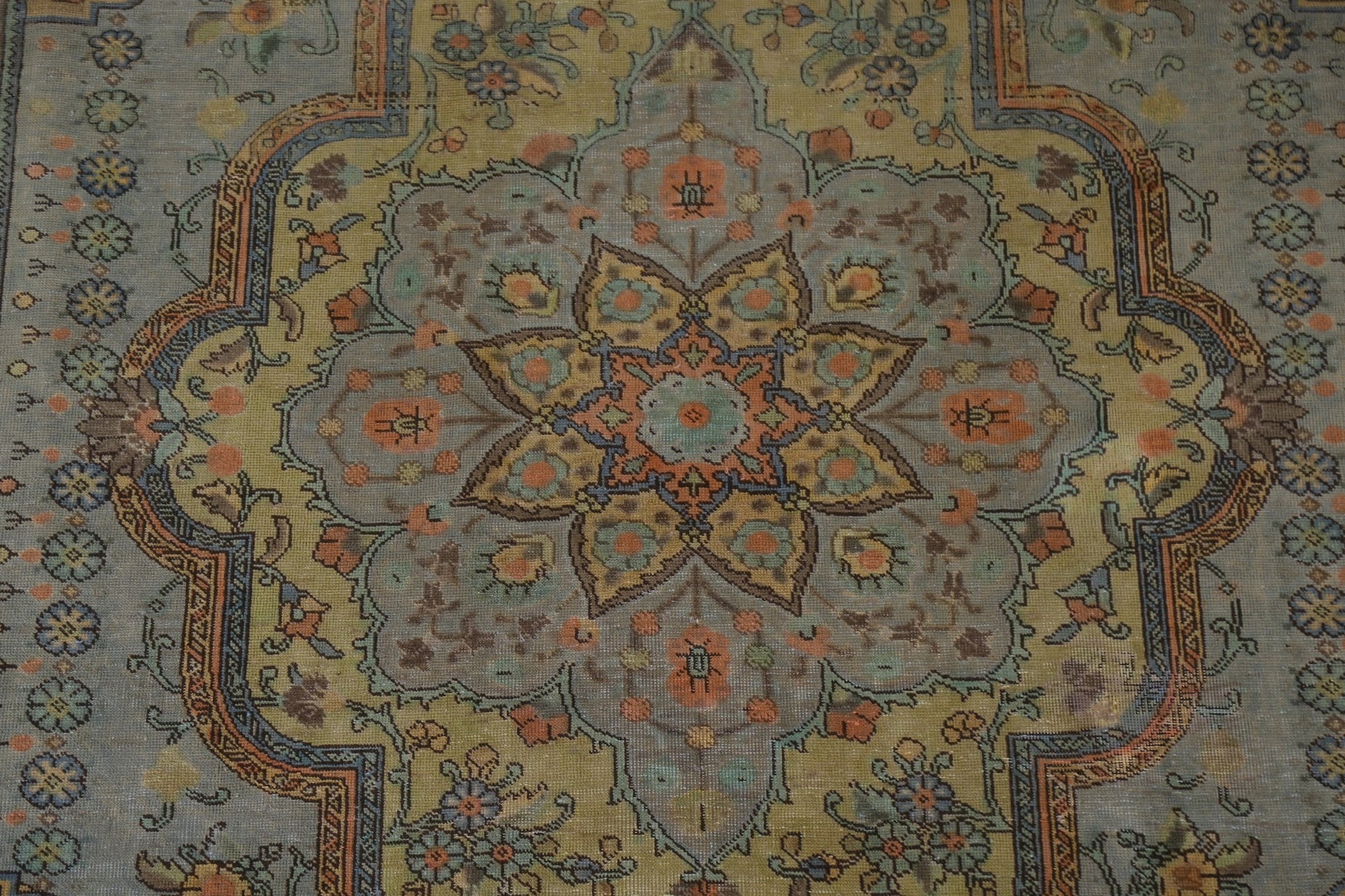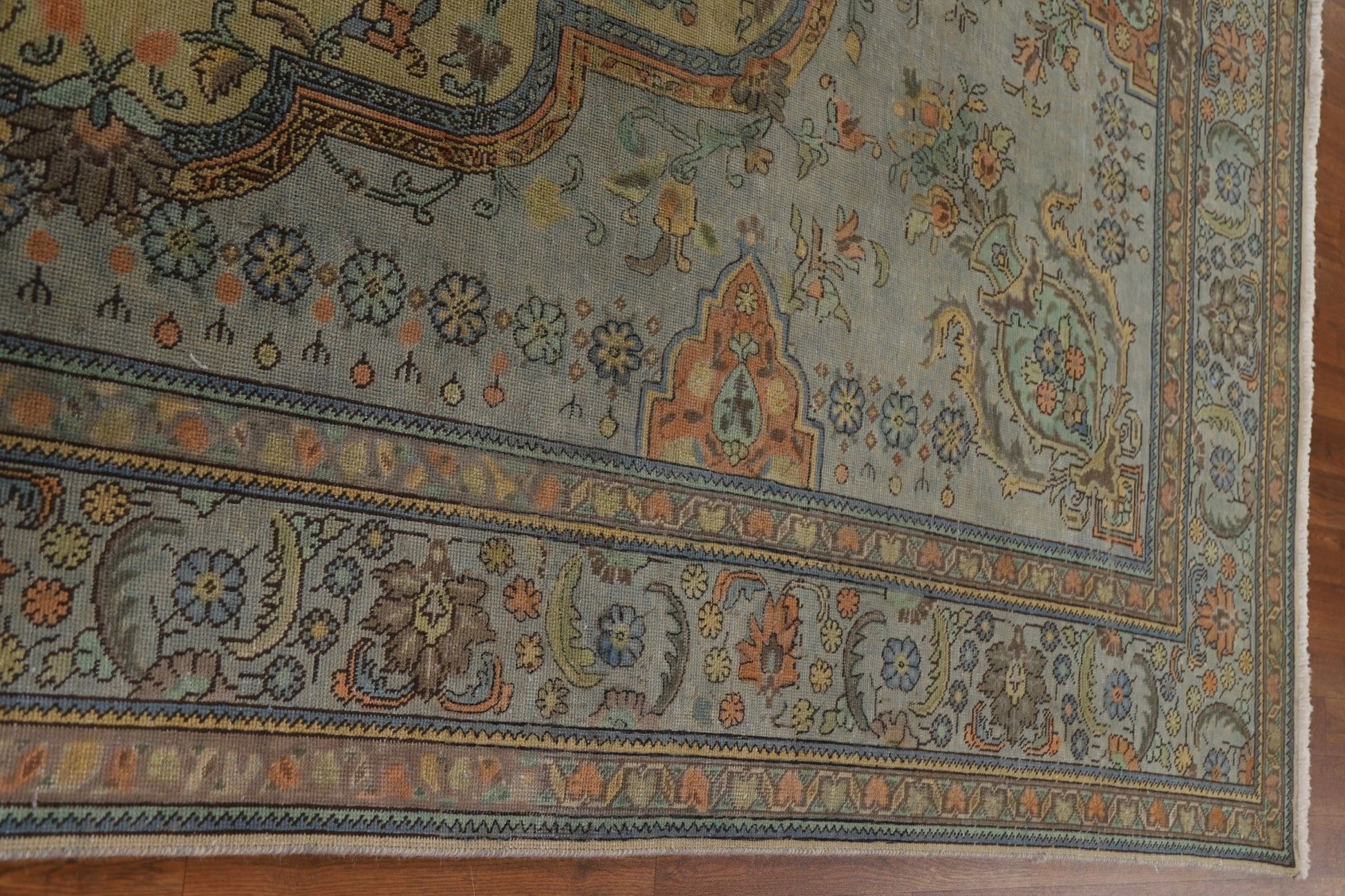 A Beautiful Genuine Persia ( Persia ) Tabriz rug is Hand Knotted by skillful weavers in Persia ( Persia ) with 100% Wool Material. This rug is in Very Good (Evenly Low Pile-small Repair) condition. dimensions are 10' 9'' X 7' 6'' in foot and 328 X 229 in centimeter. the primary color is Green.