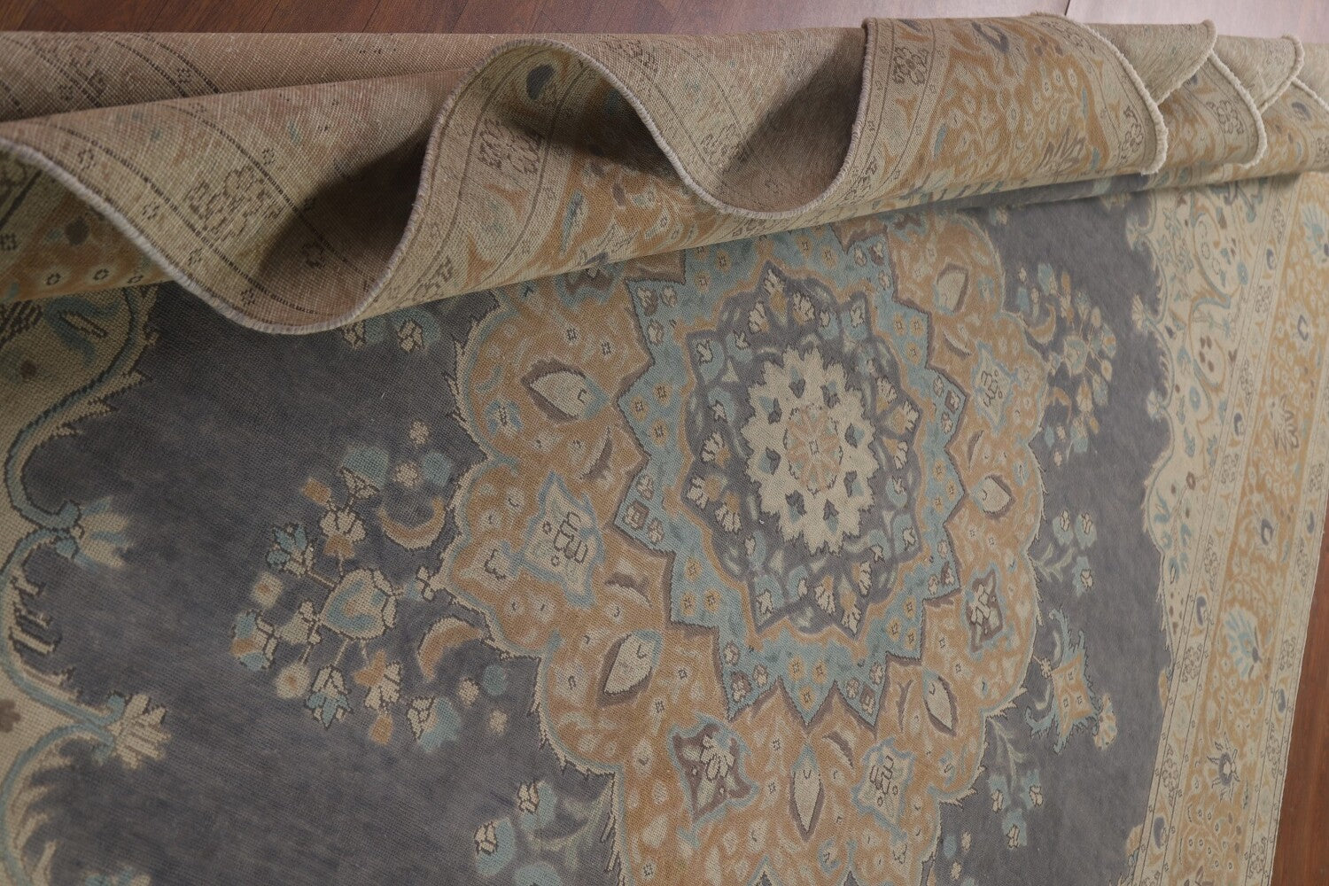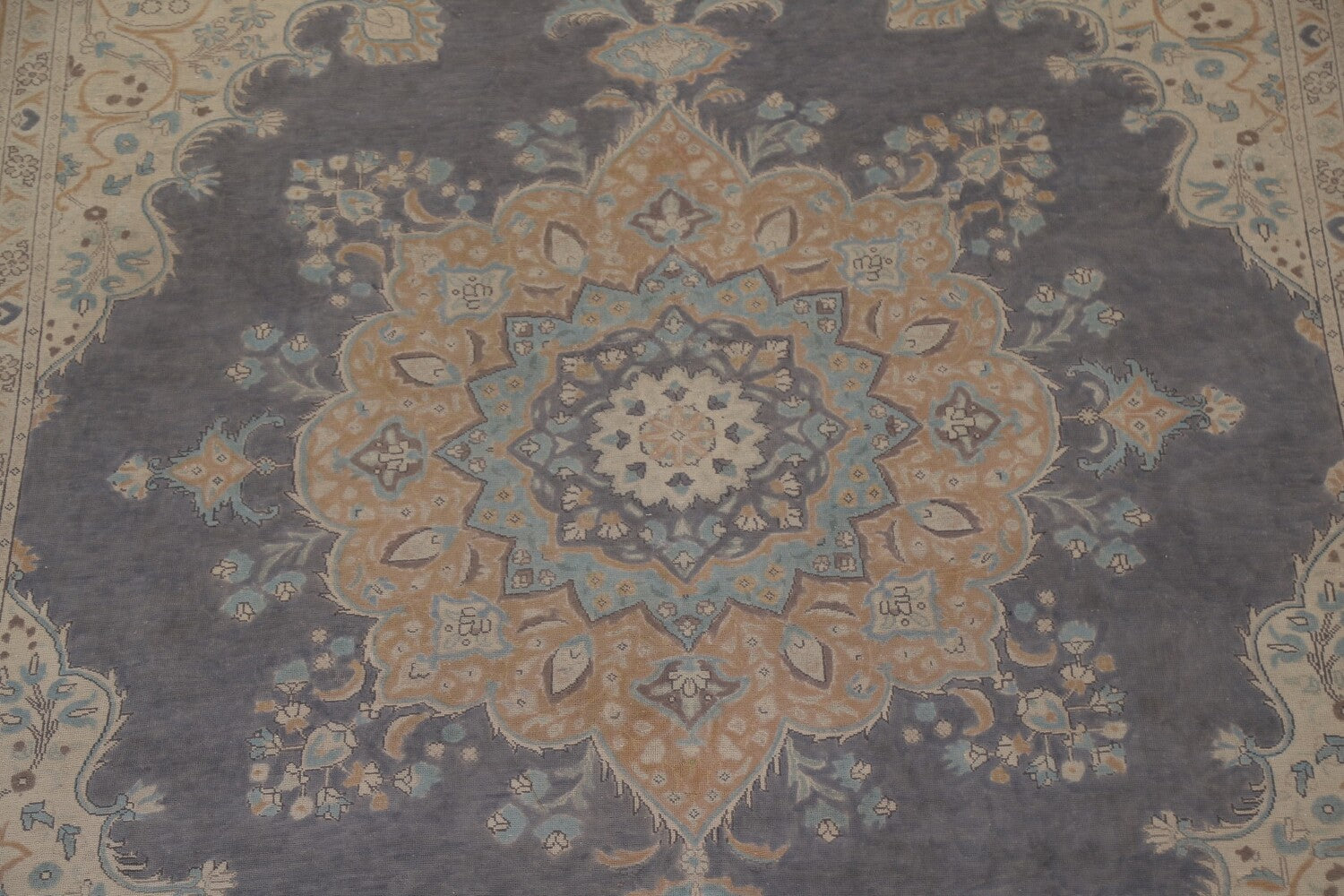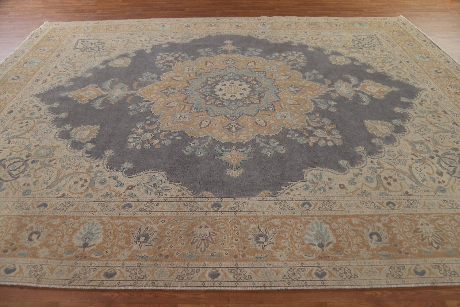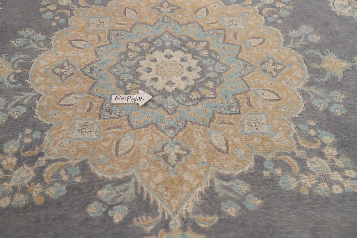 A Beautiful Genuine Persia ( Persia ) Tabriz rug is Hand Knotted by skillful weavers in Persia ( Persia ) with 100% Wool Material. This rug is in Very Good ( Low Pile- Repair) condition. dimensions are 12' 5'' X 9' 7'' in foot and 378 X 292 in centimeter. the primary color is Greys & Charcoal.