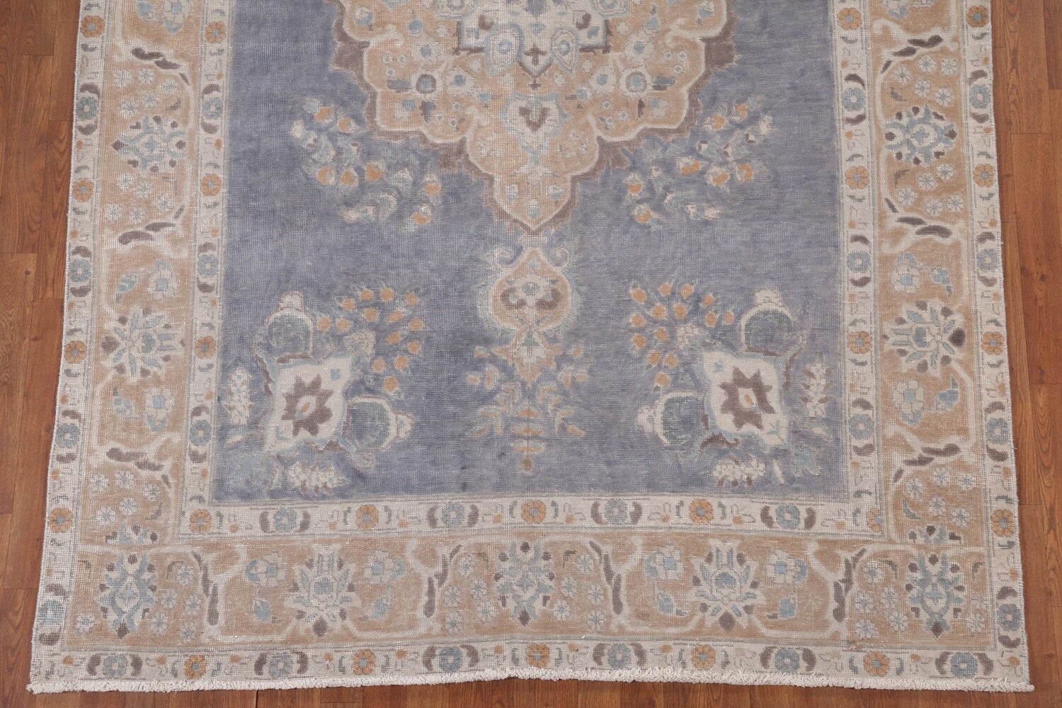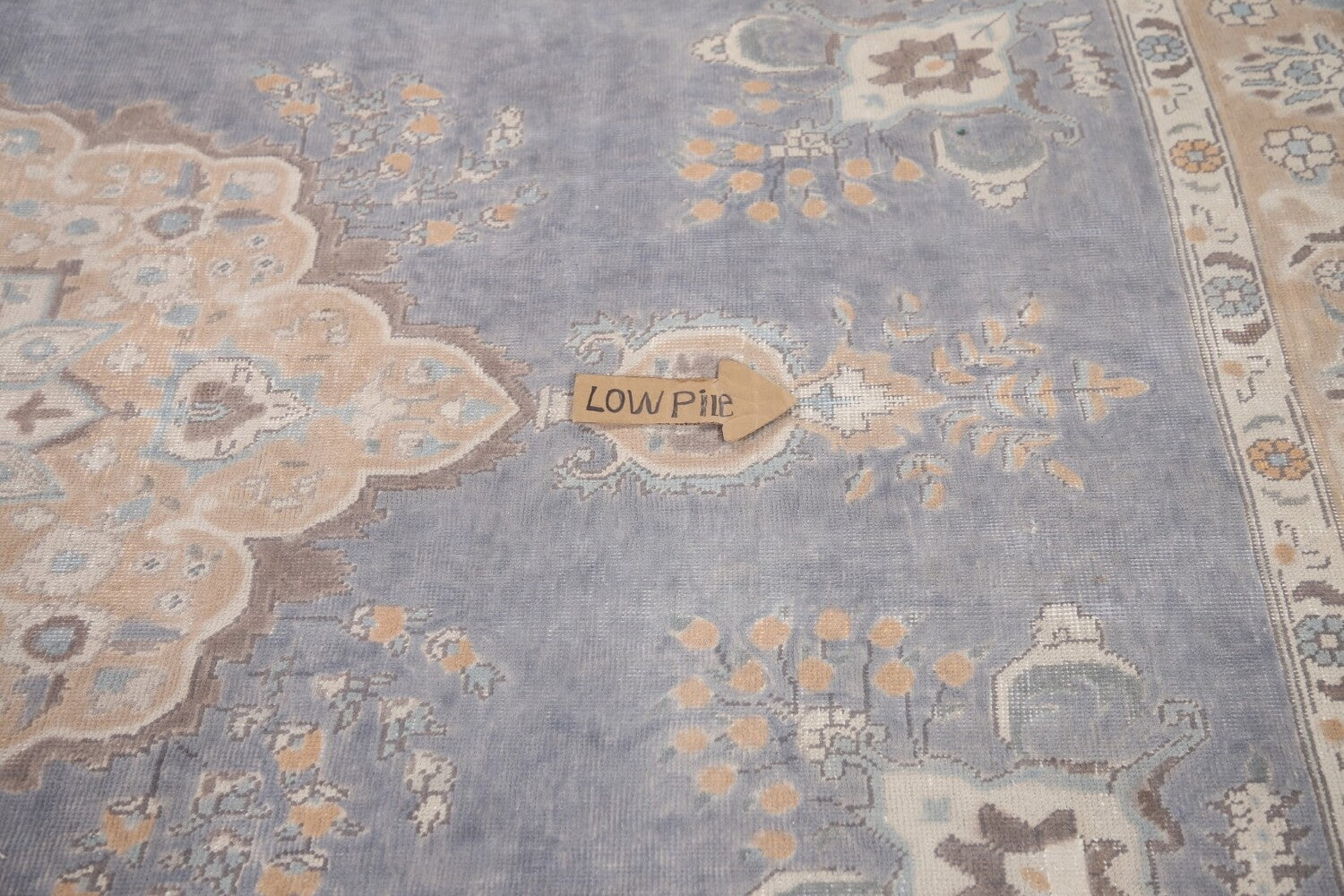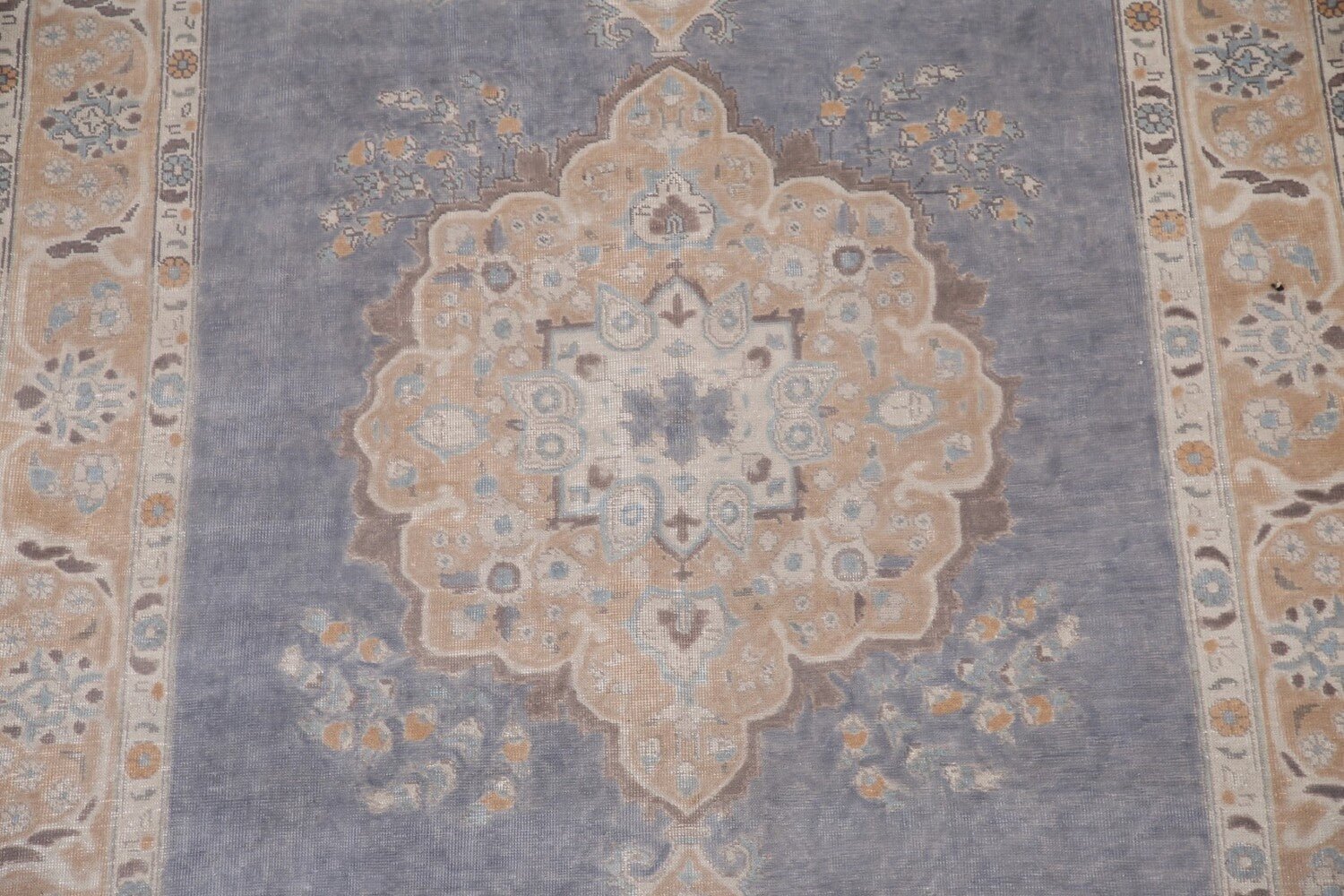 A Beautiful Genuine Persia ( Persia ) Tabriz rug is Hand Knotted by skillful weavers in Persia ( Persia ) with 100% Wool Material. This rug is in Very Good (Low Pile) condition. dimensions are 9' 11'' X 6' 5'' in foot and 302 X 196 in centimeter. the primary color is Navy Blue & Blues.