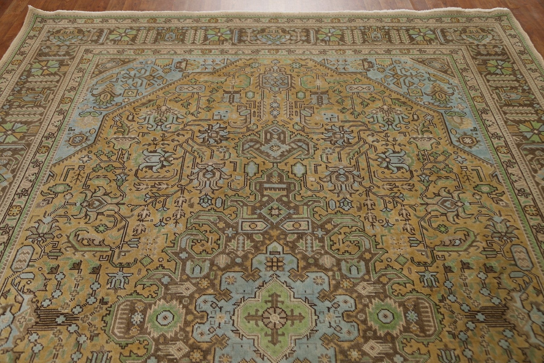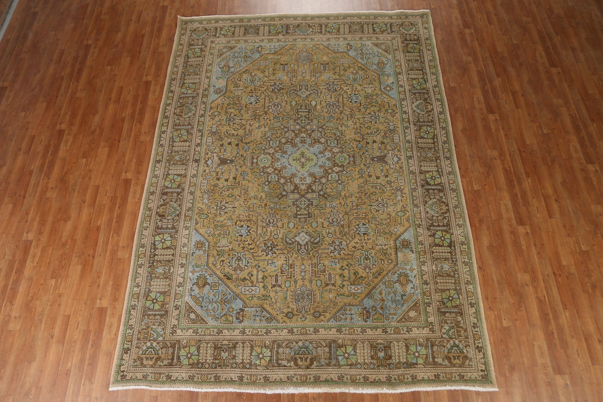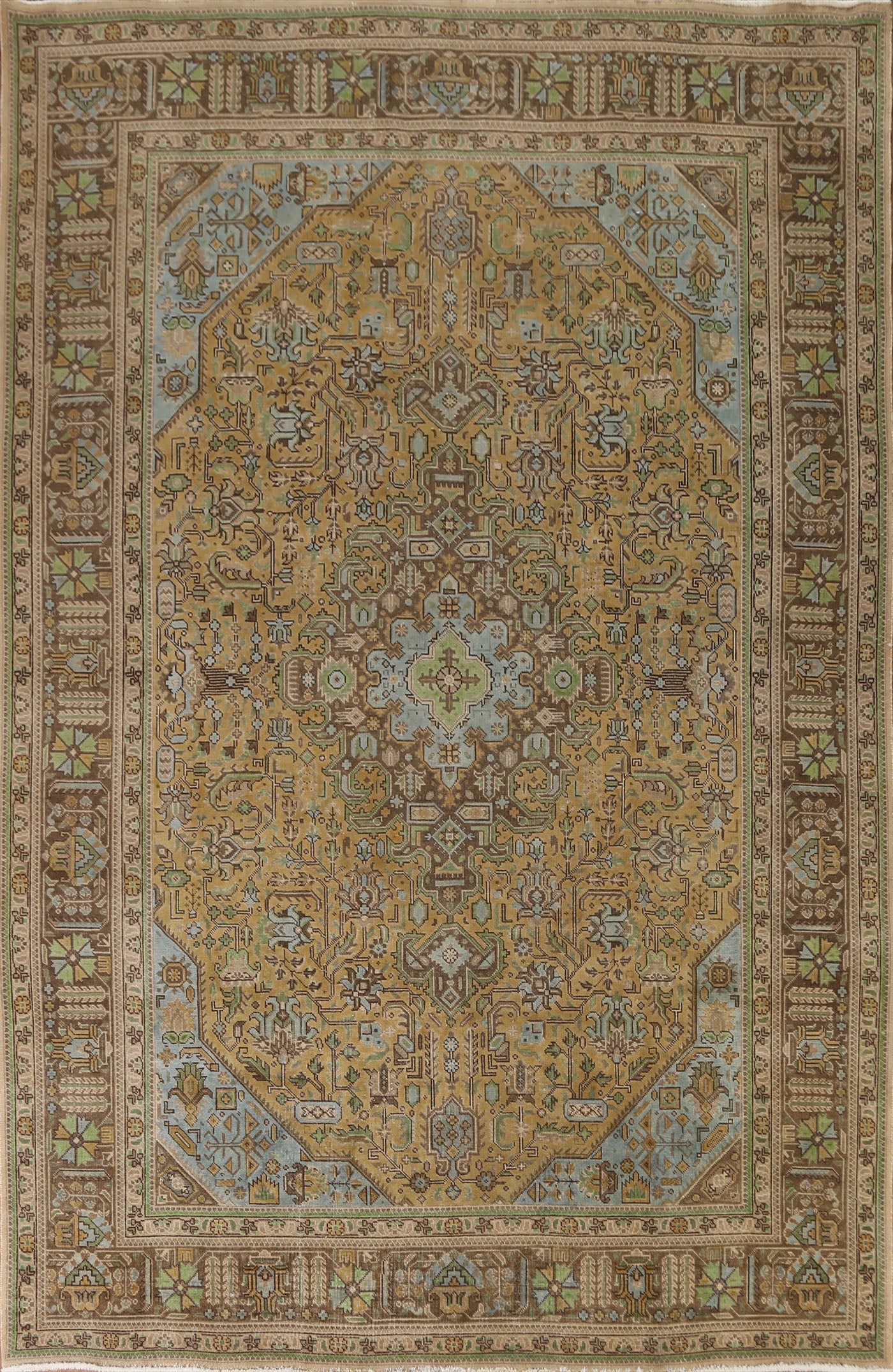 A Beautiful Genuine Persia ( Persia ) Tabriz rug is Hand Knotted by skillful weavers in Persia ( Persia ) with 100% Wool Material. This rug is in Very Good (Evenly Low Pile) condition. dimensions are 10' 10'' X 7' 10'' in foot and 330 X 239 in centimeter. the primary color is Yellow & Gold.