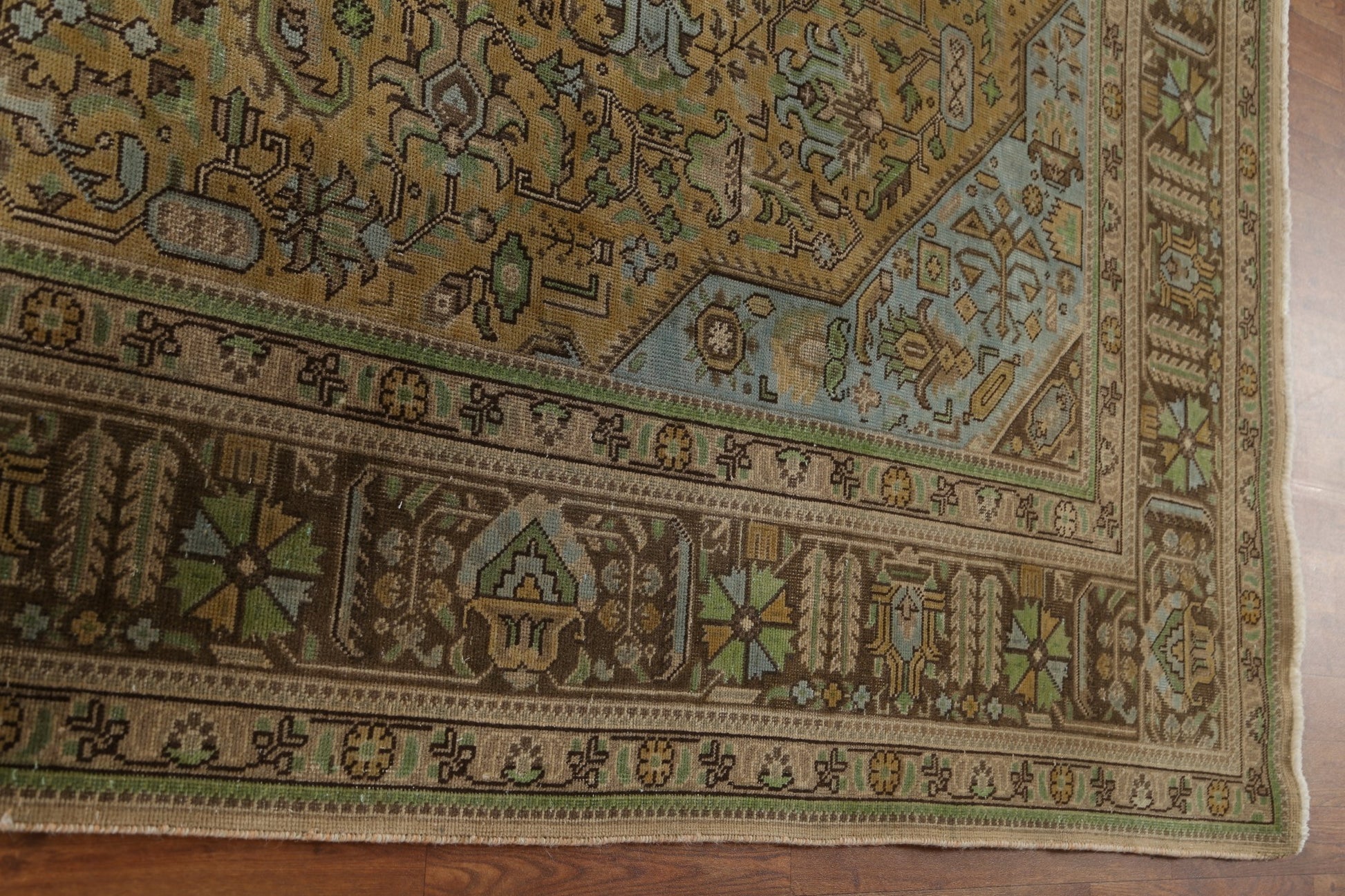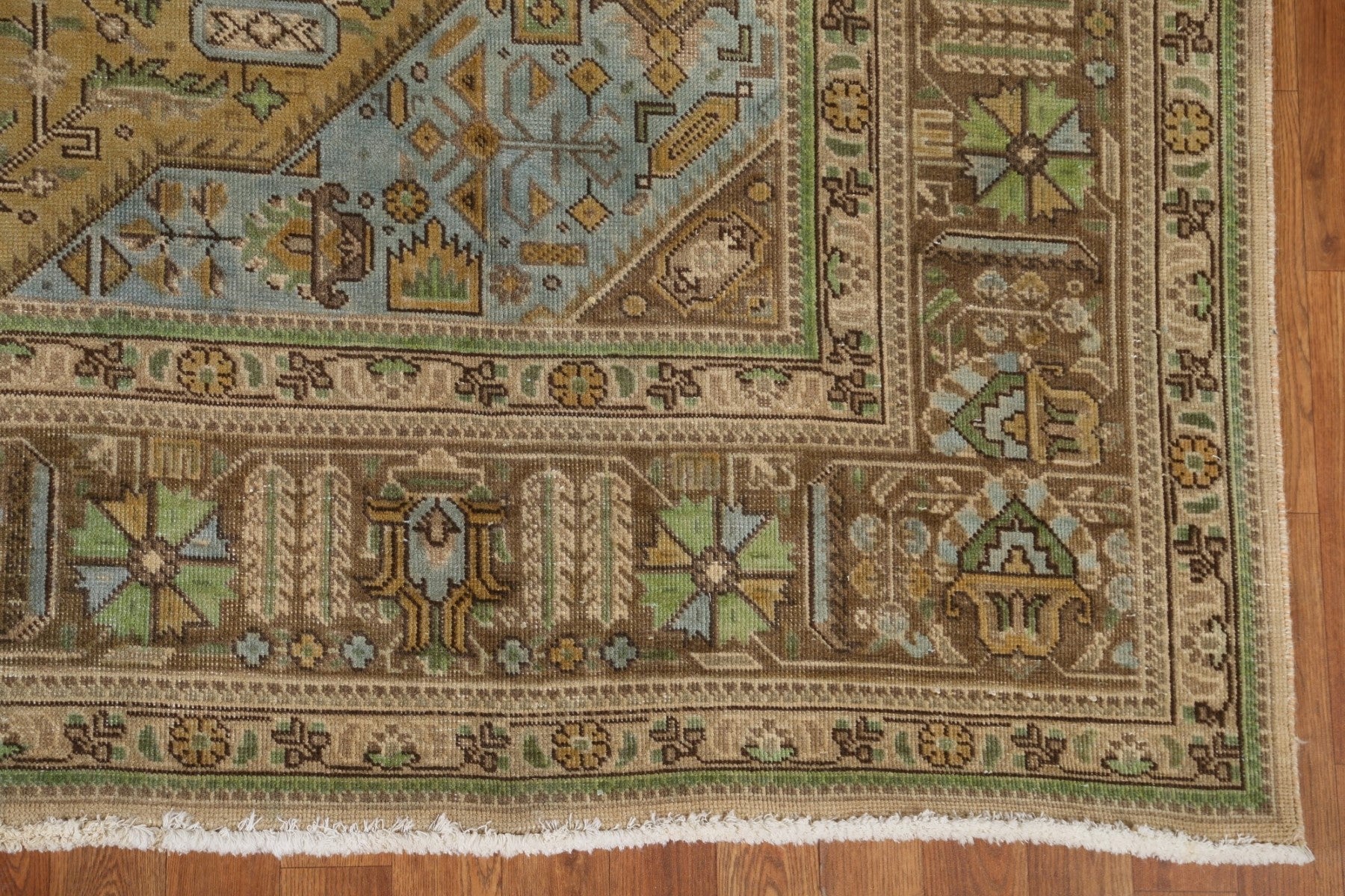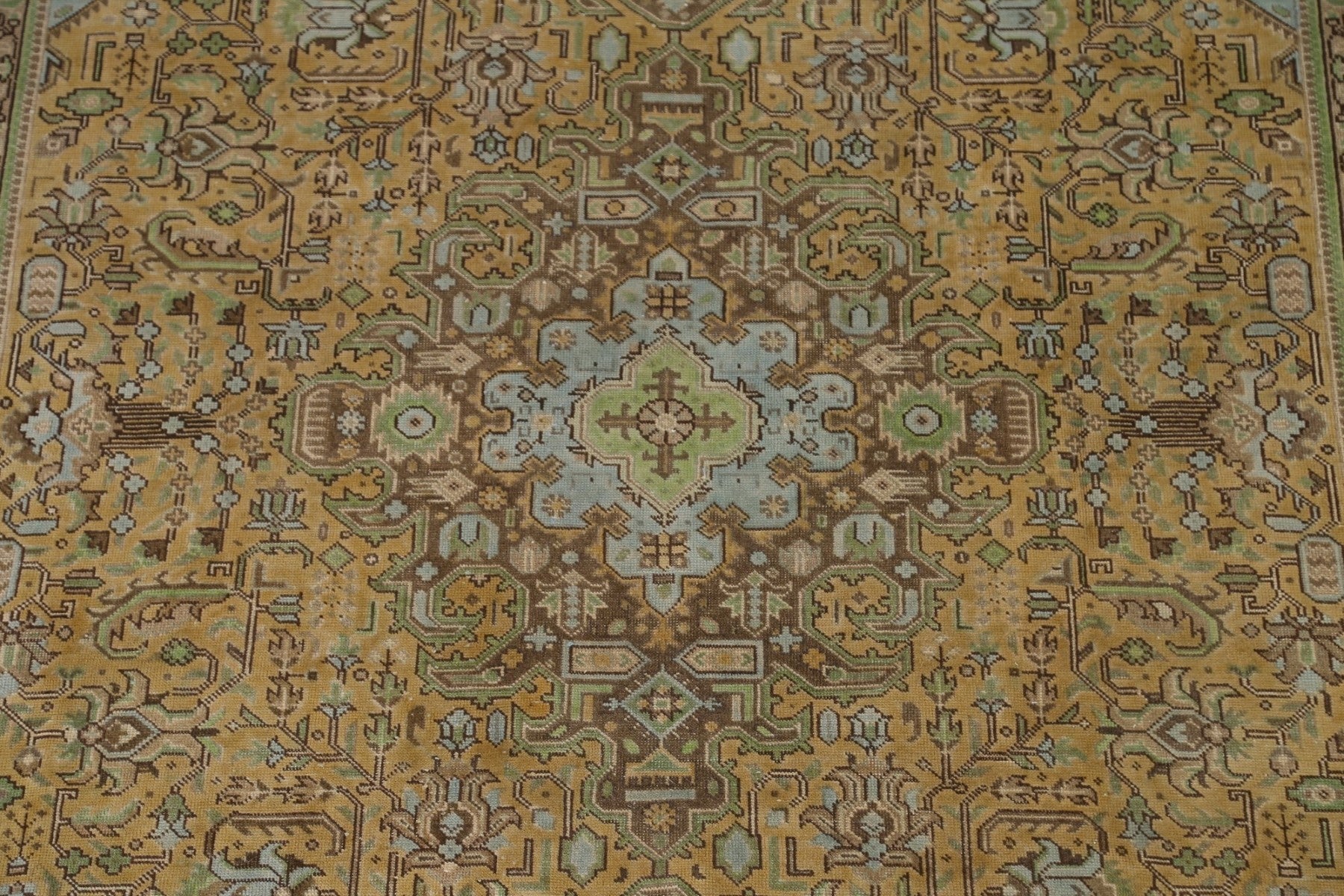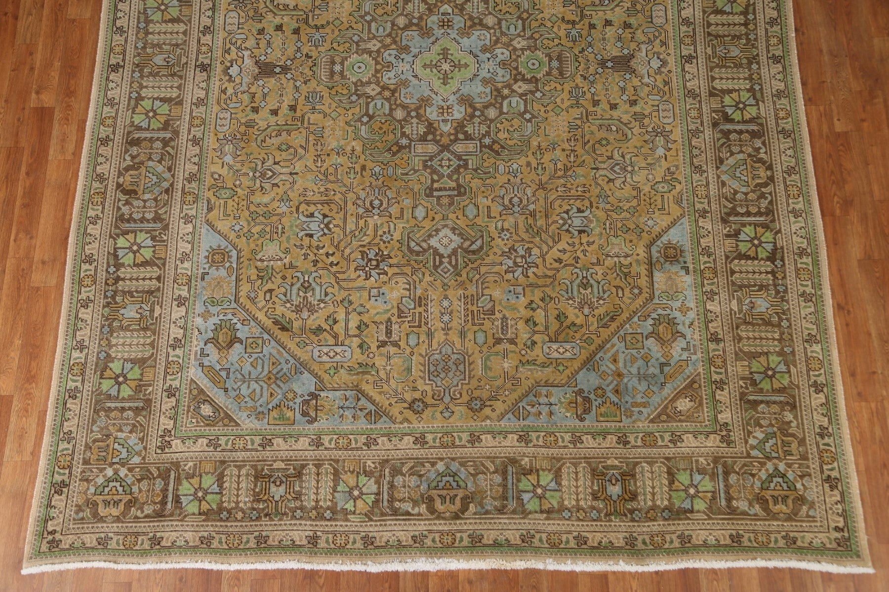 A Beautiful Genuine Persia ( Persia ) Tabriz rug is Hand Knotted by skillful weavers in Persia ( Persia ) with 100% Wool Material. This rug is in Very Good (Evenly Low Pile) condition. dimensions are 10' 10'' X 7' 10'' in foot and 330 X 239 in centimeter. the primary color is Yellow & Gold.