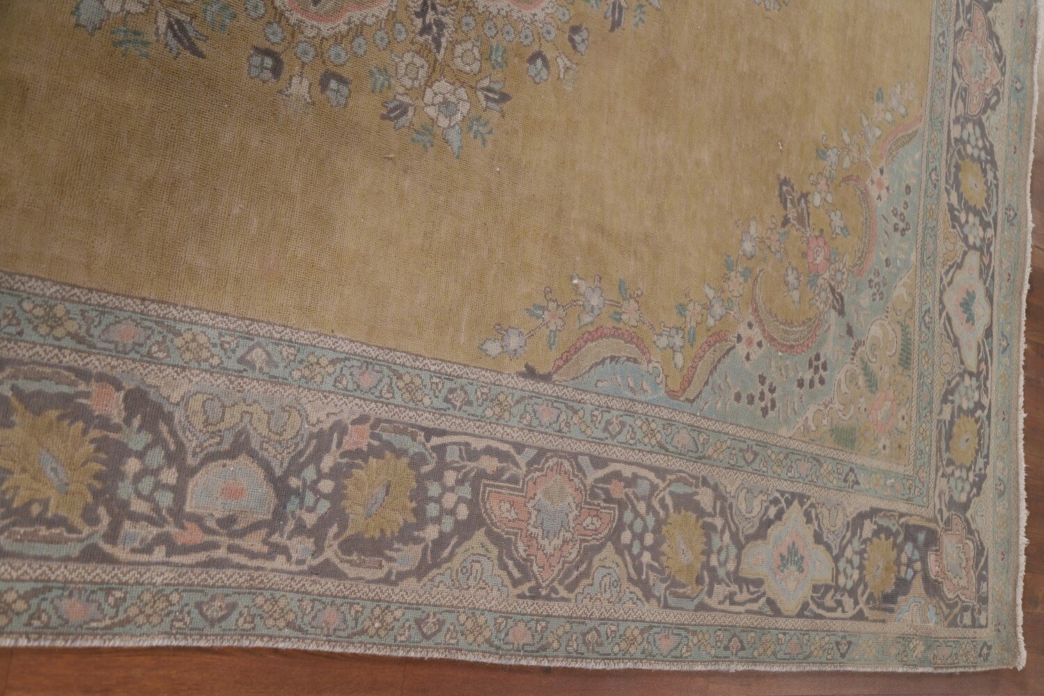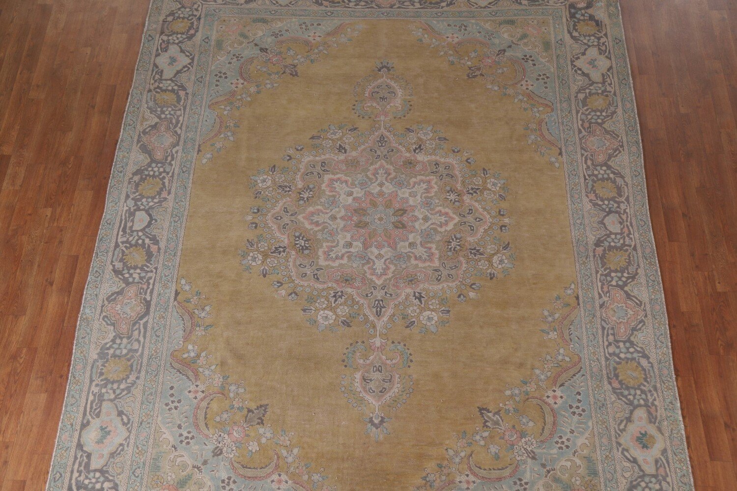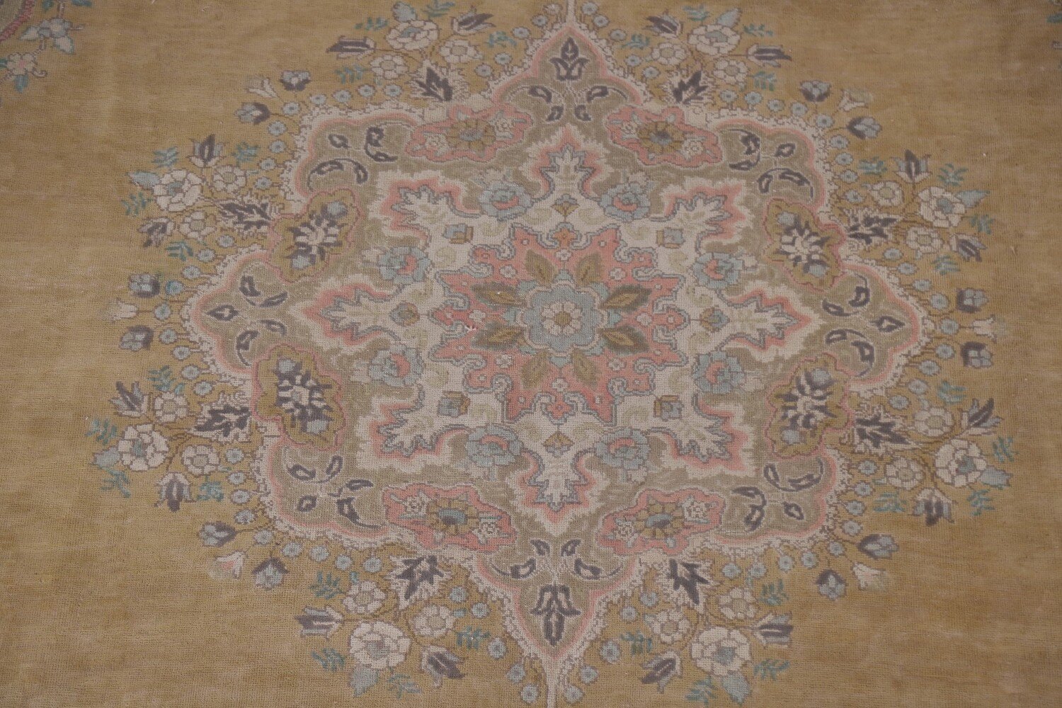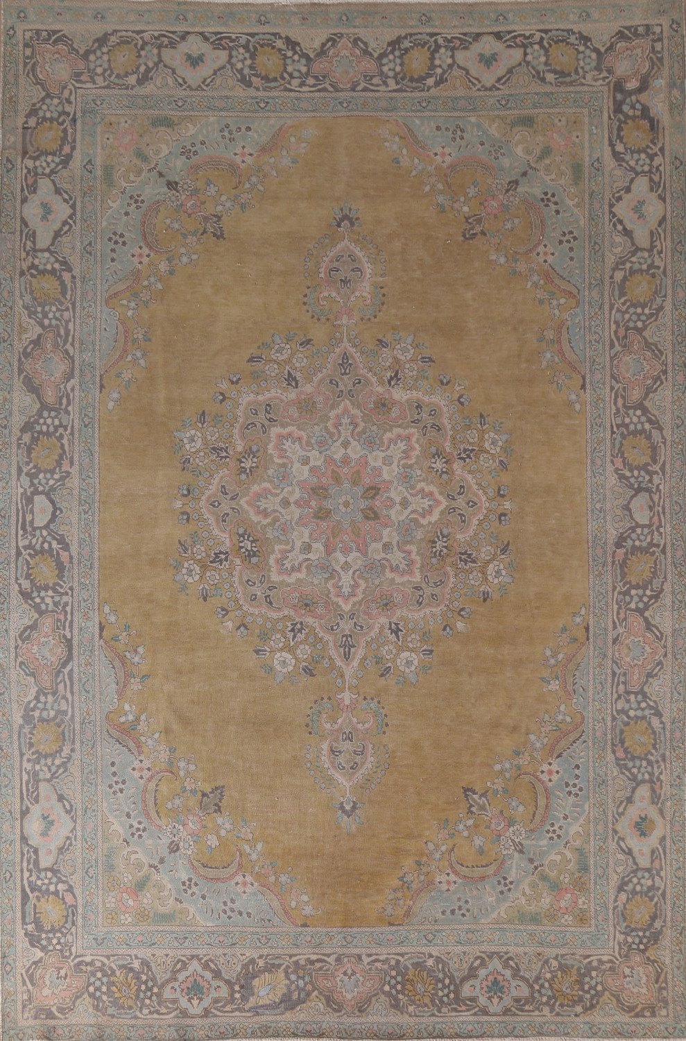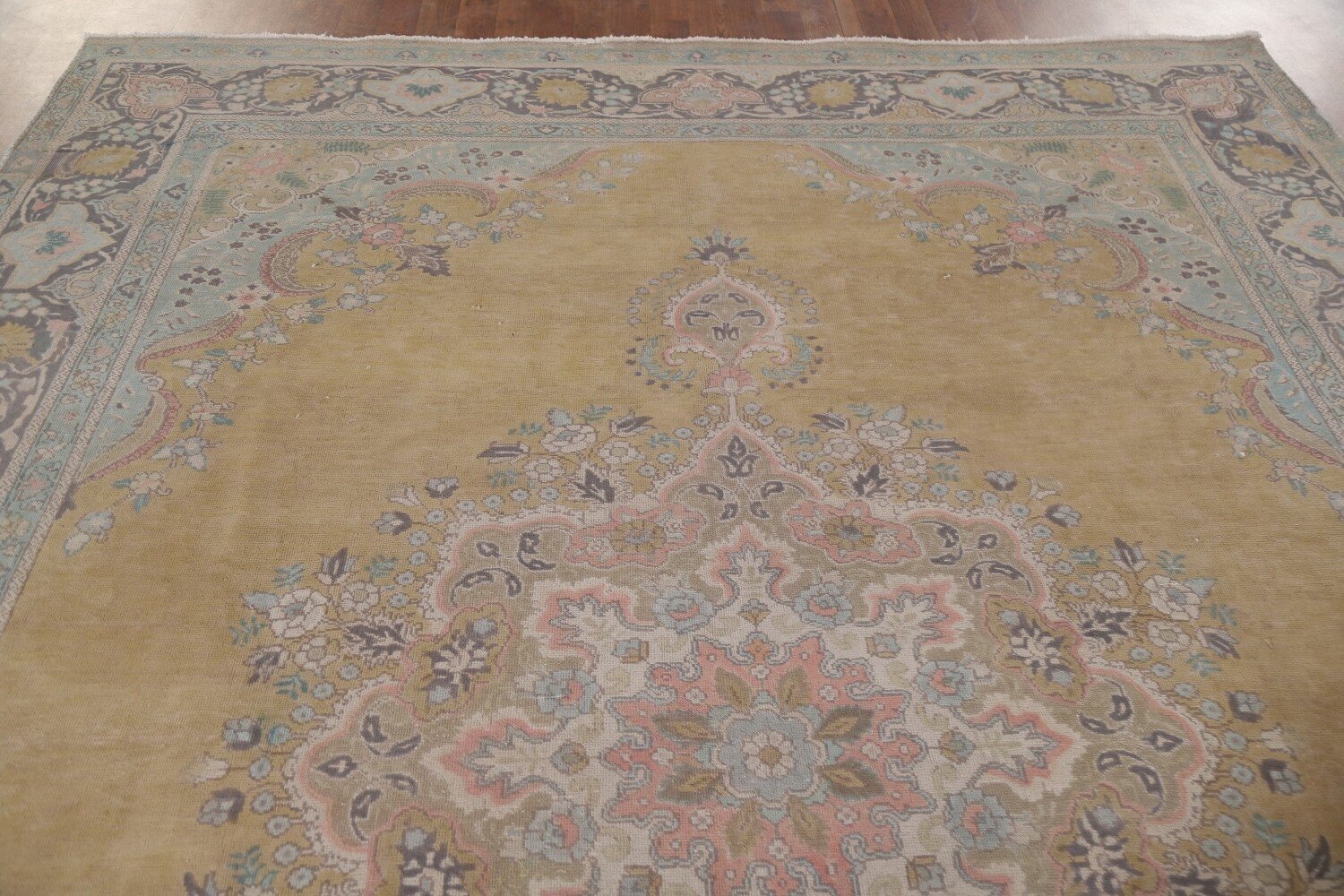 A Beautiful Genuine Persia ( Persia ) Tabriz rug is Hand Knotted by skillful weavers in Persia ( Persia ) with 100% Wool Material. This rug is in Very Good (Low Pile-Repairs) condition. dimensions are 11' 0'' X 8' 3'' in foot and 335 X 251 in centimeter. the primary color is Yellow & Gold.