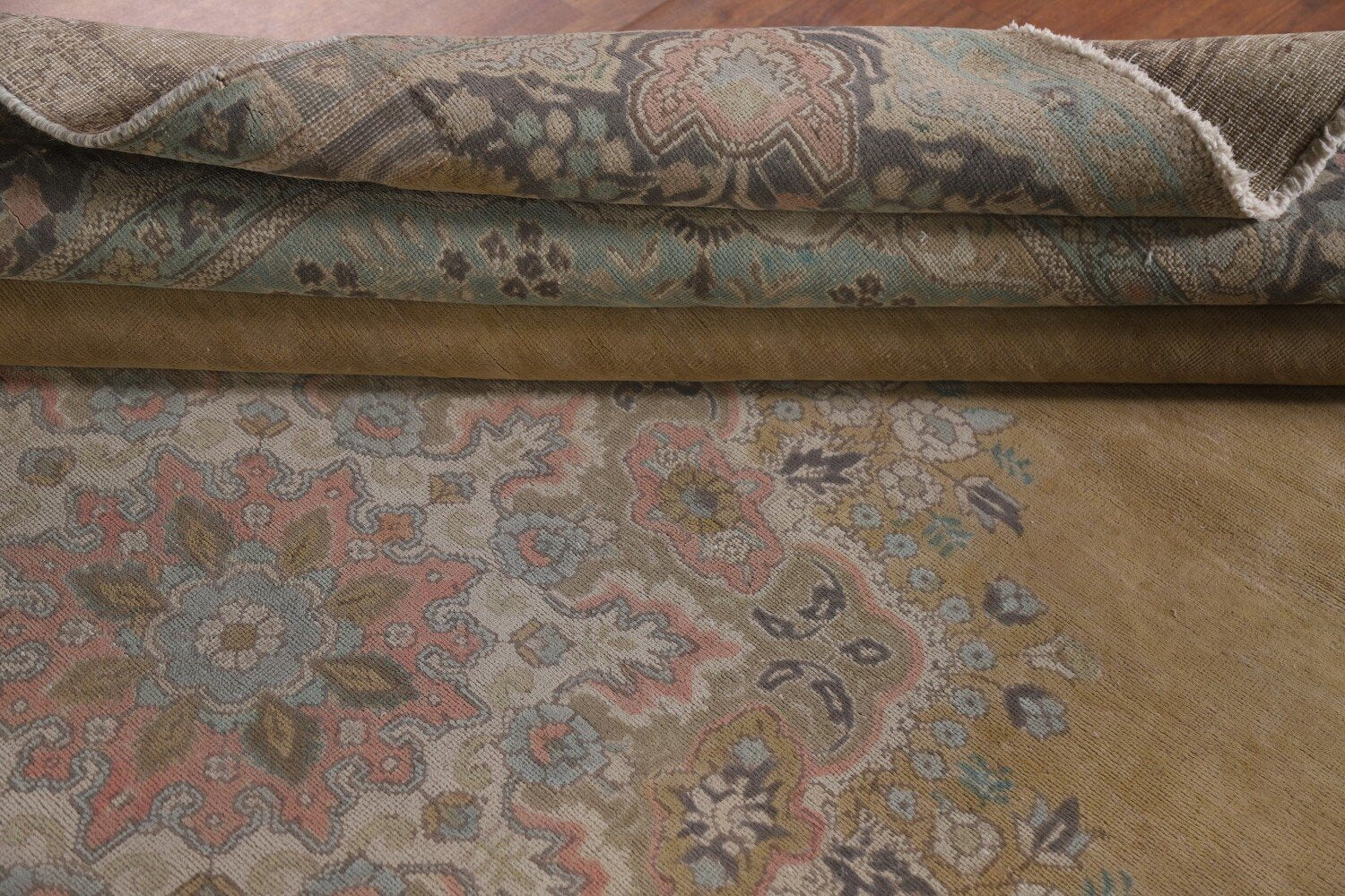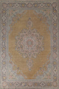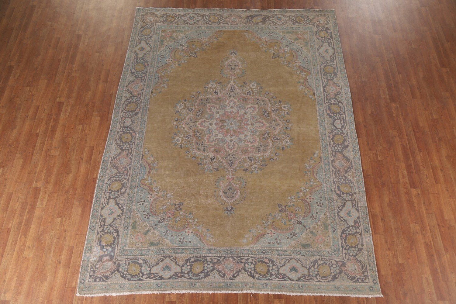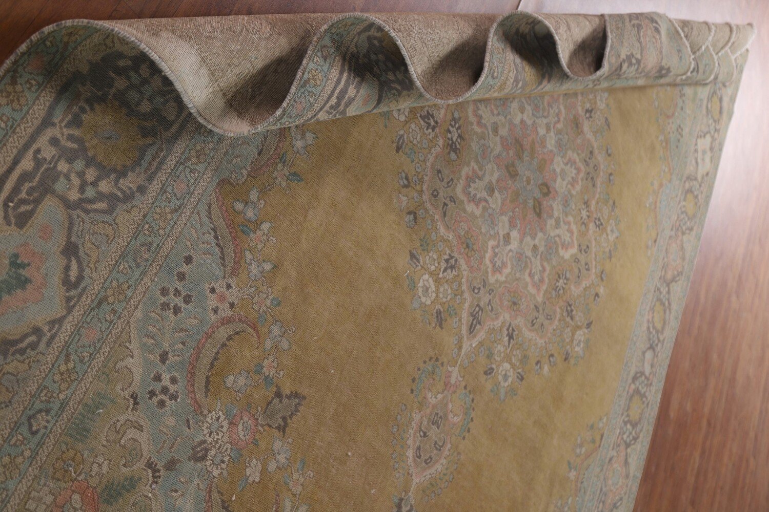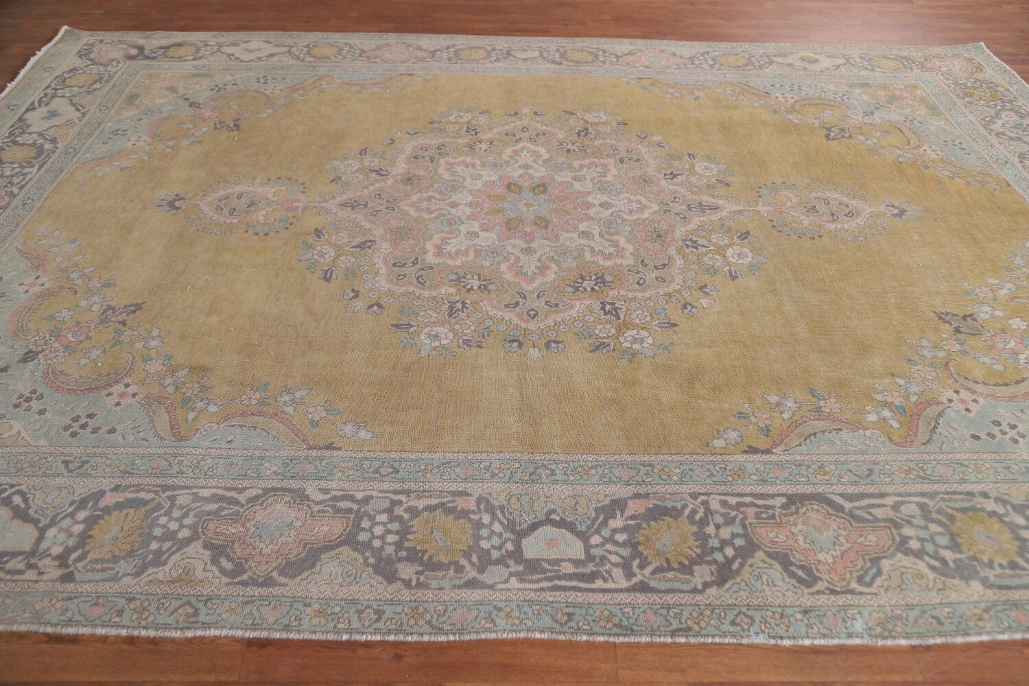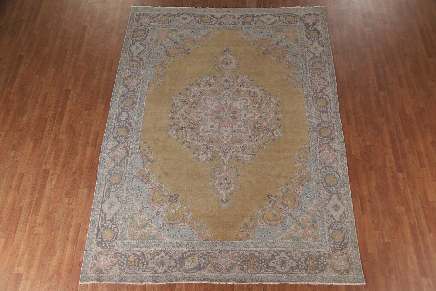 A Beautiful Genuine Persia ( Persia ) Tabriz rug is Hand Knotted by skillful weavers in Persia ( Persia ) with 100% Wool Material. This rug is in Very Good (Low Pile-Repairs) condition. dimensions are 11' 0'' X 8' 3'' in foot and 335 X 251 in centimeter. the primary color is Yellow & Gold.