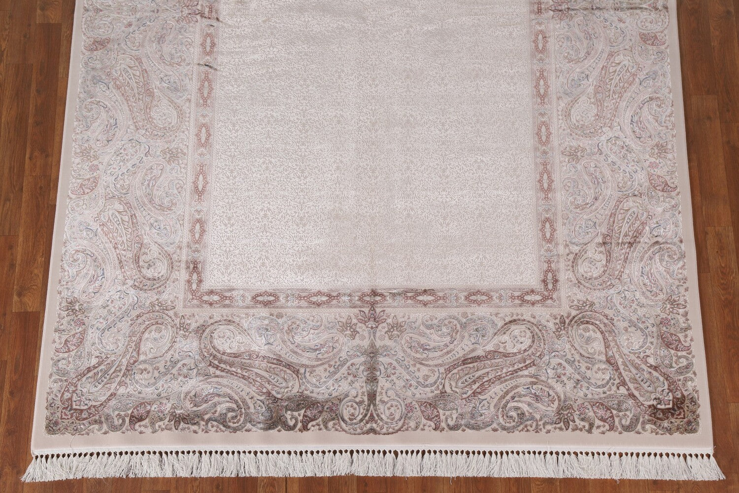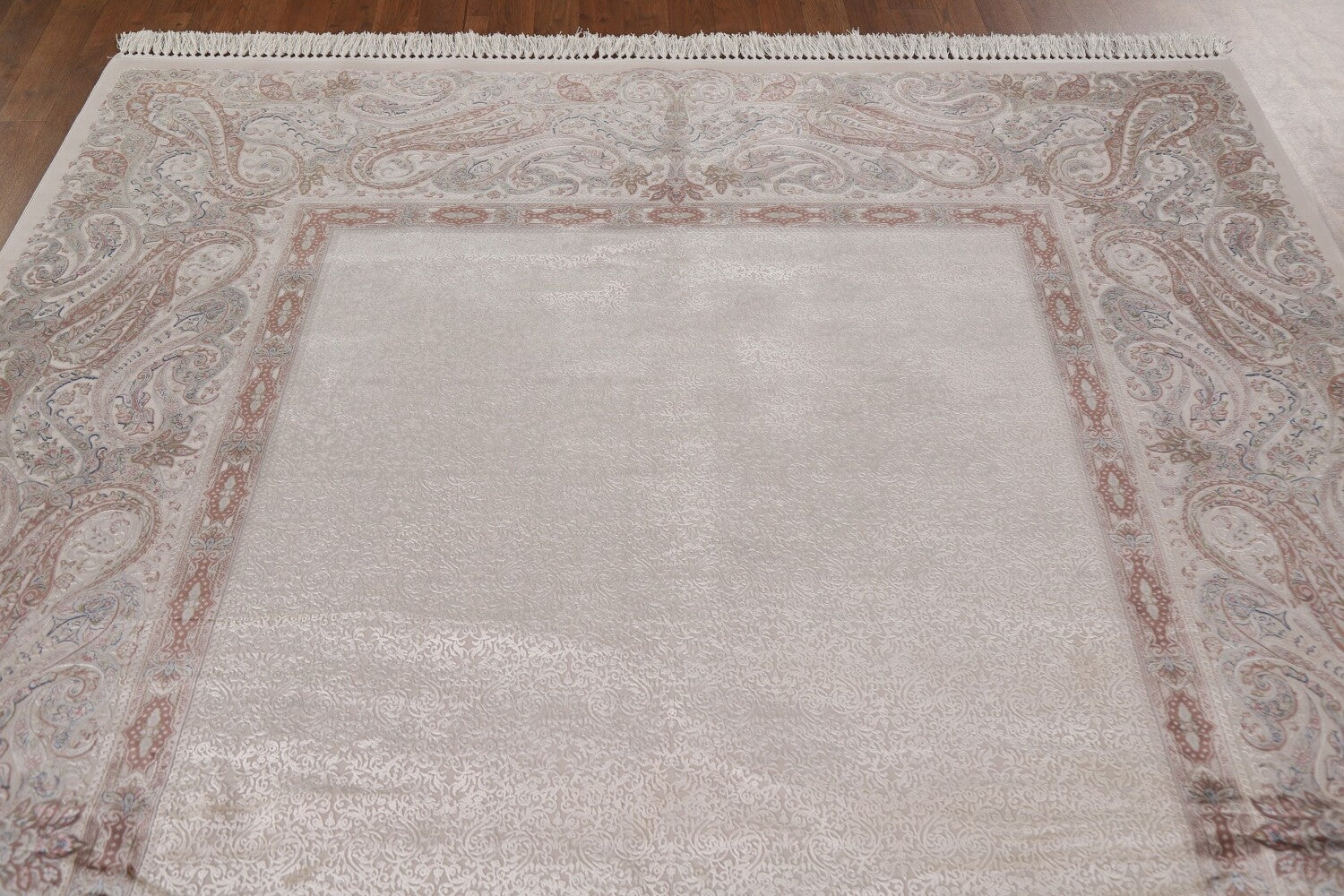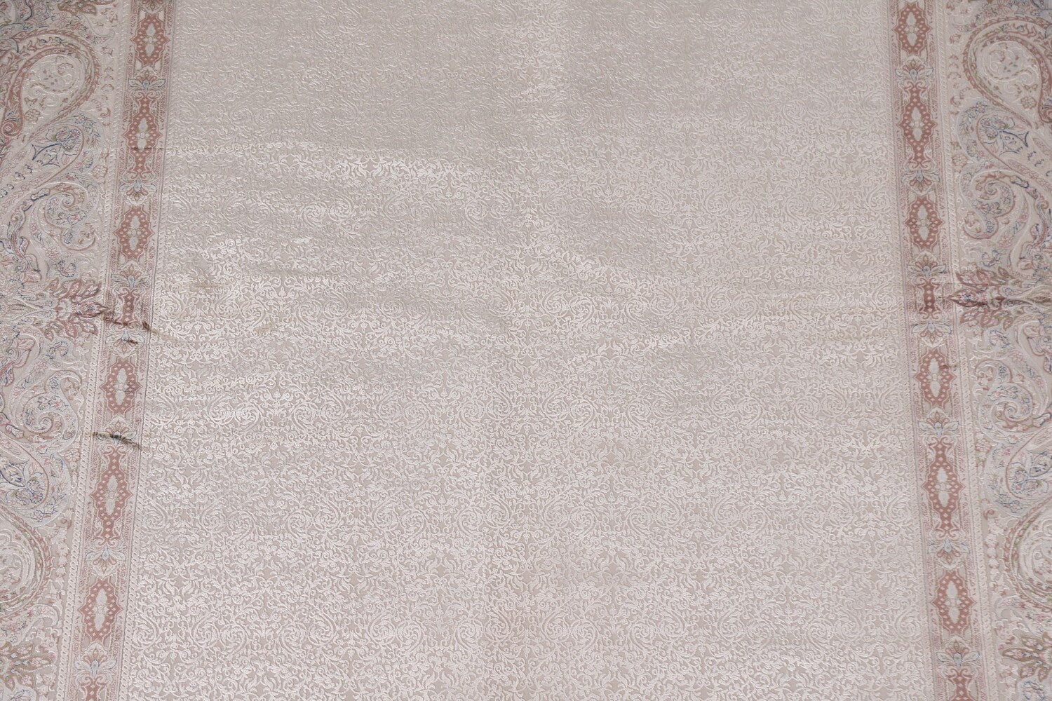 A Beautiful Genuine Turkey Tabriz rug is Machine Made by skillful weavers in Turkey with 90% Silk - 10% Polyester Material. This rug is in condition. dimensions are 9' 8'' X 6' 6'' in foot and 295 X 198 in centimeter. the primary color is Beige & Ivories.