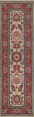 A Beautiful Genuine Pakistan Kazak rug is Hand Knotted by skillful weavers in Pakistan with 100% Wool Material. This rug is in New, First Quality condition. dimensions are 9' 6'' X 2' 7'' in foot and 290 X 79 in centimeter. the primary color is Beige & Ivories.