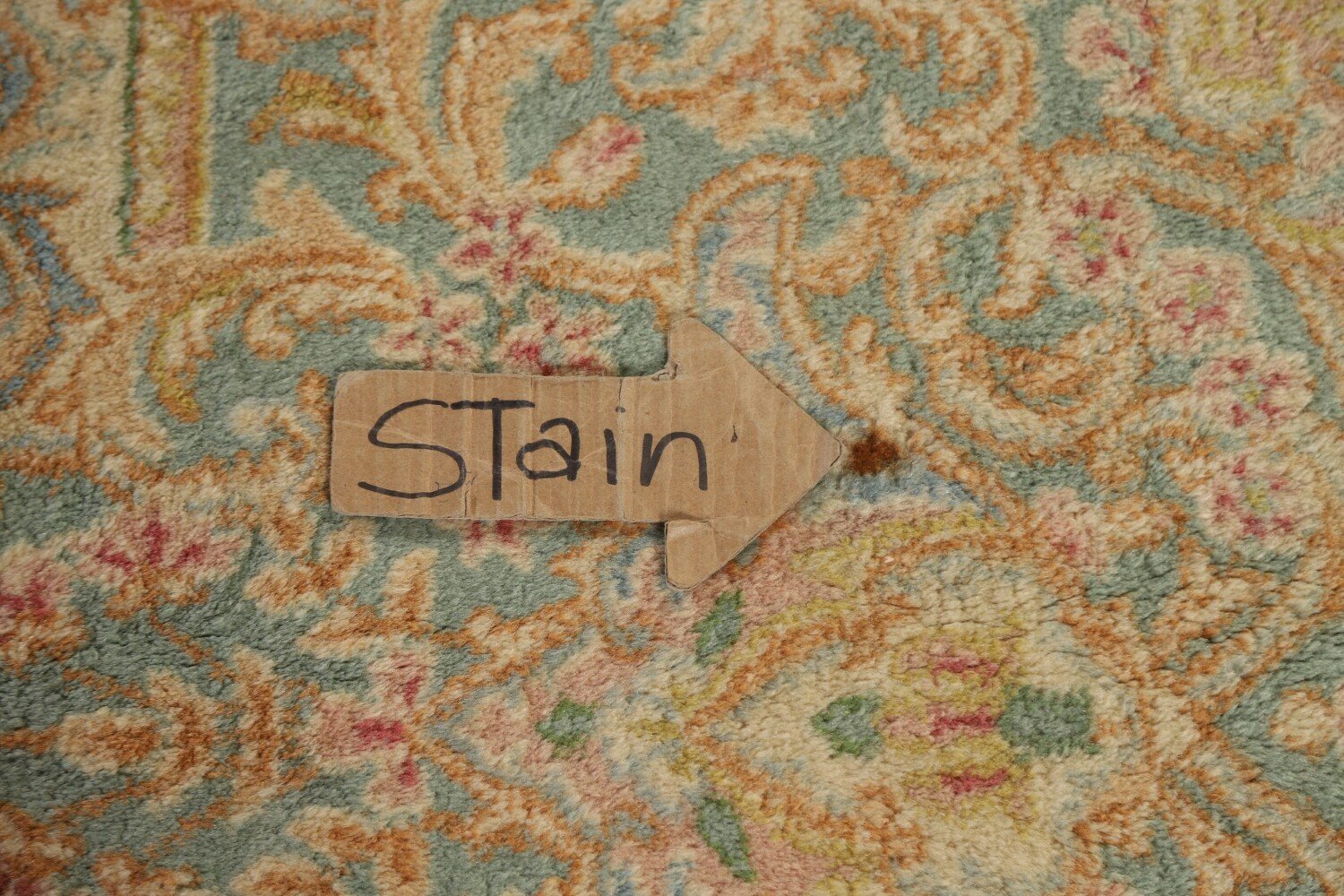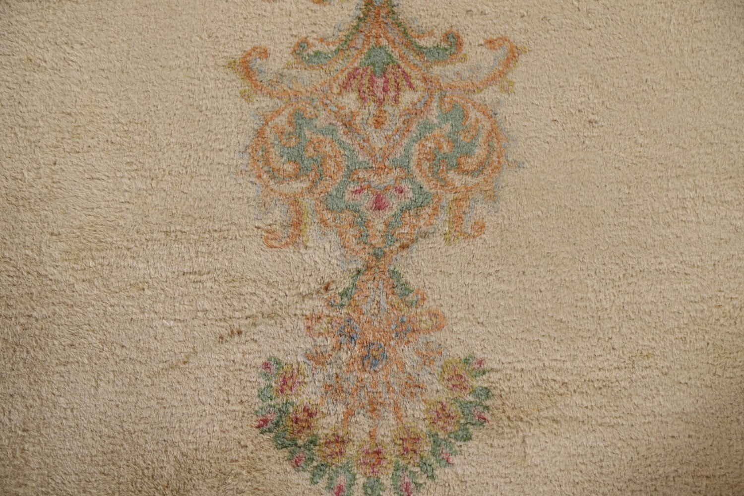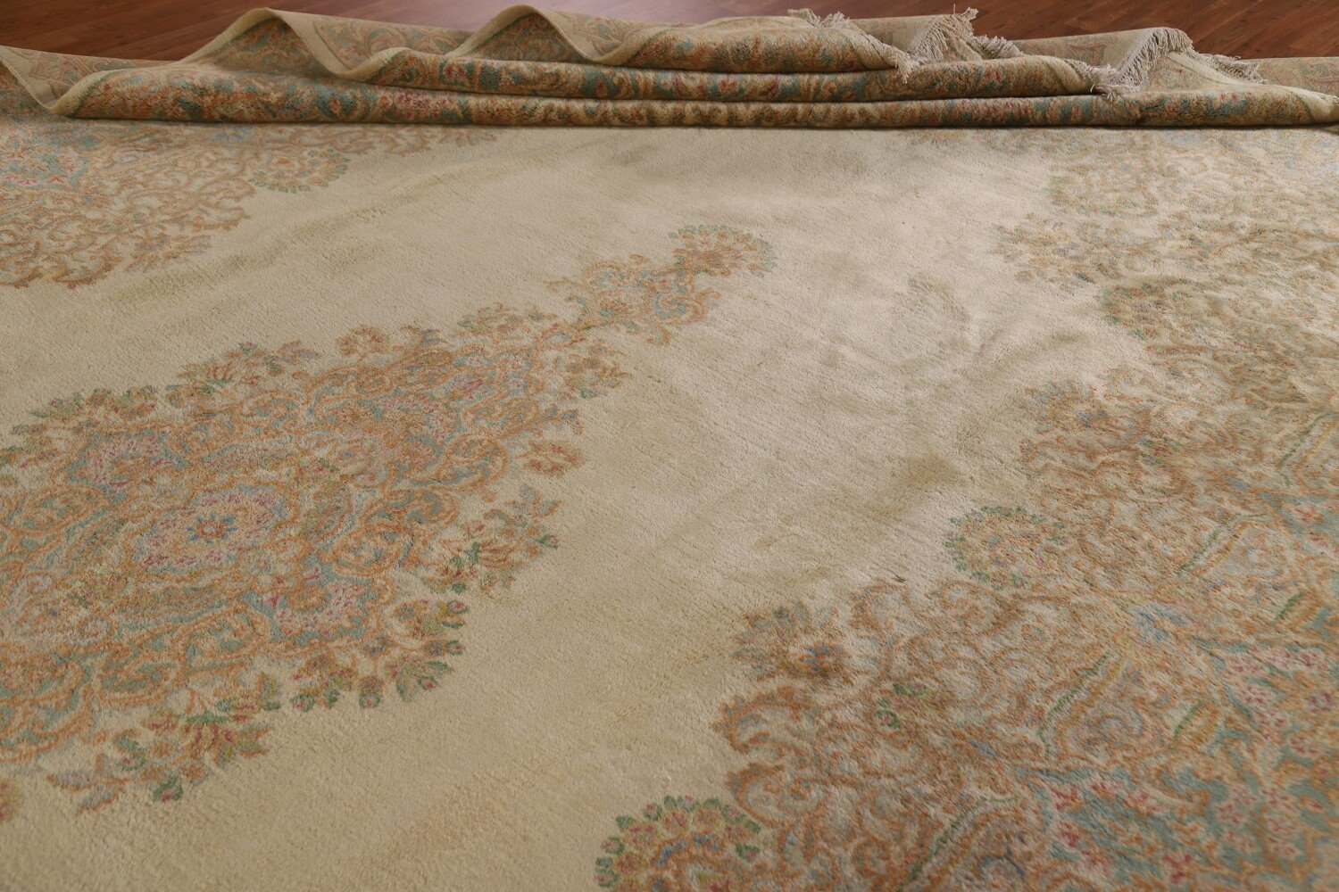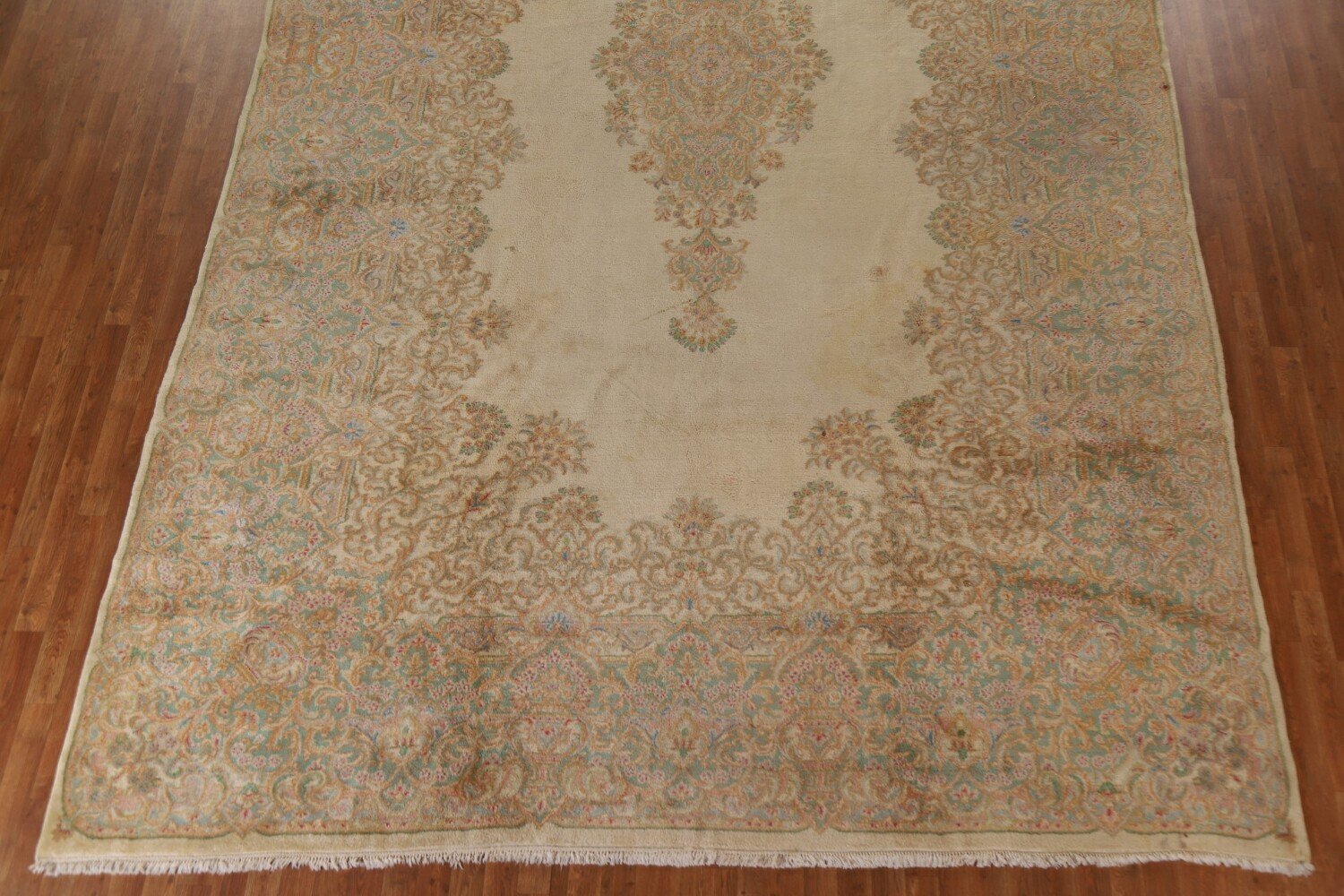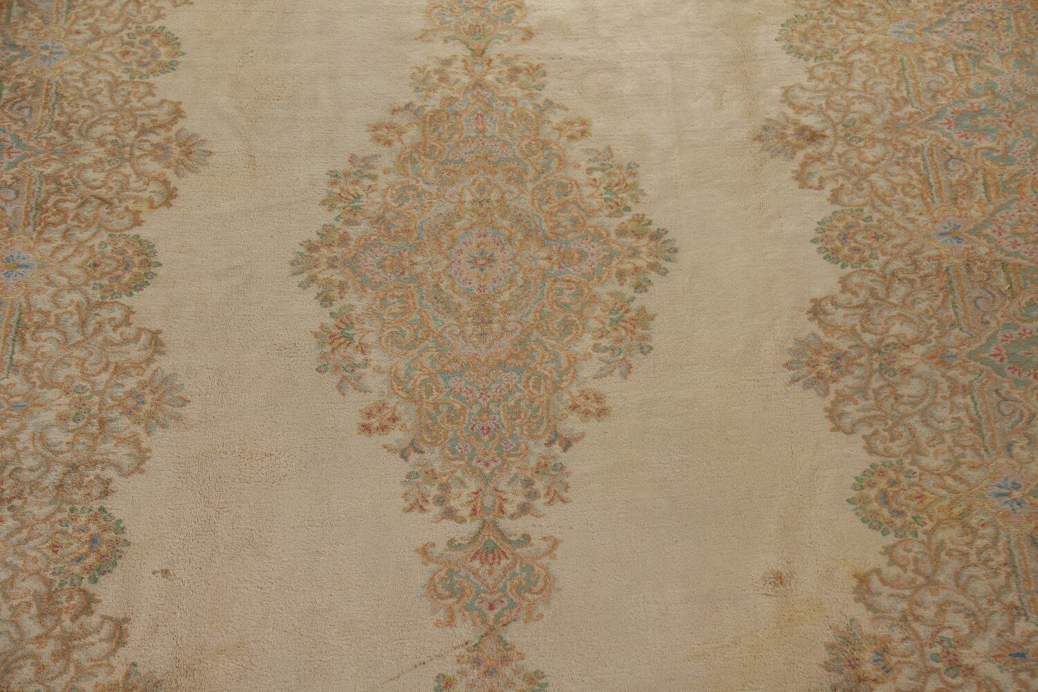 A Beautiful Genuine Persia ( Persia ) Kerman rug is Hand Knotted by skillful weavers in Persia ( Persia ) with 100% Wool Material. This rug is in Very Good (Stains) condition. dimensions are 17' 6'' X 10' 4'' in foot and 533 X 315 in centimeter. the primary color is Yellow & Gold.