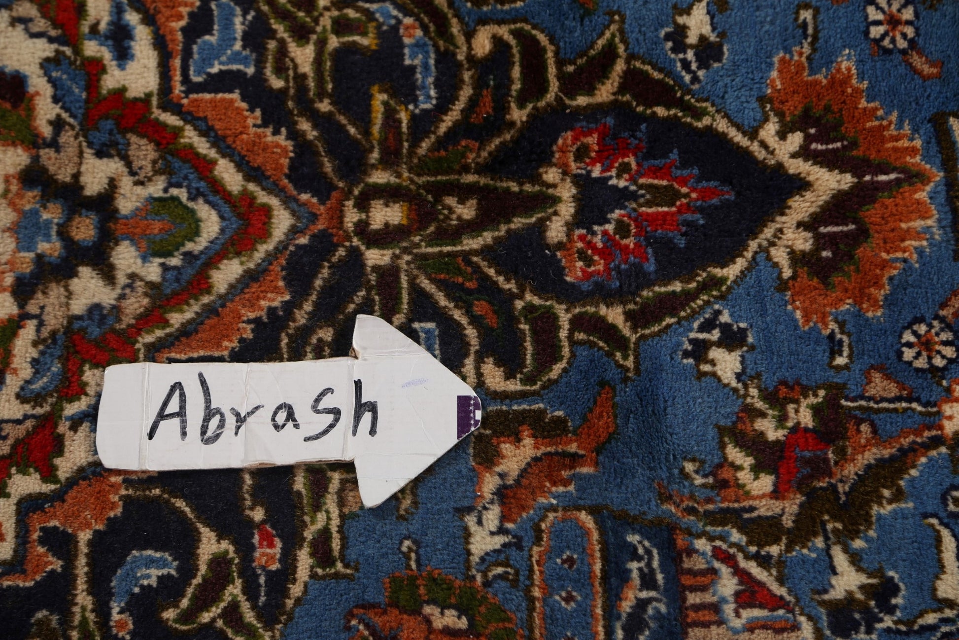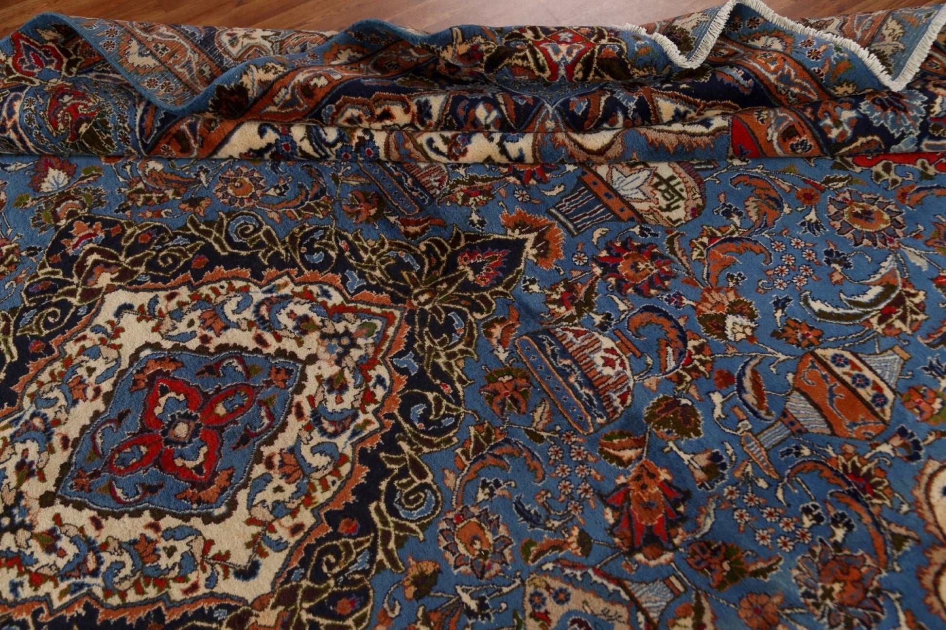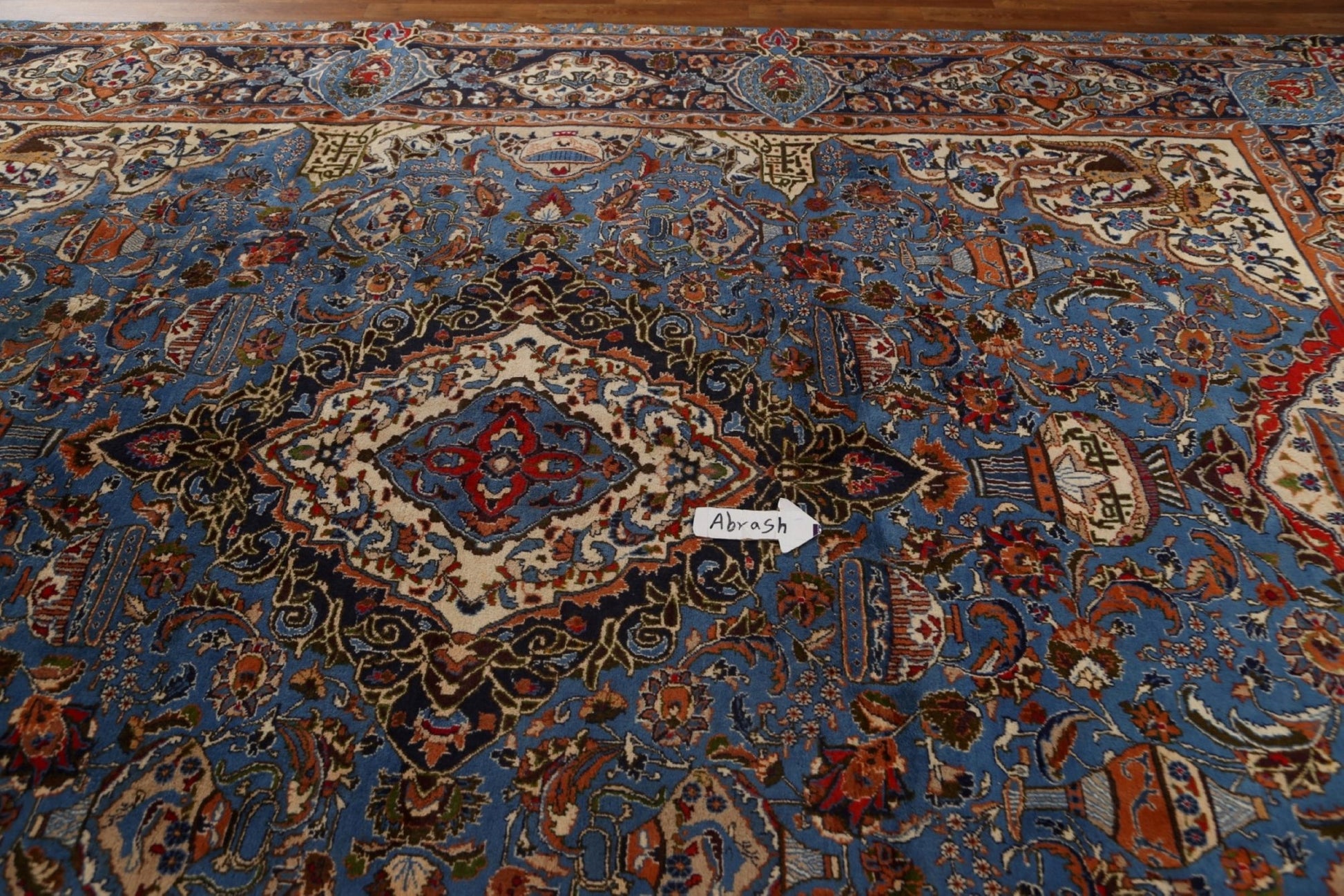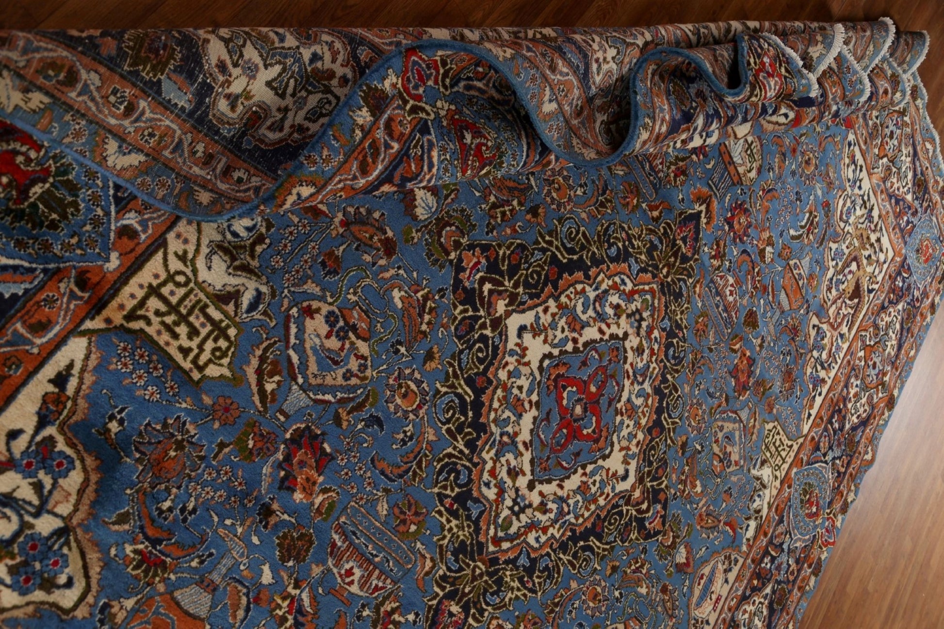 A Beautiful Genuine Persia ( Persia ) Kashmar rug is Hand Knotted by skillful weavers in Persia ( Persia ) with 100% Wool Material. This rug is in Very Good (Abrash) condition. dimensions are 12' 9'' X 9' 9'' in foot and 389 X 297 in centimeter. the primary color is Navy Blue & Blues.