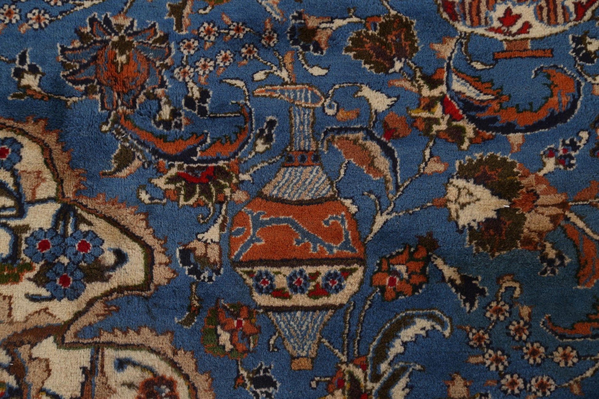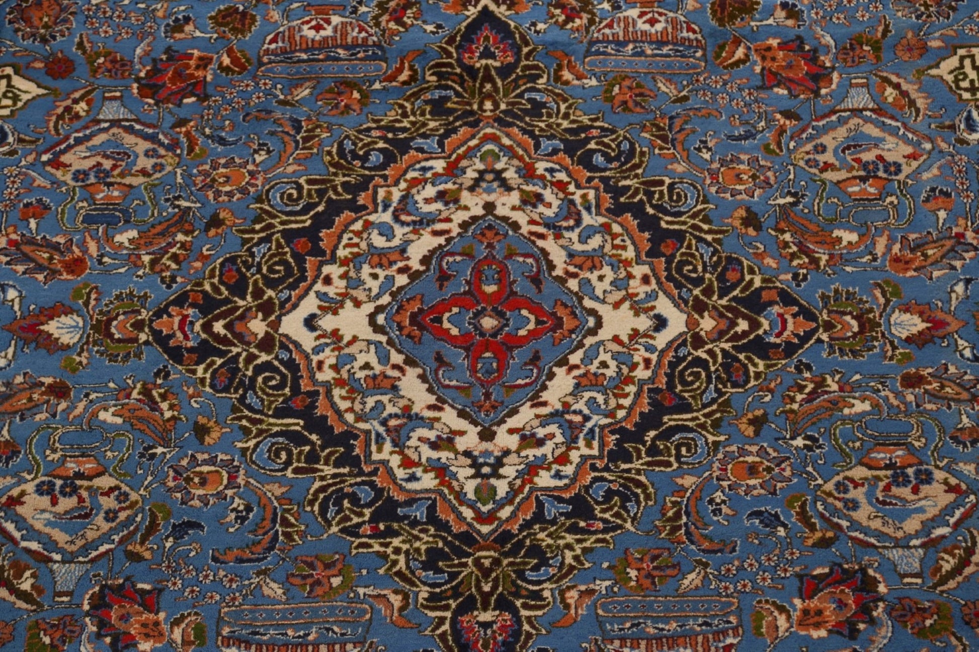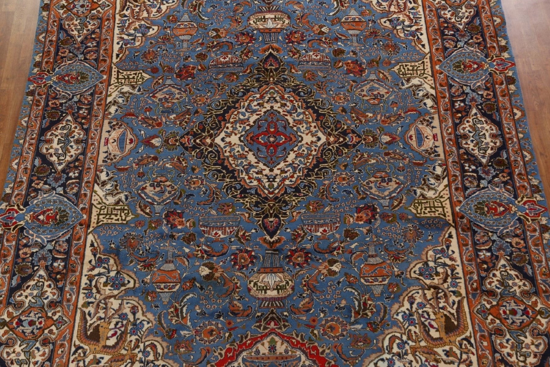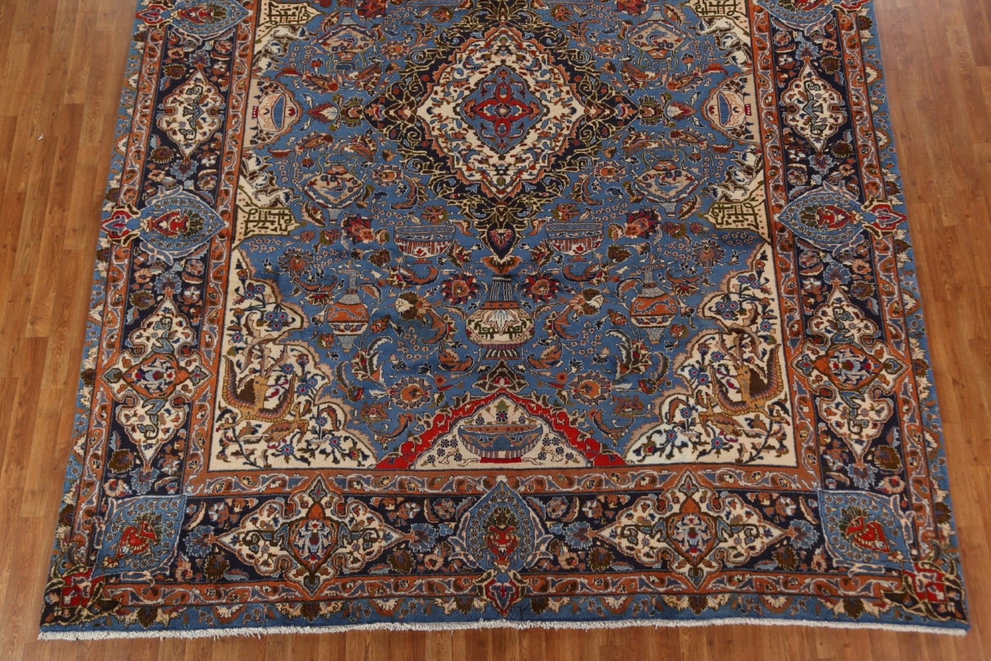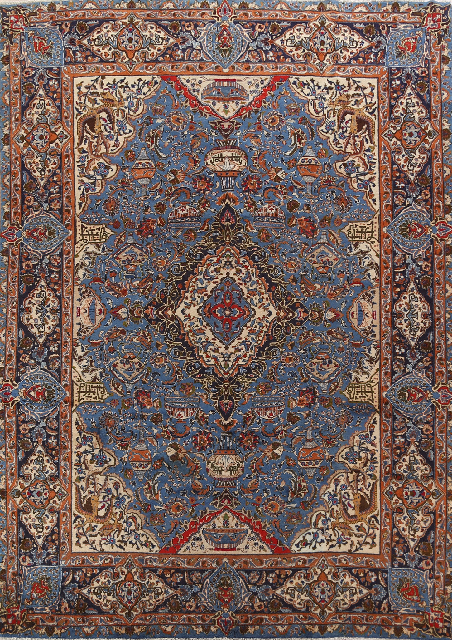 A Beautiful Genuine Persia ( Persia ) Kashmar rug is Hand Knotted by skillful weavers in Persia ( Persia ) with 100% Wool Material. This rug is in Very Good (Abrash) condition. dimensions are 12' 9'' X 9' 9'' in foot and 389 X 297 in centimeter. the primary color is Navy Blue & Blues.
