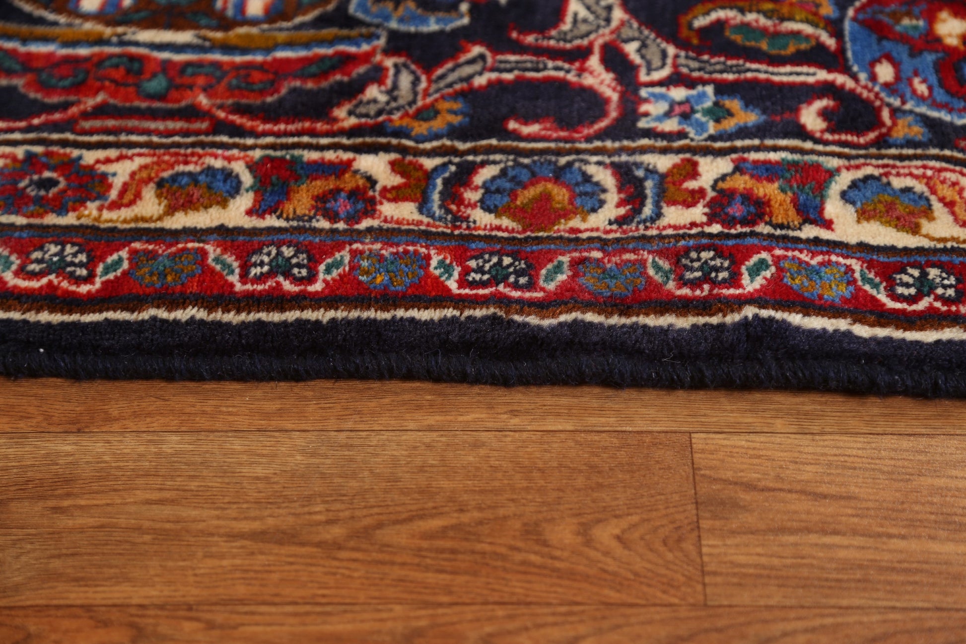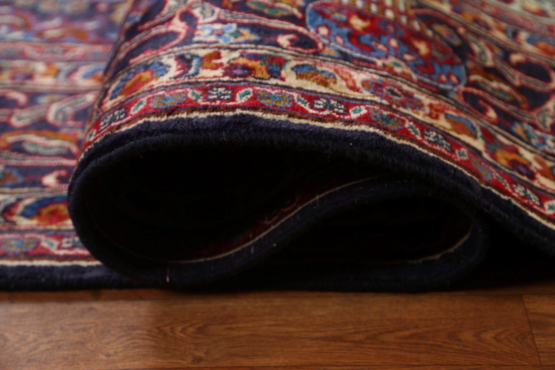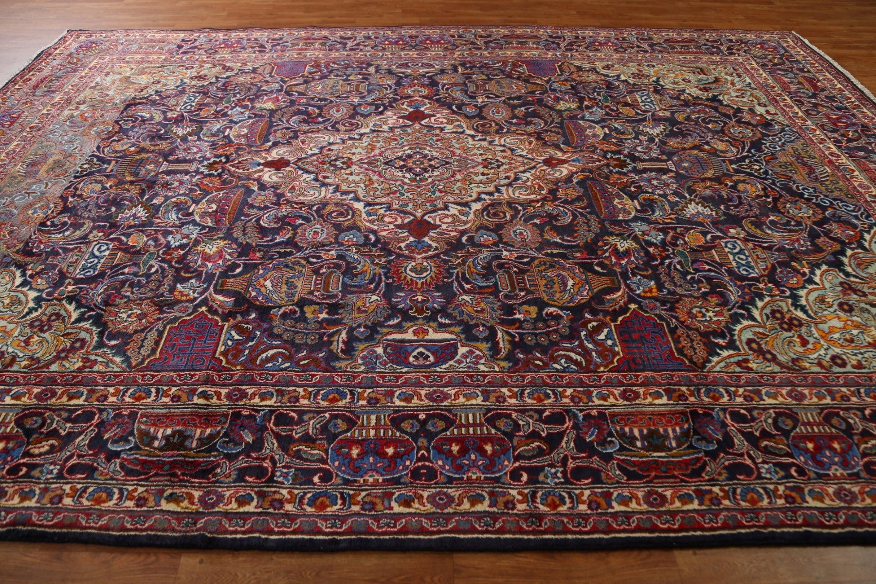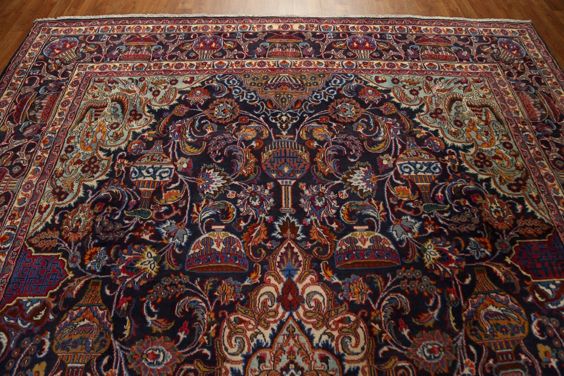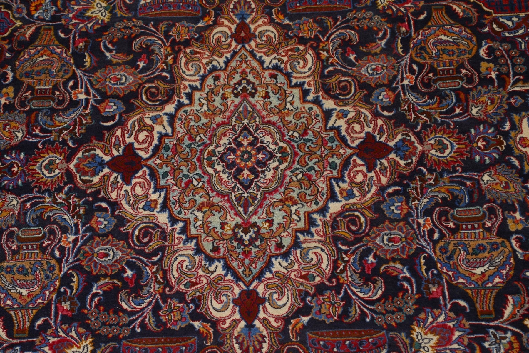 A Beautiful Genuine Persia ( Persia ) Kashmar rug is Hand Knotted by skillful weavers in Persia ( Persia ) with 100% Wool Material. This rug is in Very Good (Abrash) condition. dimensions are 13' 3'' X 9' 2'' in foot and 404 X 279 in centimeter. the primary color is Navy Blue & Blues.