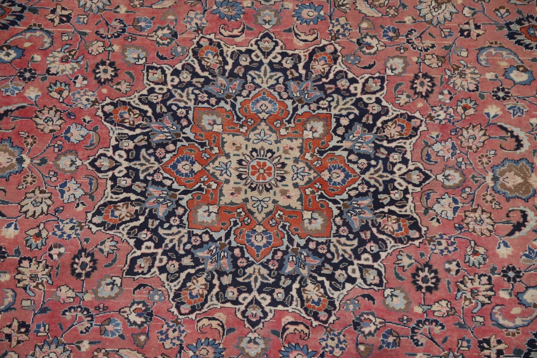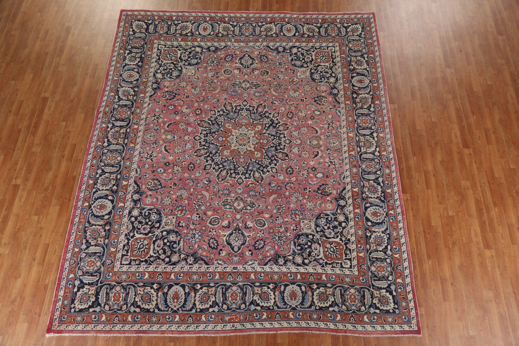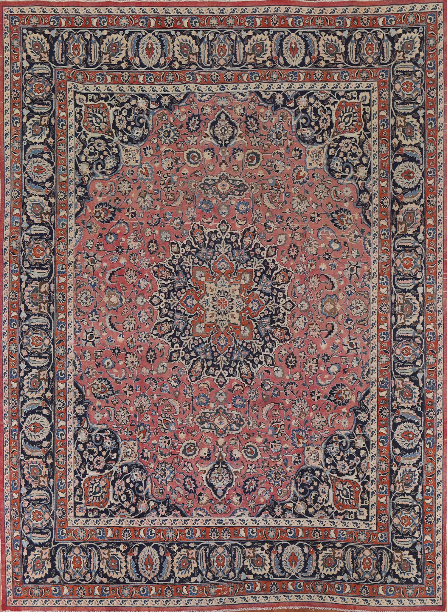 A Beautiful Genuine Persia ( Persia ) Mashad rug is Hand Knotted by skillful weavers in Persia ( Persia ) with 100% Wool Material. This rug is in Very Good (Evenly Low Pile) condition. dimensions are 11' 6'' X 9' 9'' in foot and 351 X 297 in centimeter. the primary color is Pink.