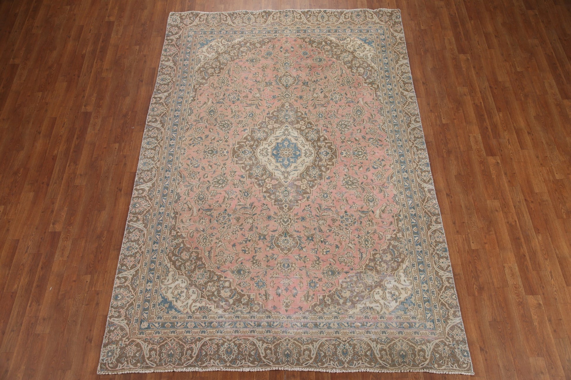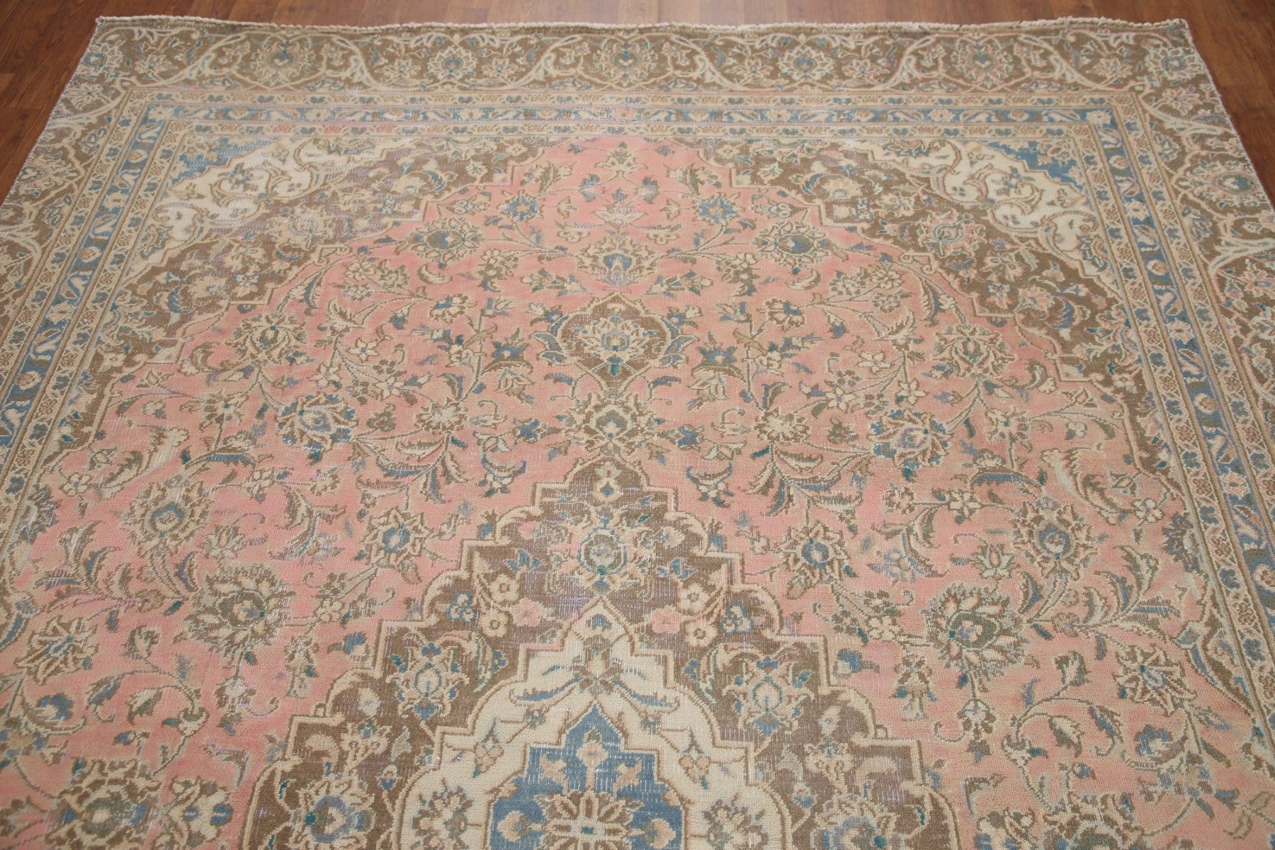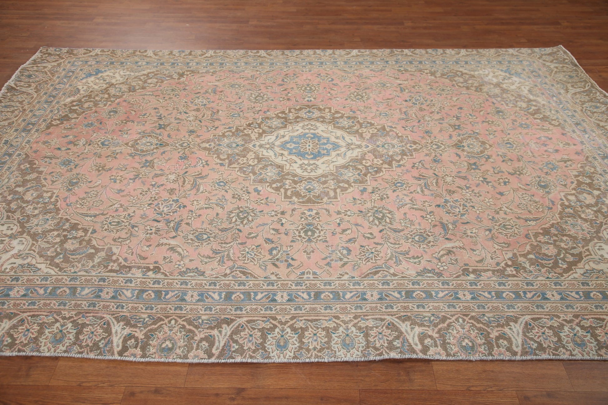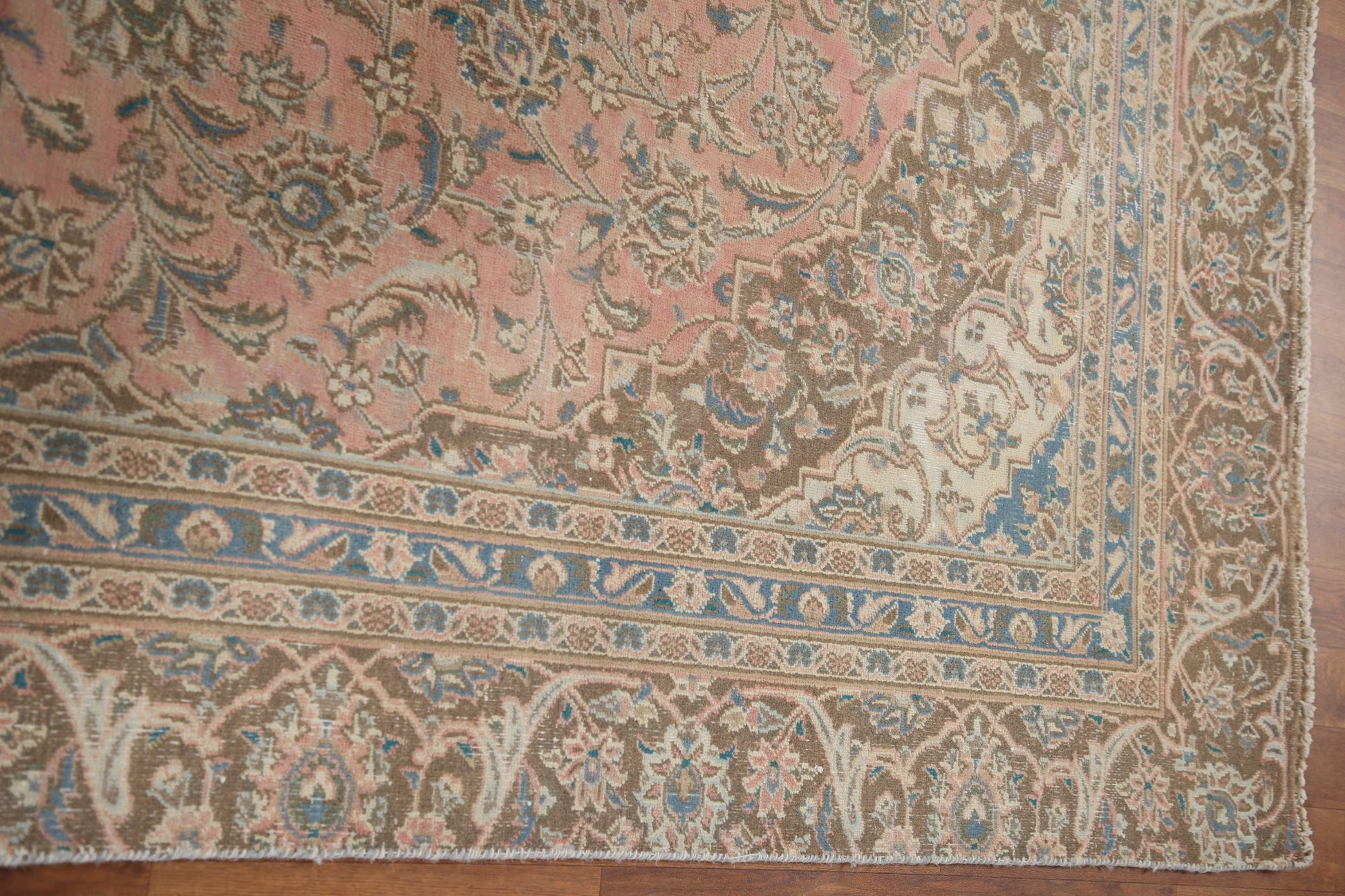 A Beautiful Genuine Persia ( Persia ) Mashad rug is Hand Knotted by skillful weavers in Persia ( Persia ) with 100% Wool Material. This rug is in Very Good (Evenly Low Pile) condition. dimensions are 9' 8'' X 6' 7'' in foot and 295 X 201 in centimeter. the primary color is Pink.