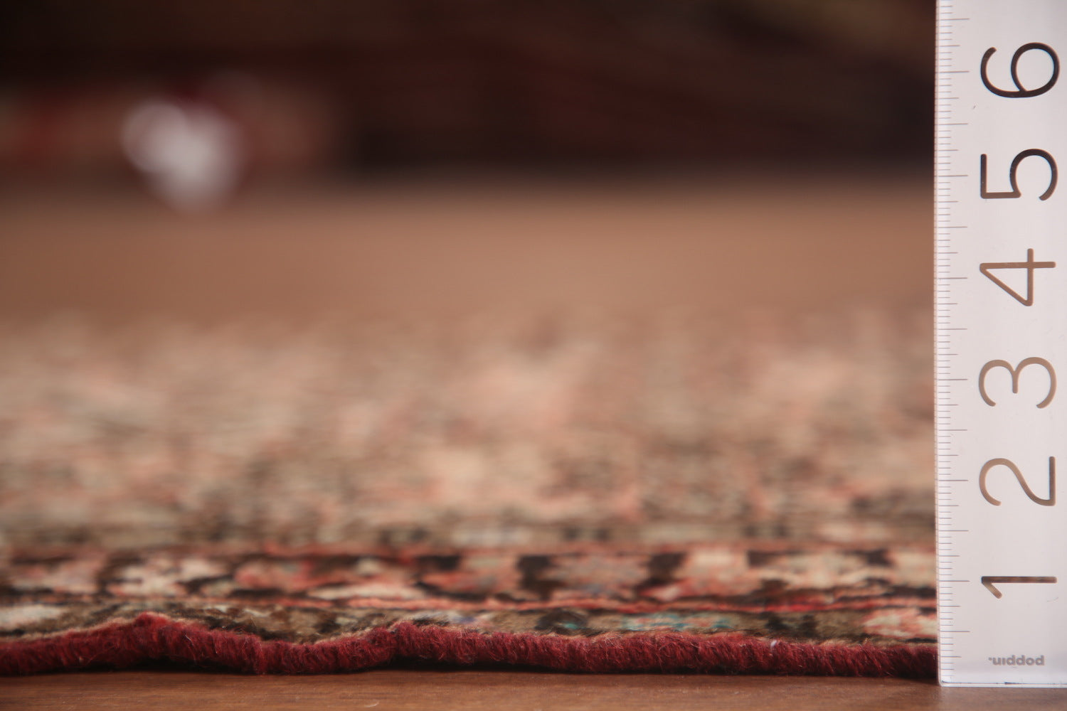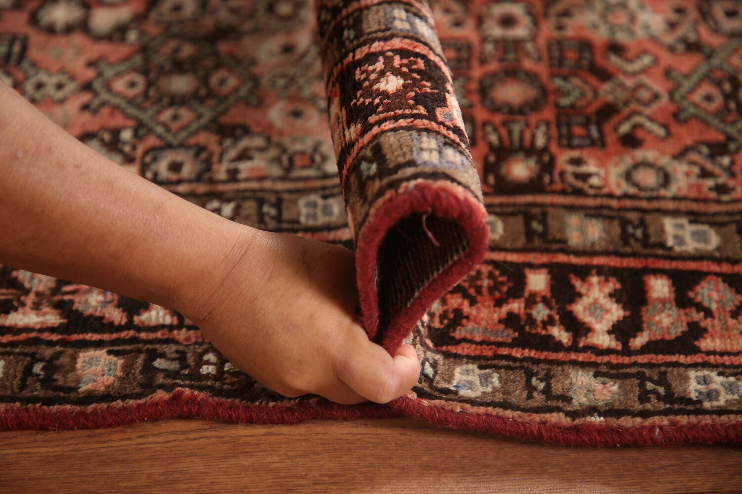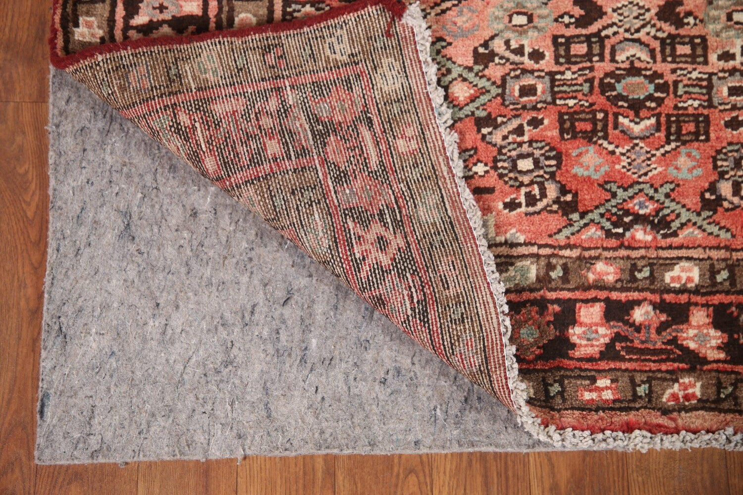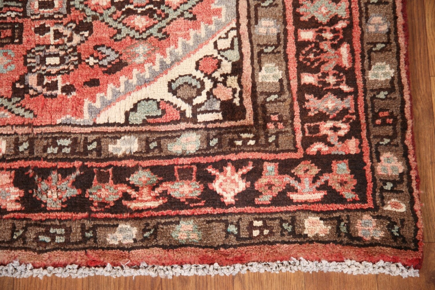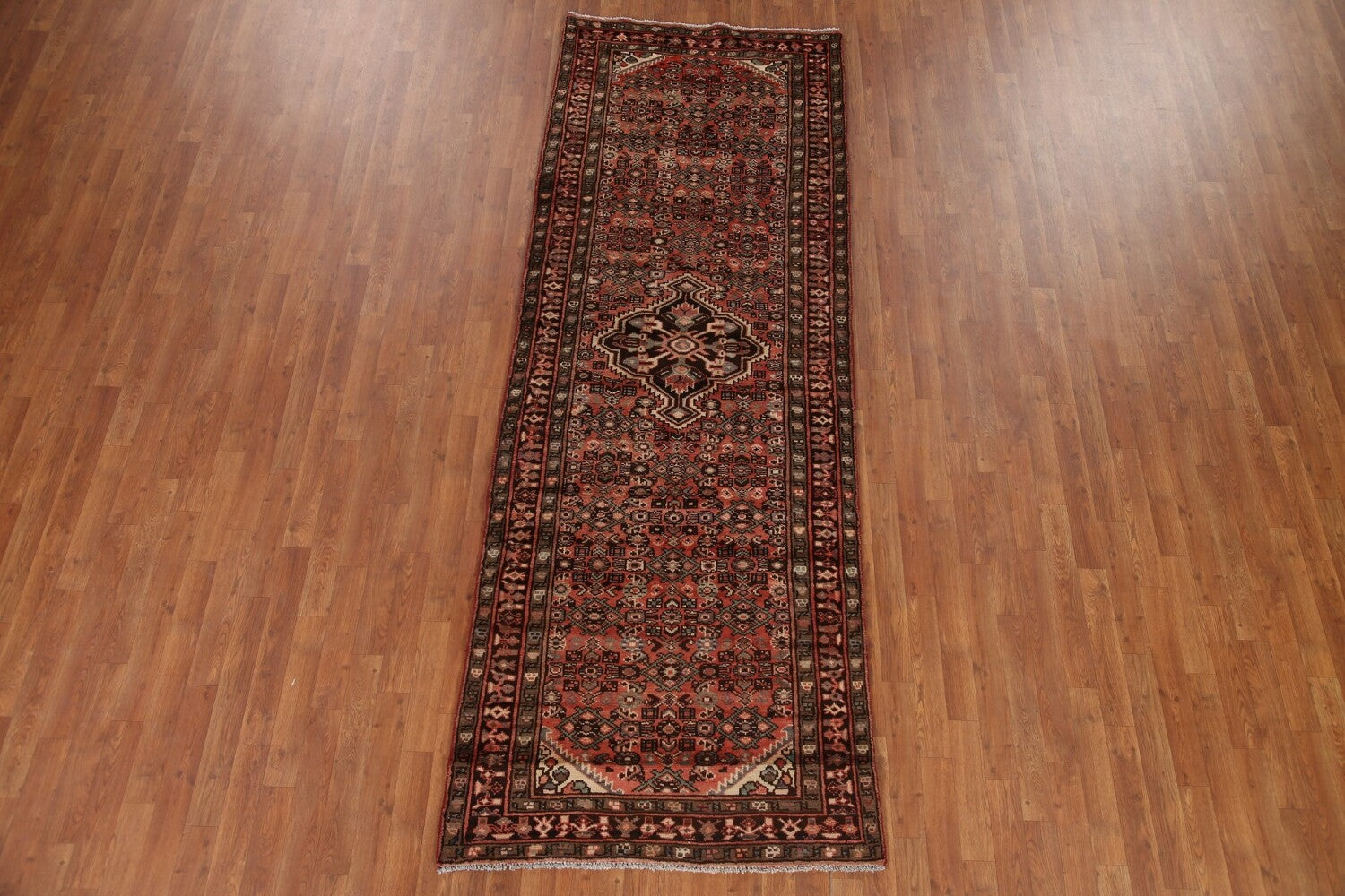 A Beautiful Genuine Persia ( Persia ) Hamedan rug is Hand Knotted by skillful weavers in Persia ( Persia ) with 100% Wool Material. This rug is in Very Good (Low Pile) condition. dimensions are 9' 11'' X 3' 6'' in foot and 302 X 107 in centimeter. the primary color is Pink.
