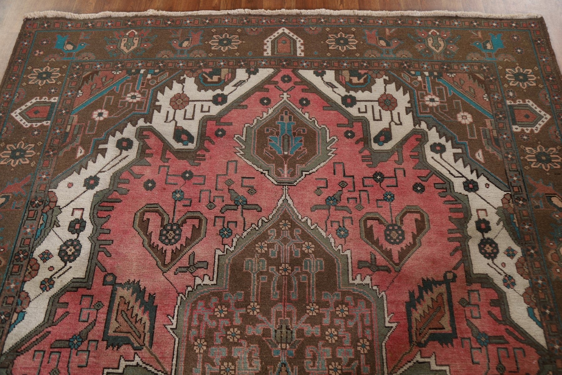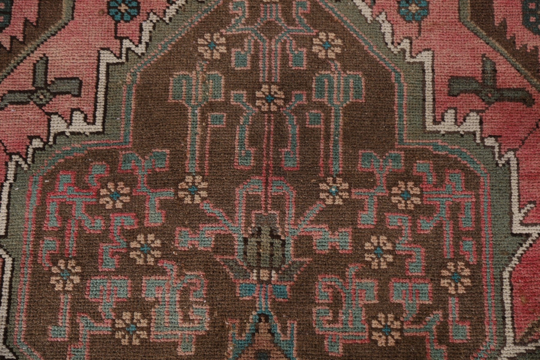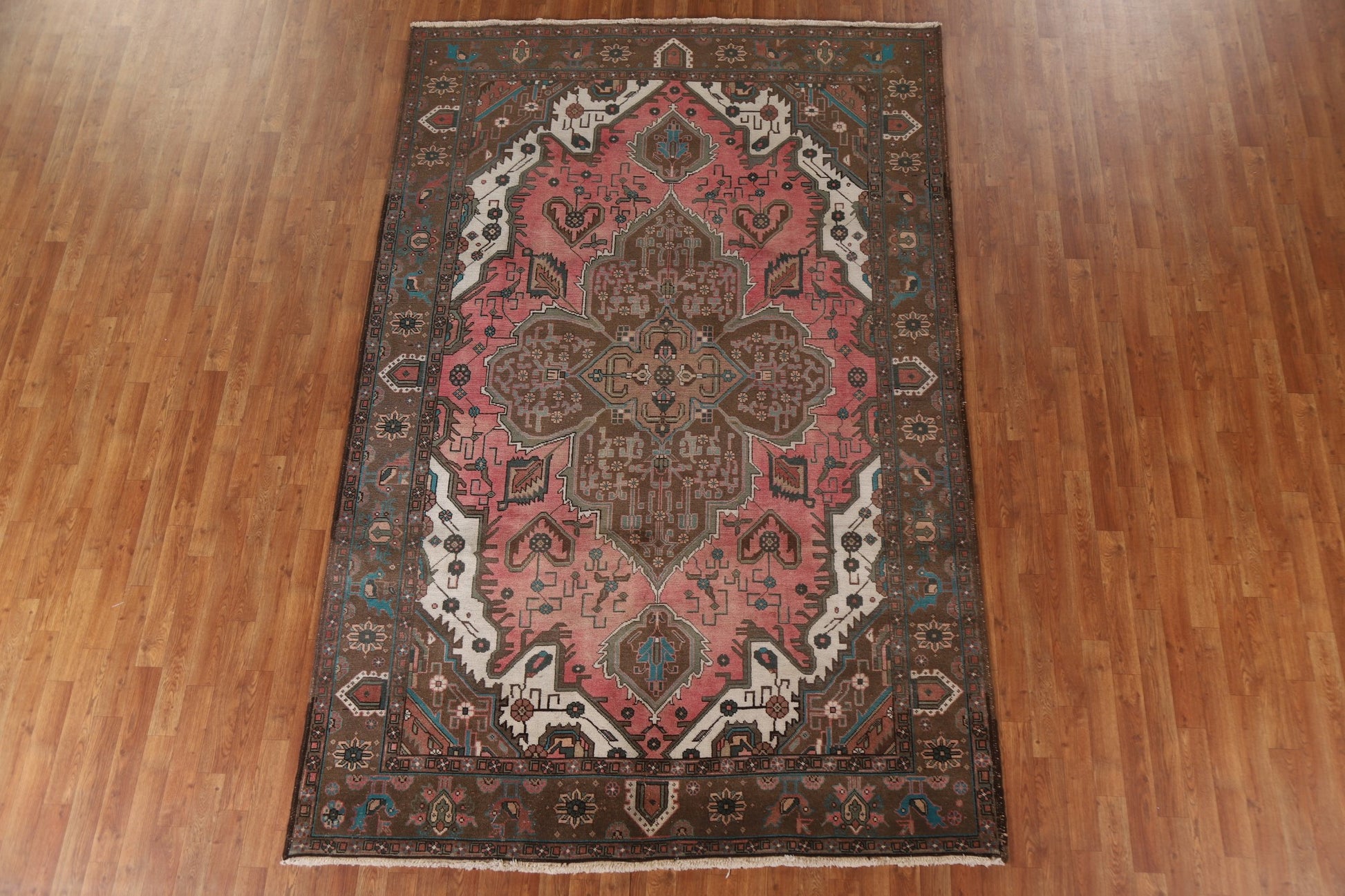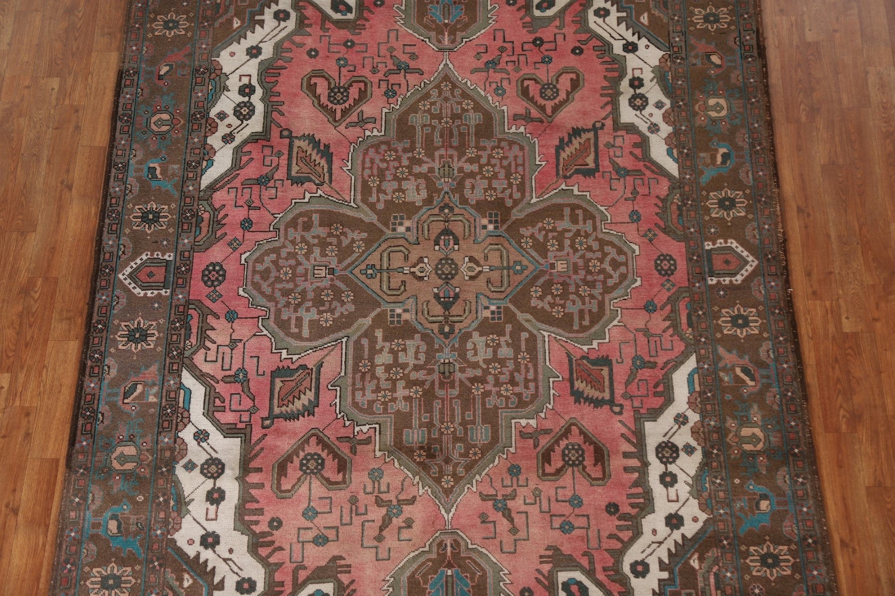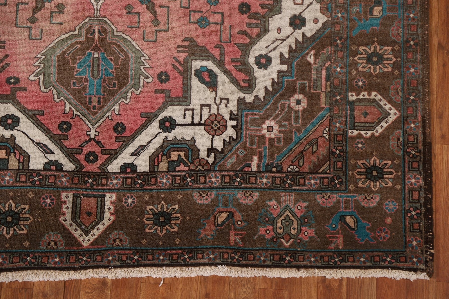 A Beautiful Genuine Persia ( Persia ) Heriz rug is Hand Knotted by skillful weavers in Persia ( Persia ) with 100% Wool Material. This rug is in Very Good ( Low Pile ) condition. dimensions are 10' 0'' X 6' 7'' in foot and 305 X 201 in centimeter. the primary color is Pink.