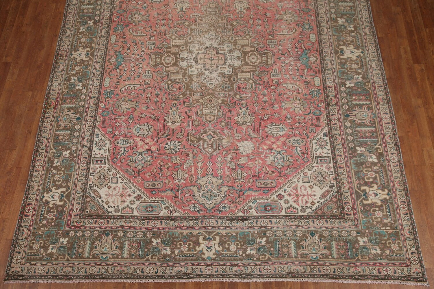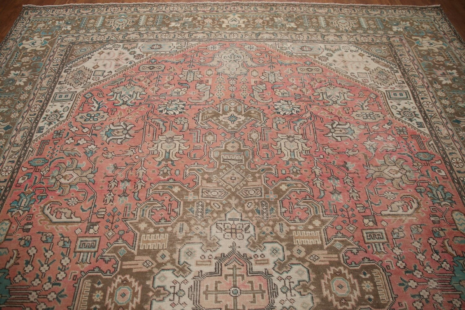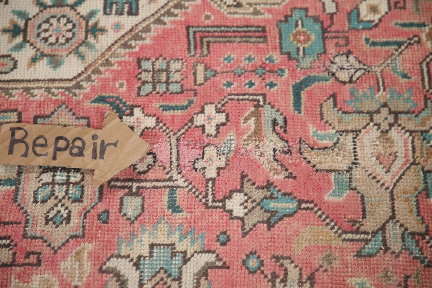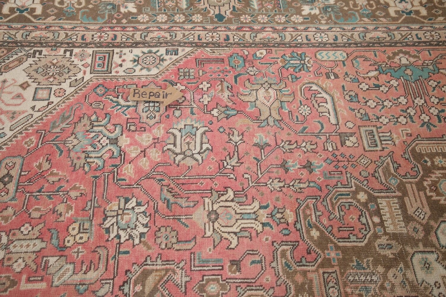 A Beautiful Genuine Persia ( Persia ) Tabriz rug is Hand Knotted by skillful weavers in Persia ( Persia ) with 100% Wool Material. This rug is in Very Good (Evenly Low Pile-Repairs) condition. dimensions are 12' 4'' X 9' 5'' in foot and 376 X 287 in centimeter. the primary color is Pink.