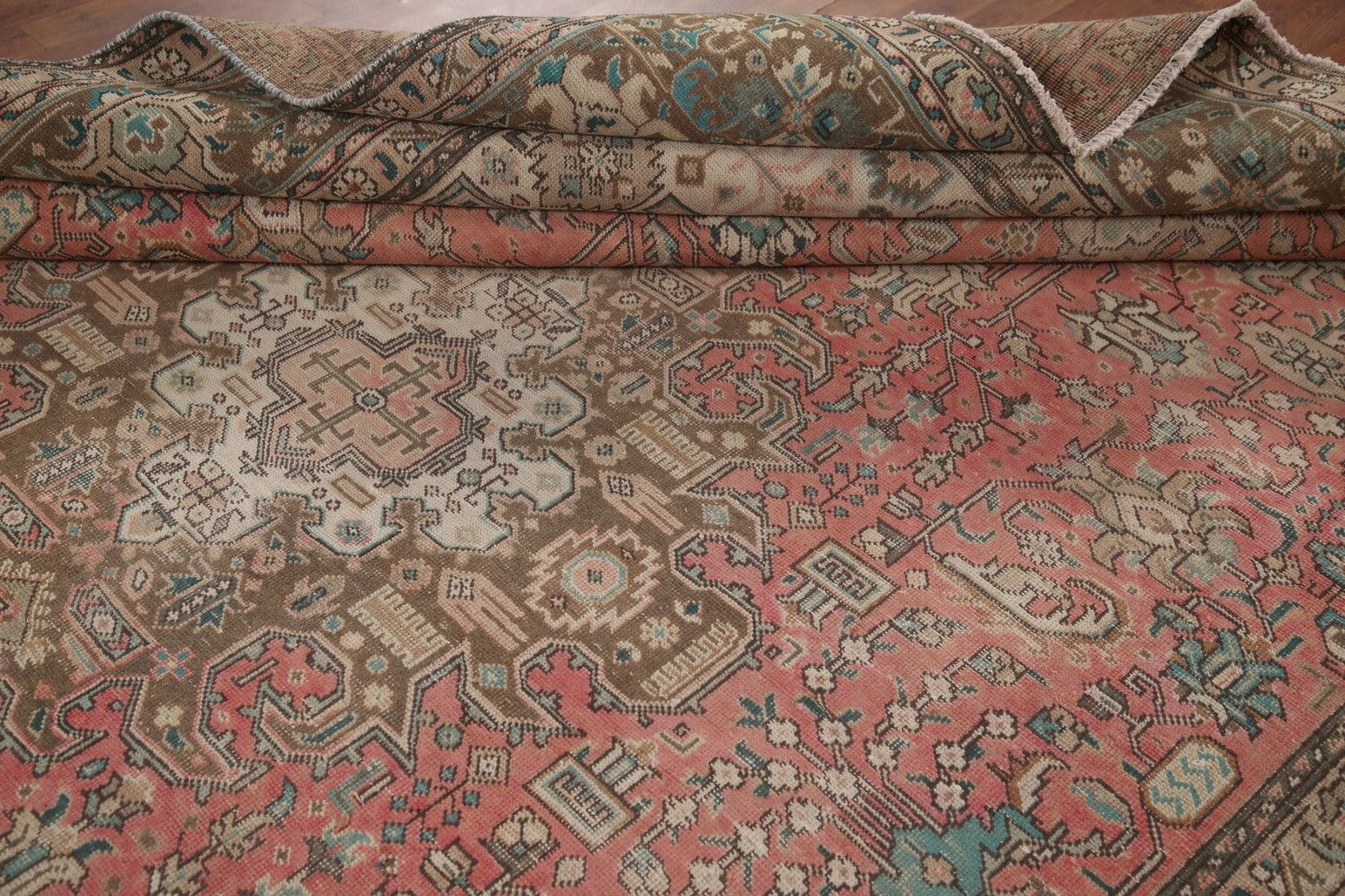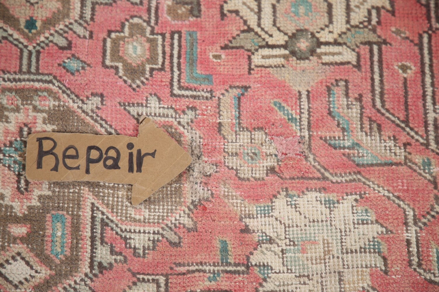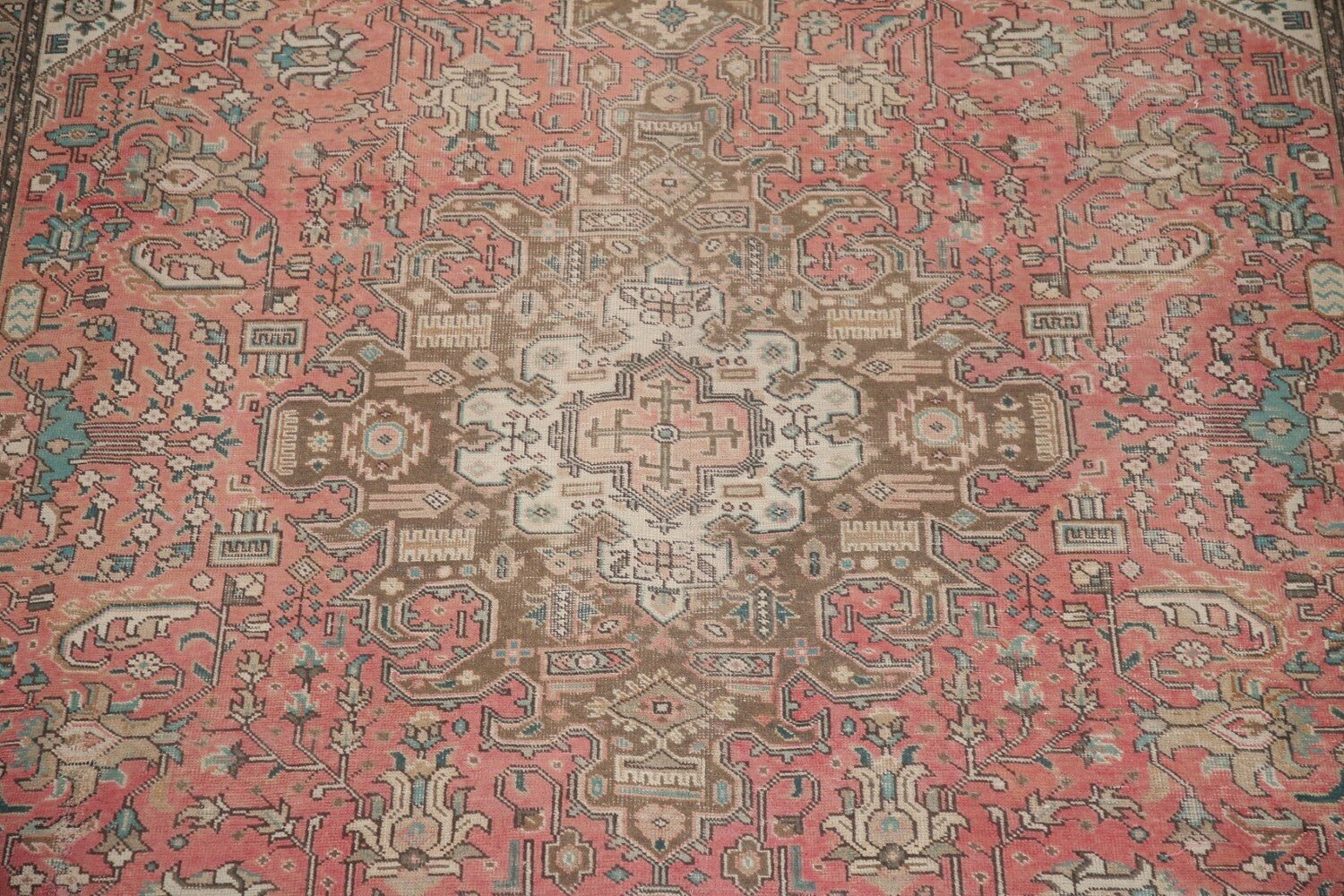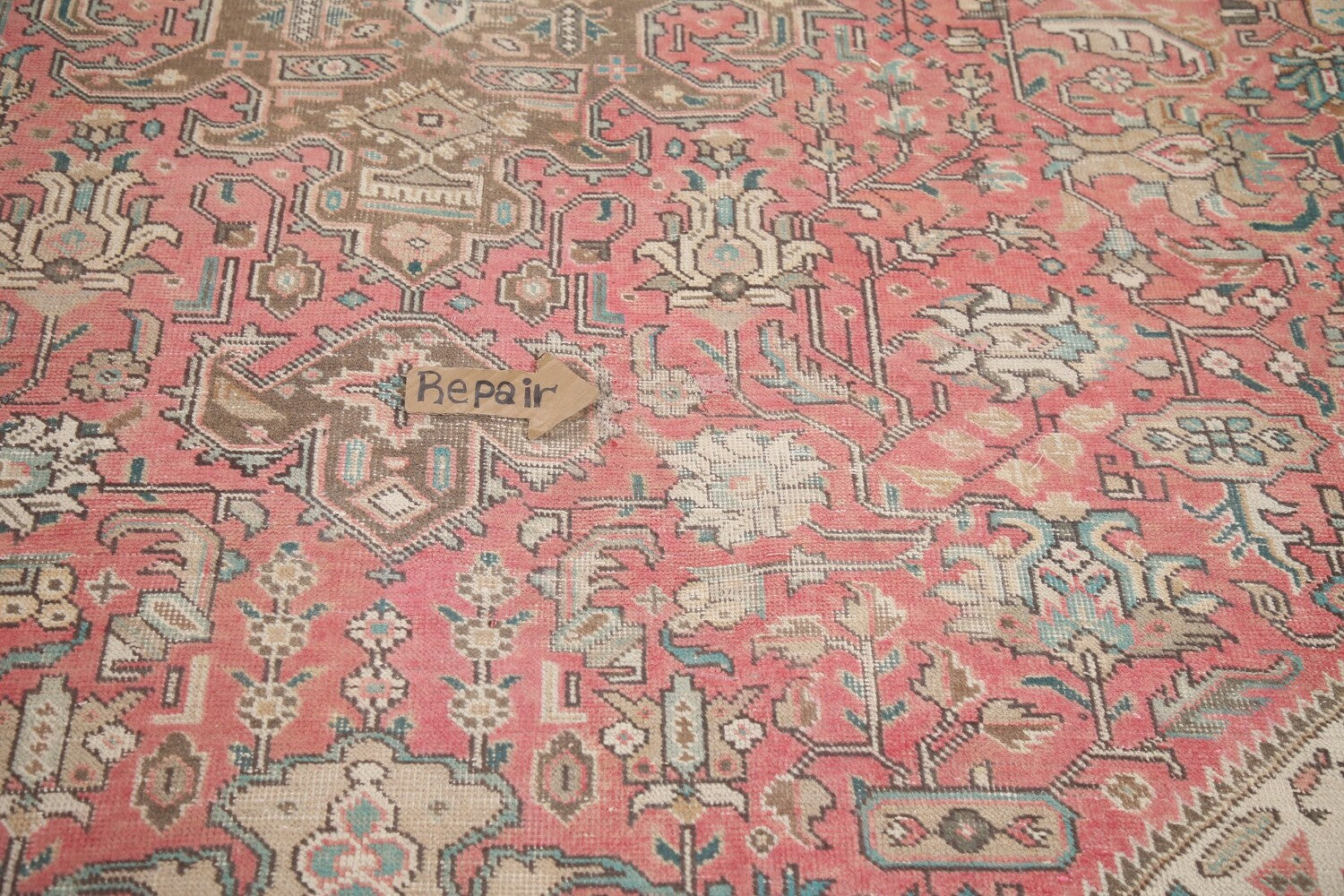 A Beautiful Genuine Persia ( Persia ) Tabriz rug is Hand Knotted by skillful weavers in Persia ( Persia ) with 100% Wool Material. This rug is in Very Good (Evenly Low Pile-Repairs) condition. dimensions are 12' 4'' X 9' 5'' in foot and 376 X 287 in centimeter. the primary color is Pink.