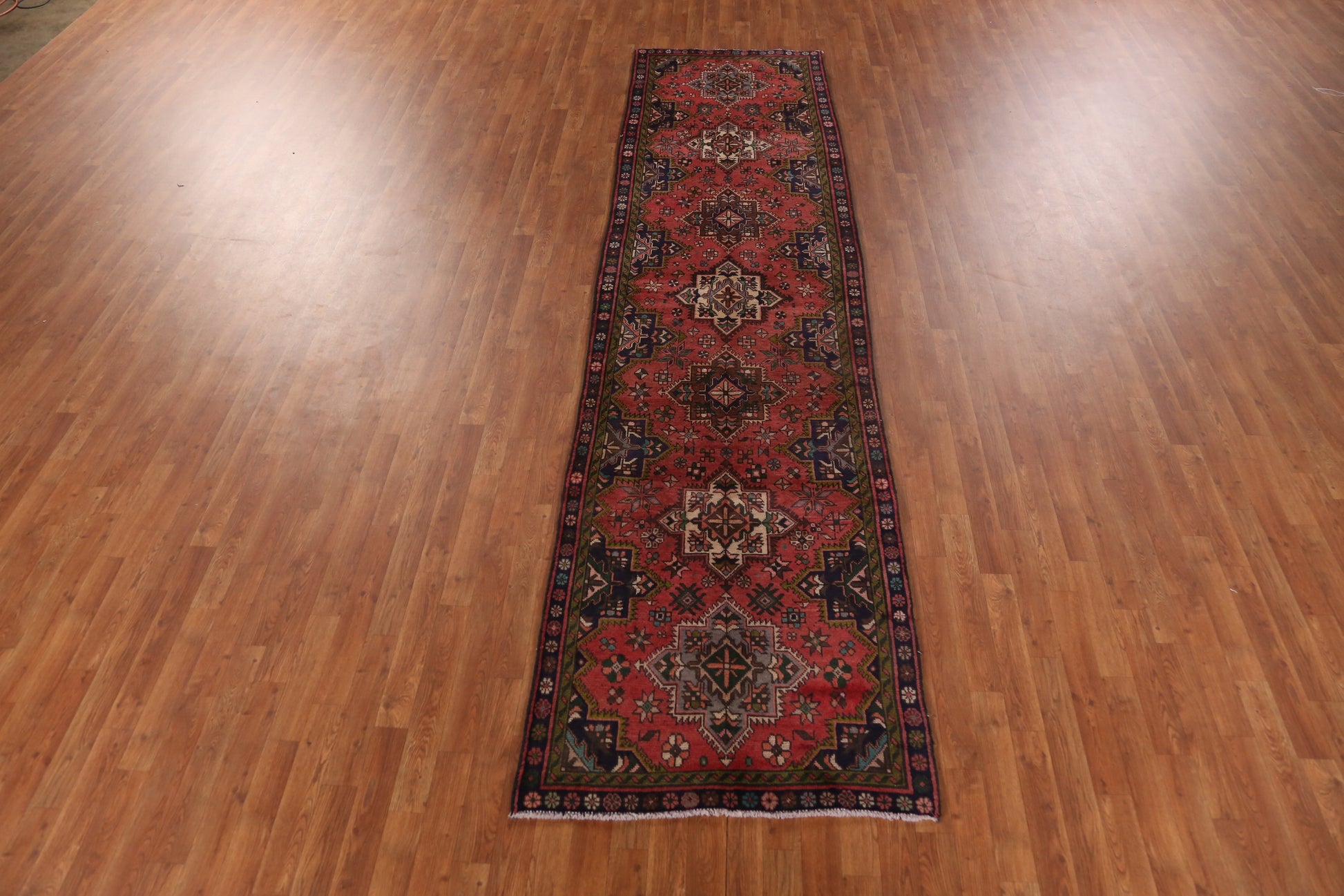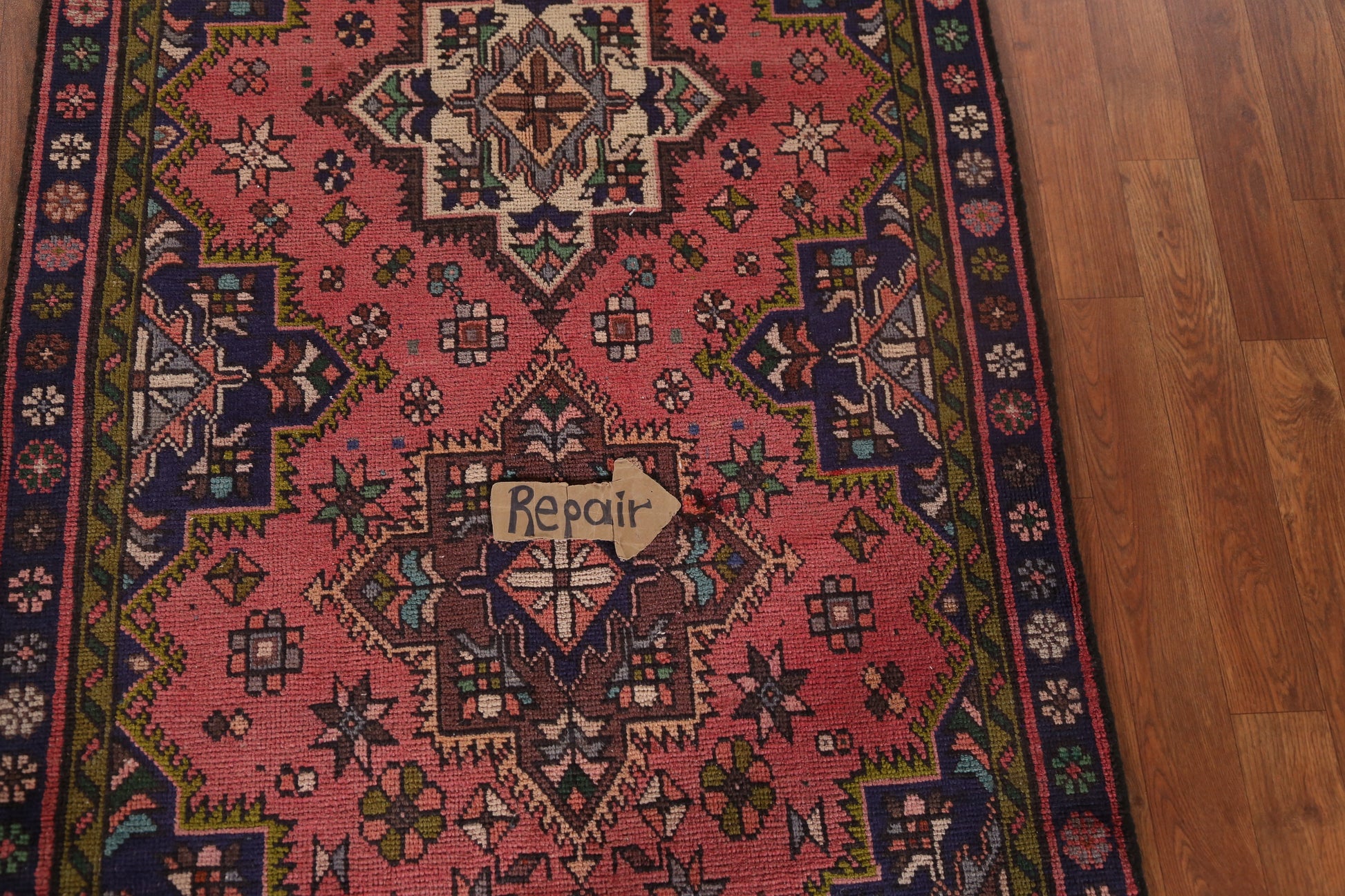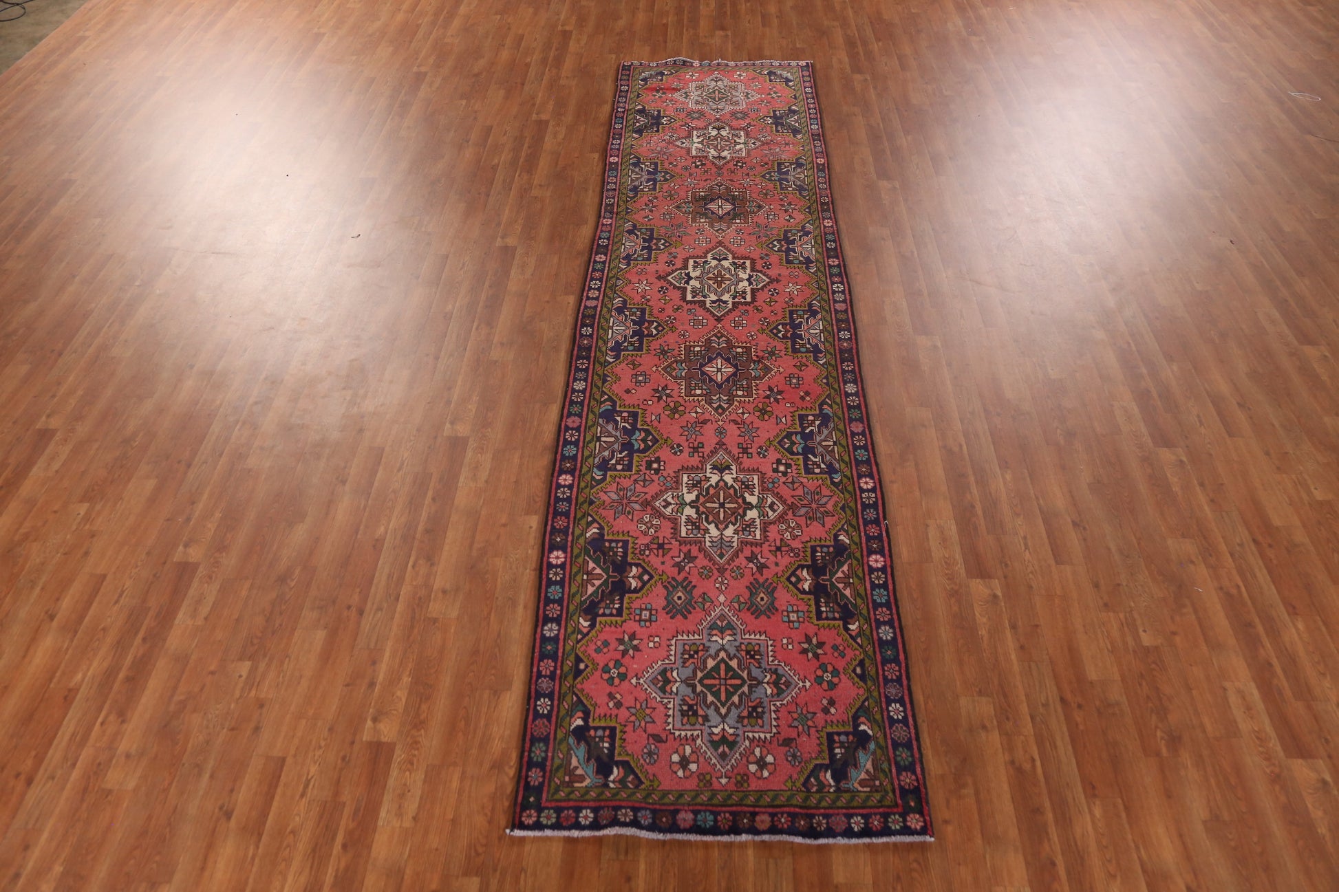 A Beautiful Genuine Persia ( Persia ) Tabriz rug is Hand Knotted by skillful weavers in Persia ( Persia ) with 100% Wool Material. This rug is in Very Good ( Low Pile- Repair) condition. dimensions are 12' 4'' X 3' 1'' in foot and 376 X 94 in centimeter. the primary color is Pink.