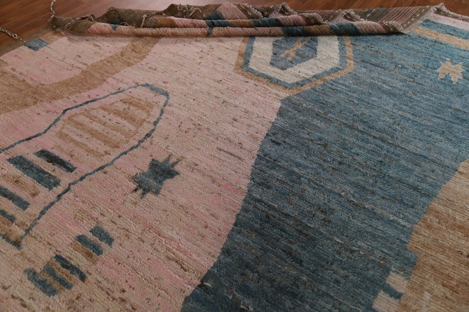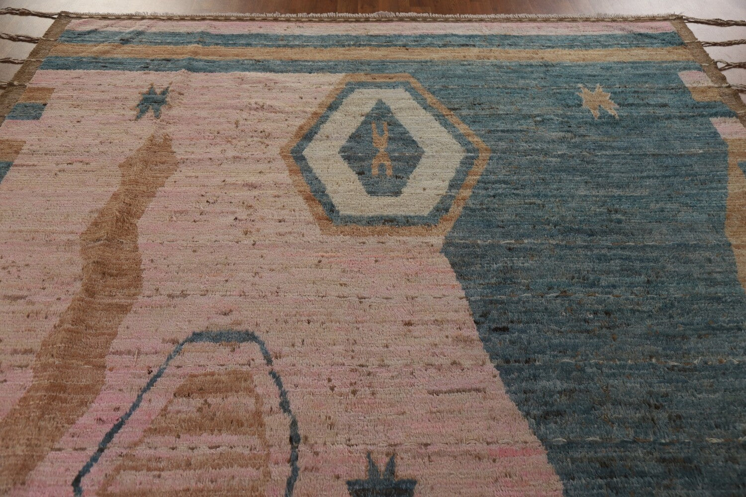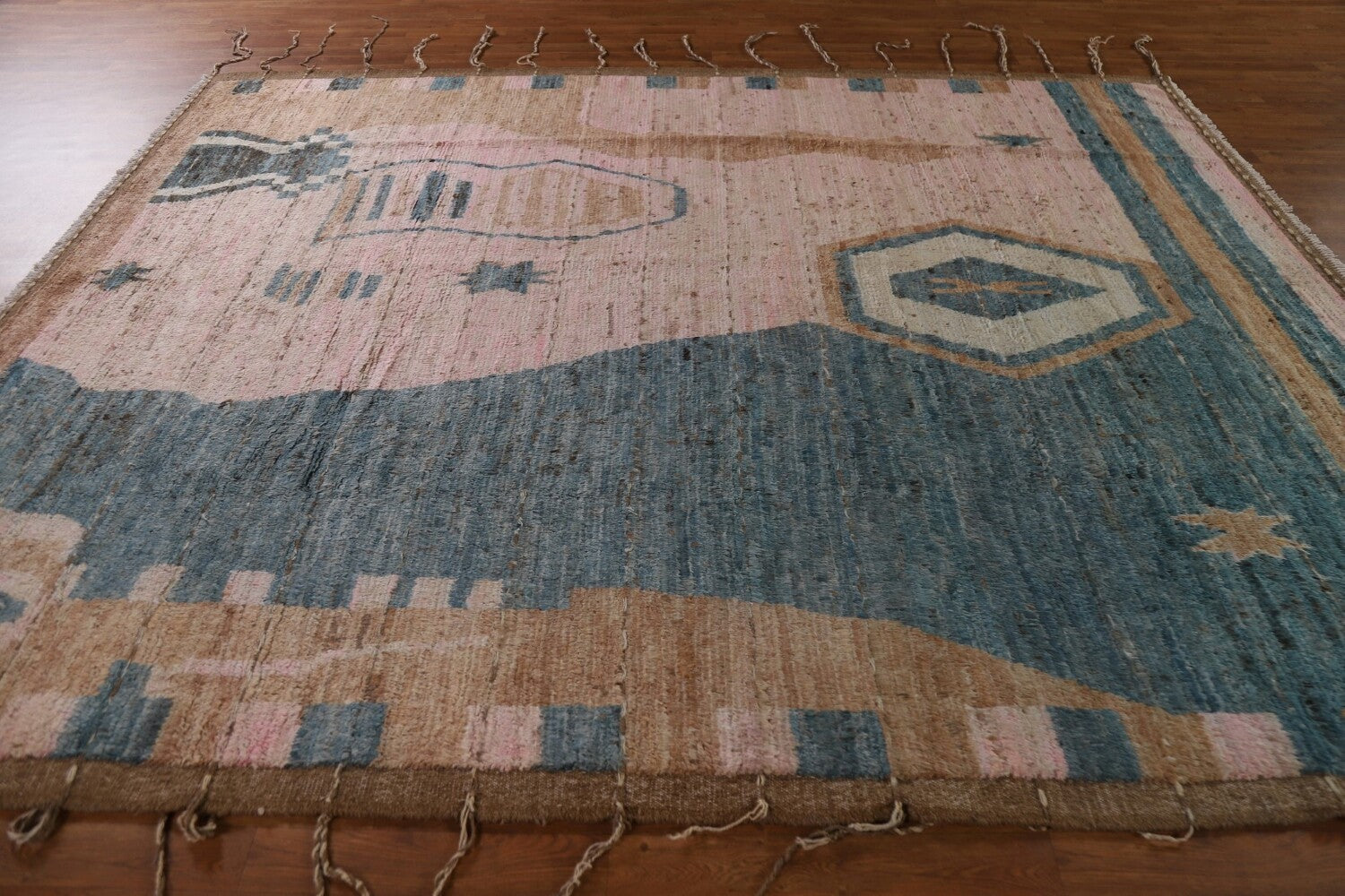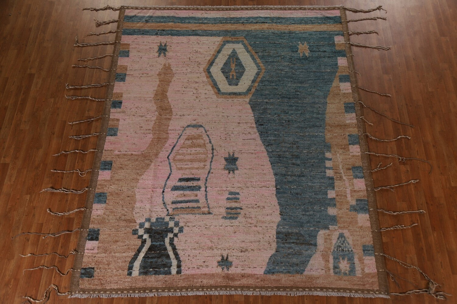 A Beautiful Genuine Pakistan Moroccan rug is Hand Knotted by skillful weavers in Pakistan with 100% Wool Material. This rug is in condition. dimensions are 9' 9'' X 8' 0'' in foot and 297 X 244 in centimeter. the primary color is Pink.