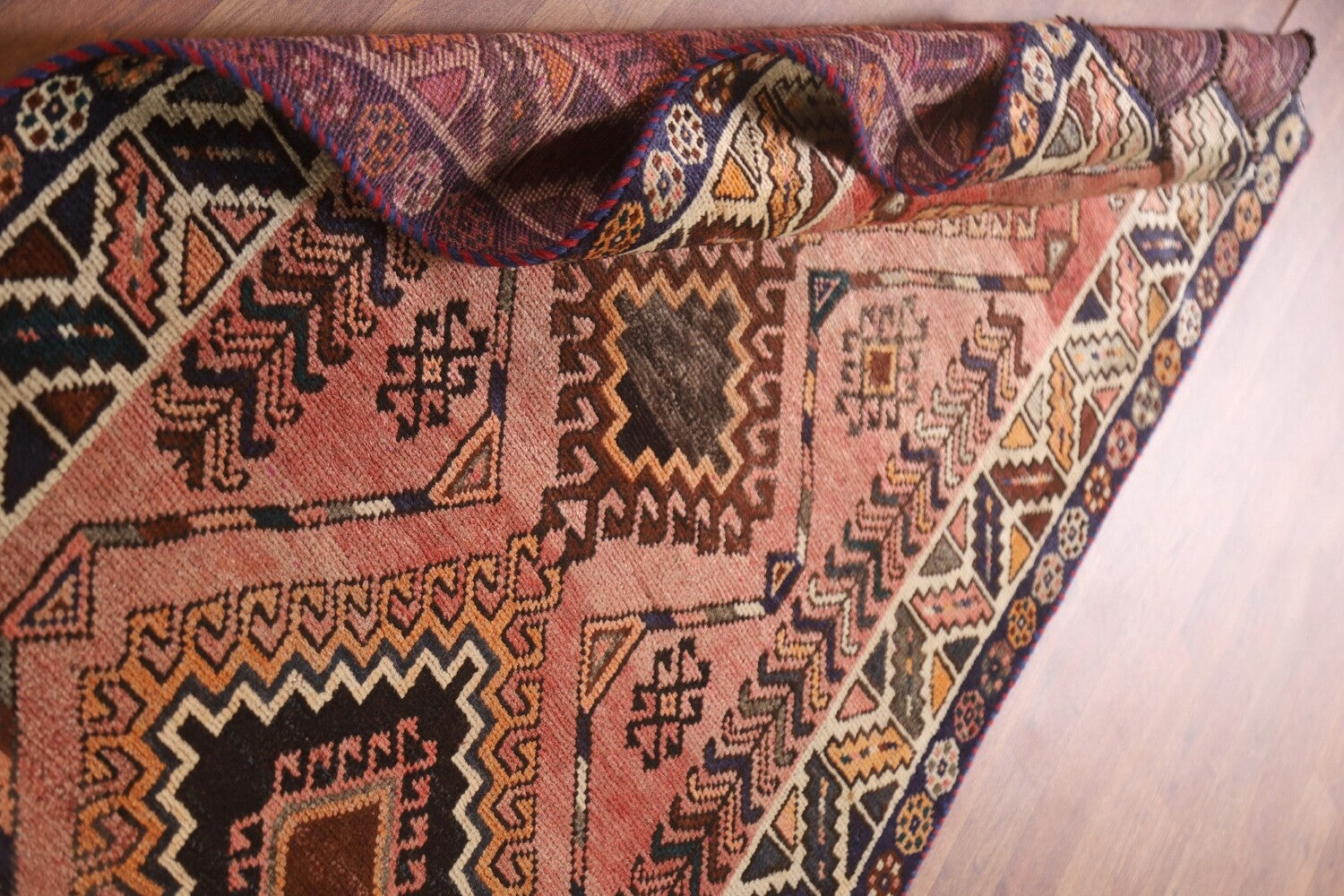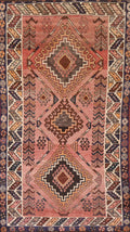 A Beautiful Genuine Persia ( Persia ) Shiraz rug is Hand Knotted by skillful weavers in Persia ( Persia ) with 100% Wool Material. This rug is in Very Good (Abrash) condition. dimensions are 6' 6'' X 3' 5'' in foot and 198 X 104 in centimeter. the primary color is Pink.